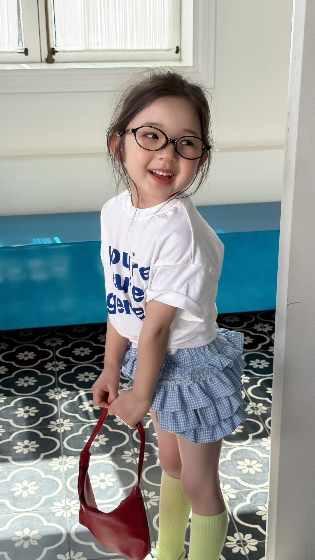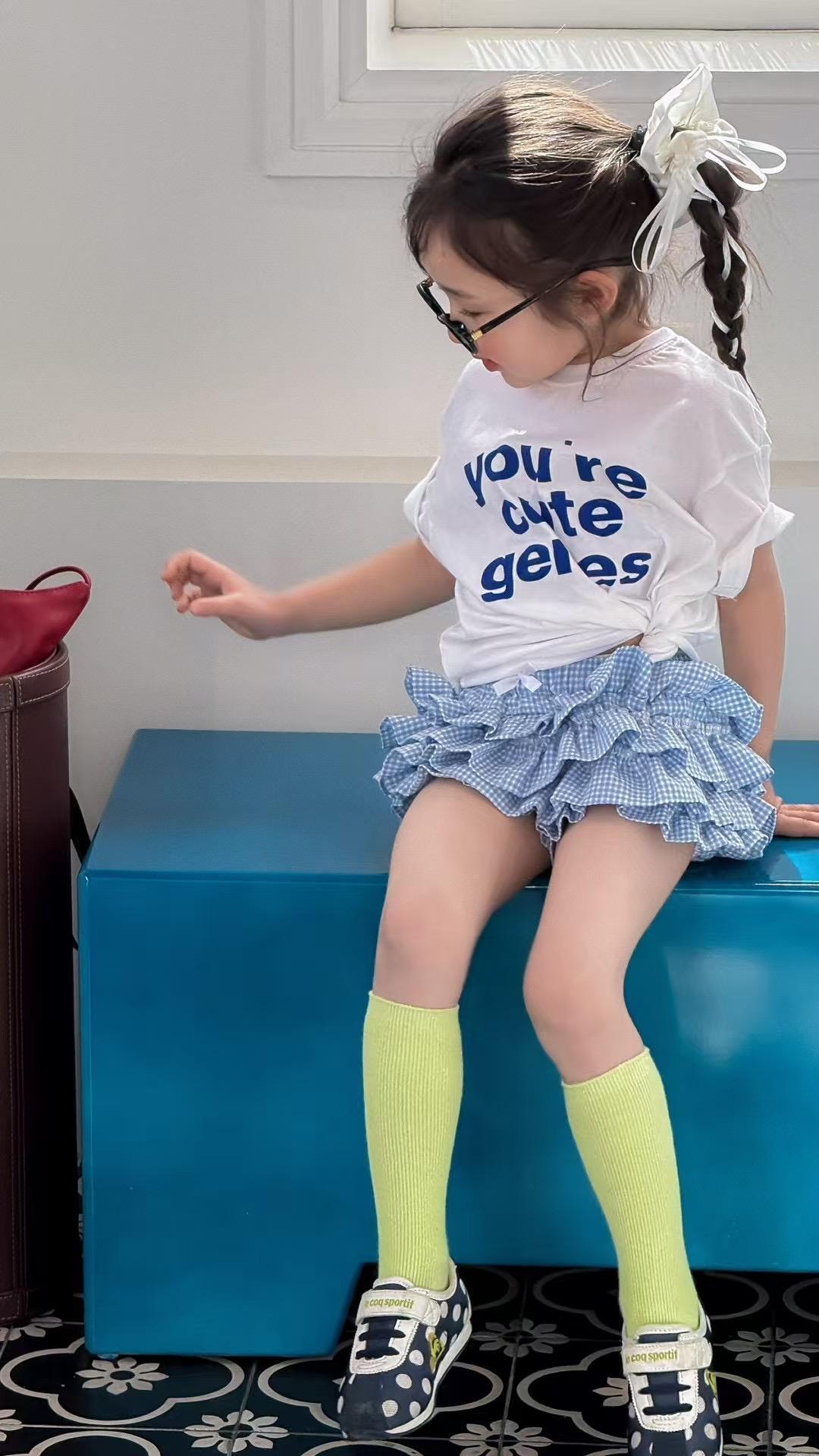 소녀의 여름 인쇄 된 편지 티셔츠 탑 Ins 라운드 넥 짧은 소매 스타일 체크 무늬 케이크 스커트 세트스토어 가기