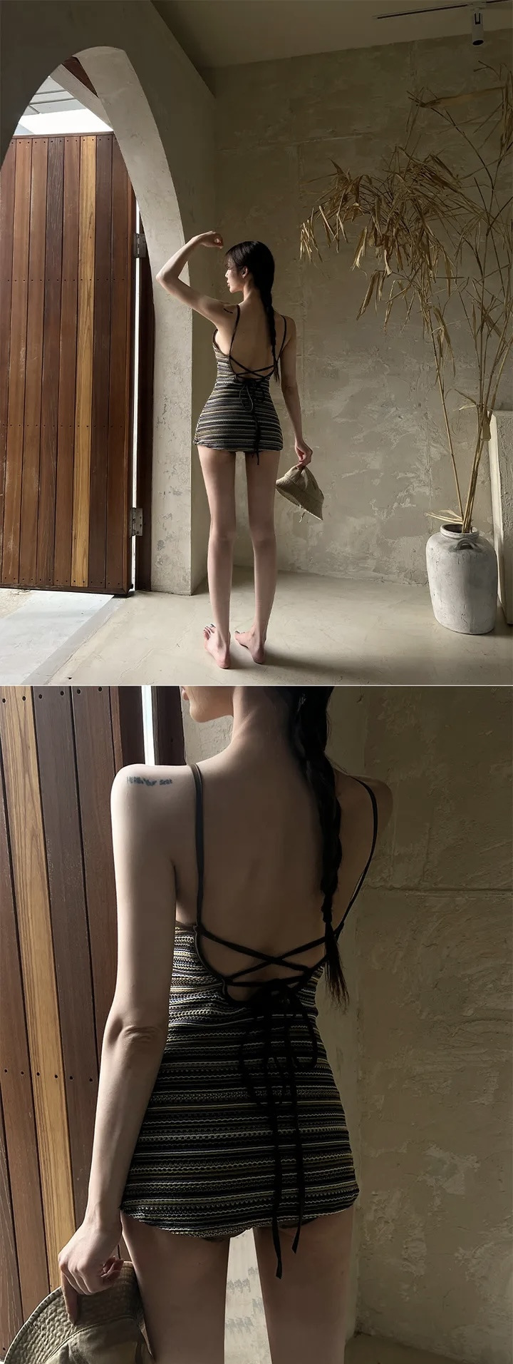 2026 한국 스타일 백리스 원피스 수영복 여성 온천 휴양지 스타일 컷아웃 비키니 섹시 스트라이프 끈 비키니