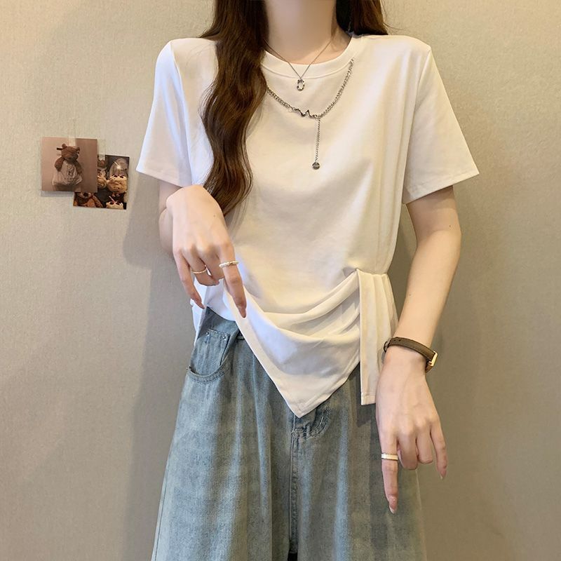 통통녀 디자인 센스 니쉬 슬리밍 티셔츠 반팔 여름 플러스 사이즈 여성 의류 서양식 나이 감소 배꼽 커버 칙 탑