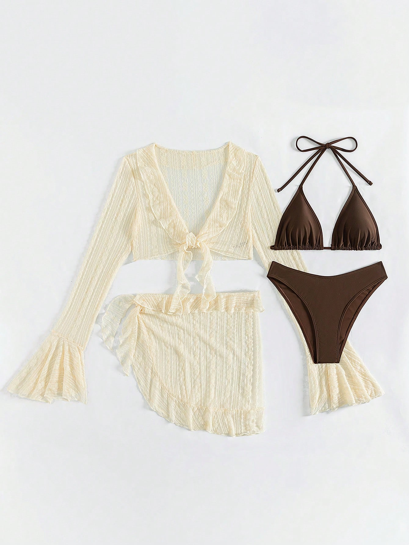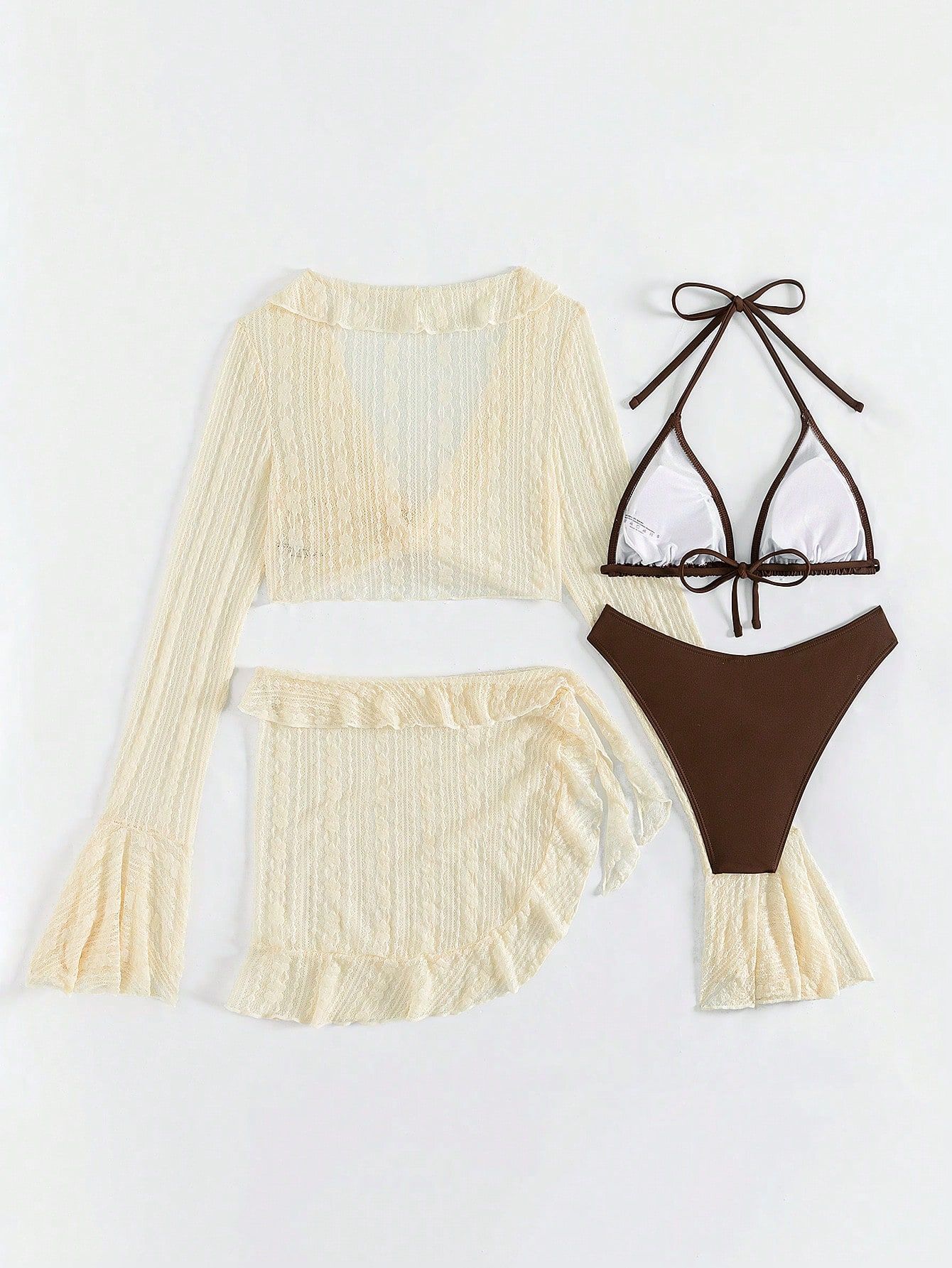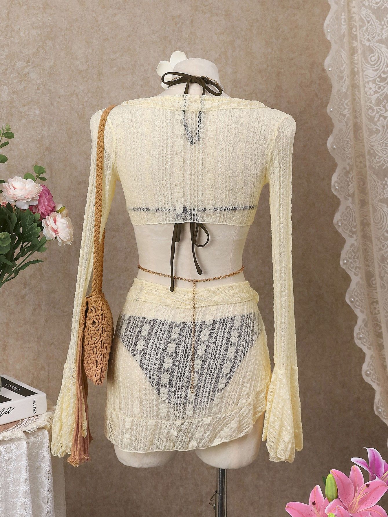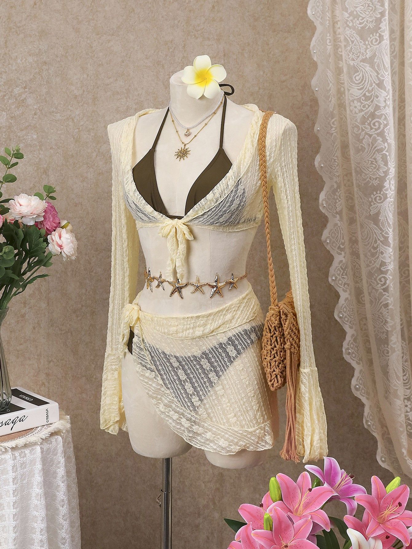 2025 국경 새로운 유럽 및 미국 메쉬 긴팔 블라우스 수영복 비치 비키니 분할 수영복 여성 4 종 세트