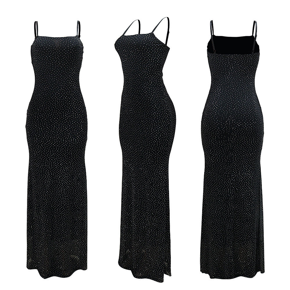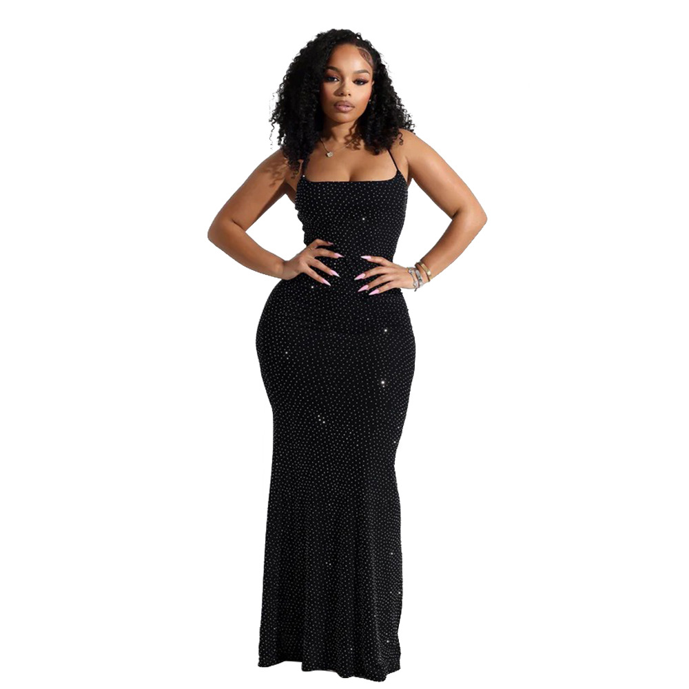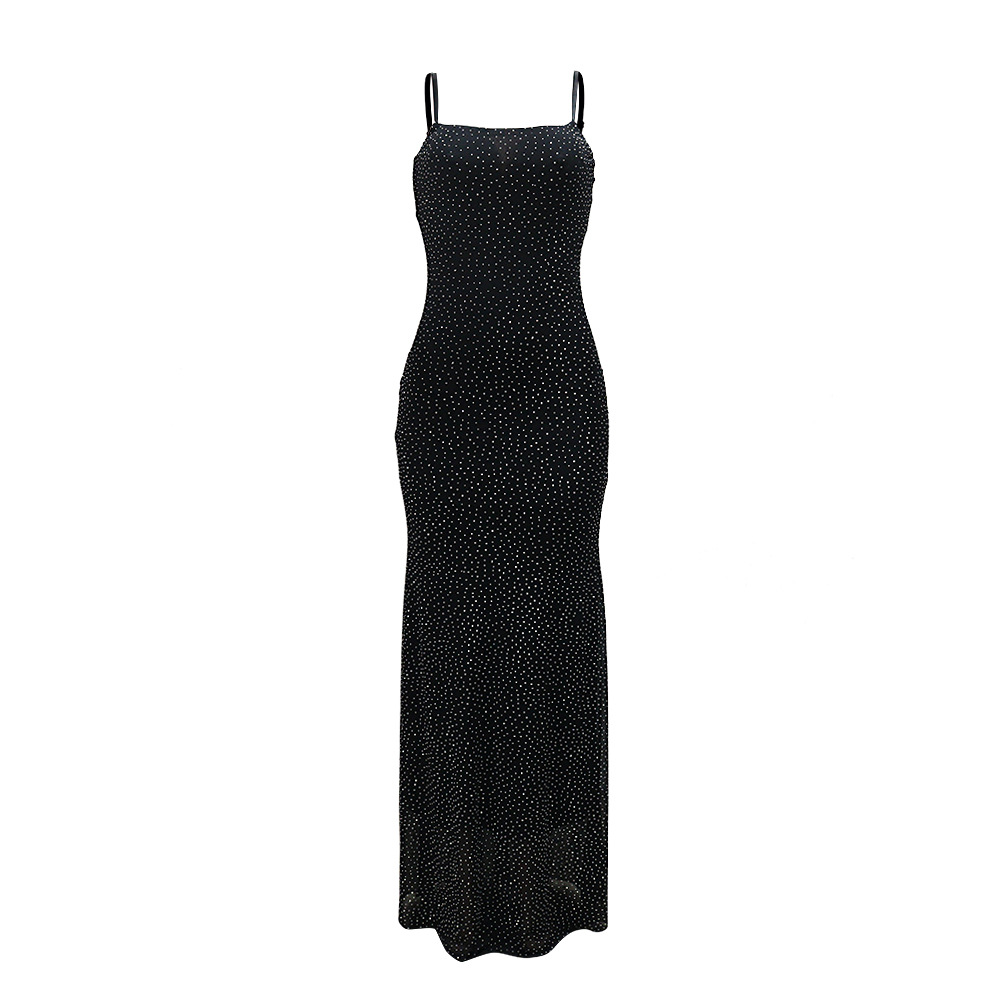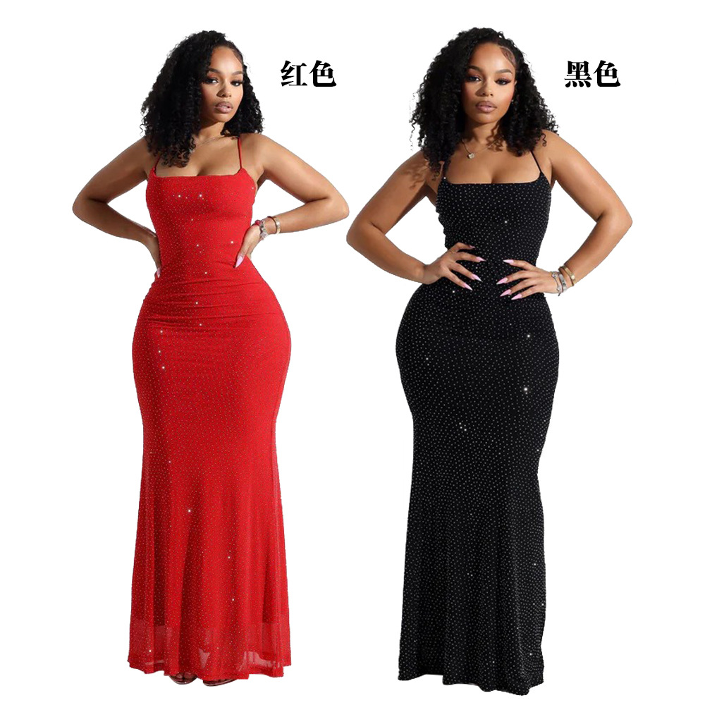 CY901715 유럽과 미국의 아마존 대외 무역 새로운 섹시한 서스펜더 핫 다이아몬드 폴리 에스터 메쉬 드레스 여성용 힙 커버 롱 스커트