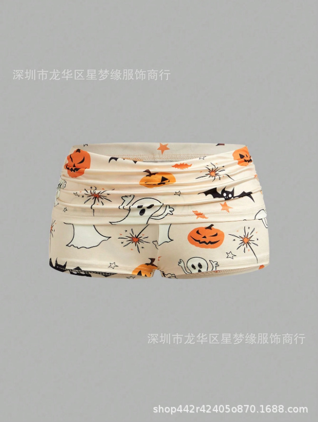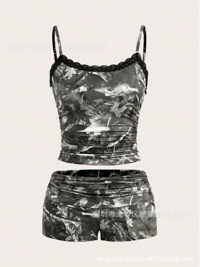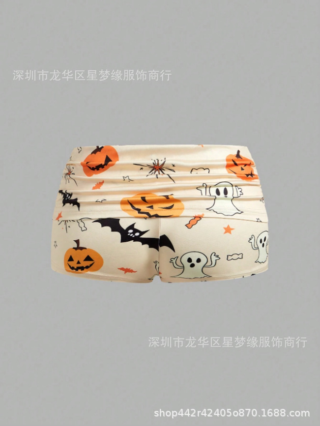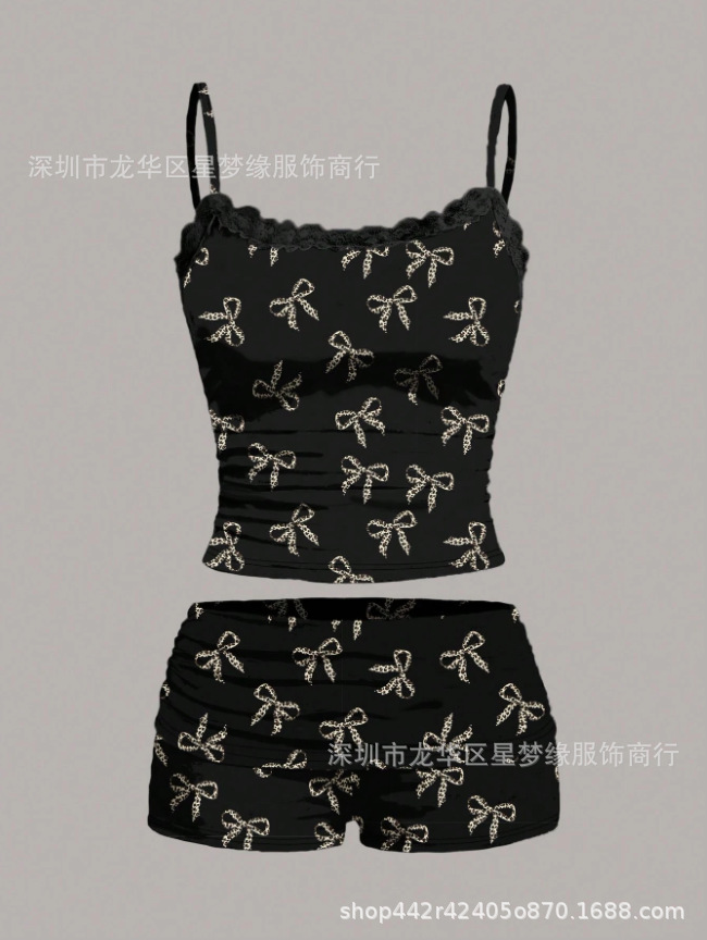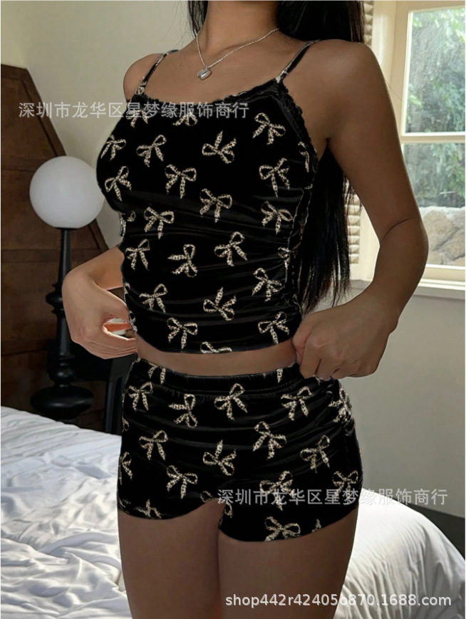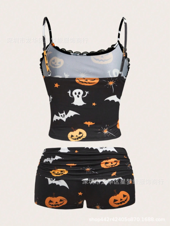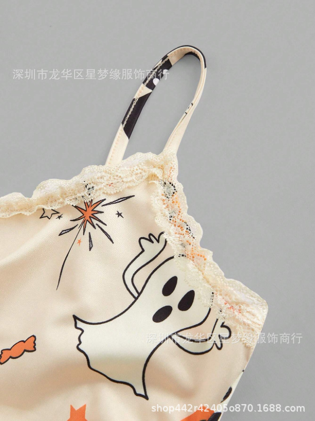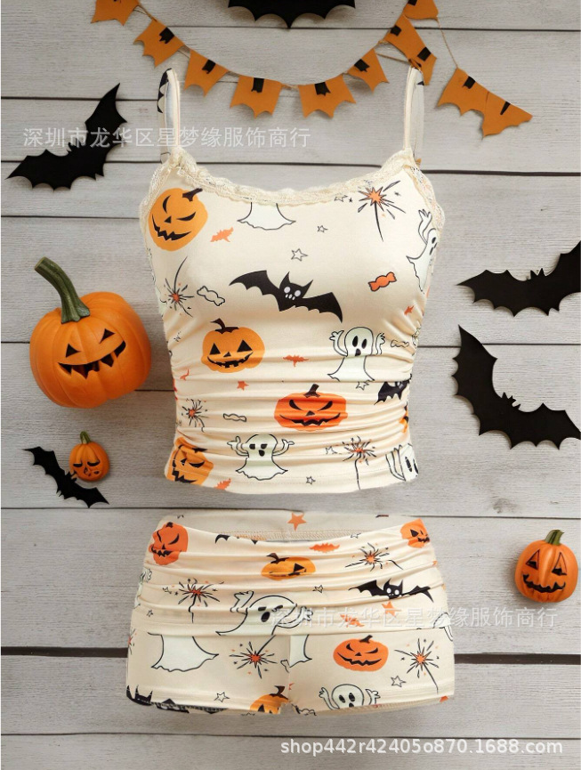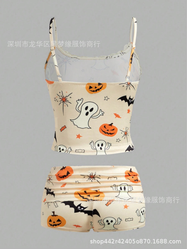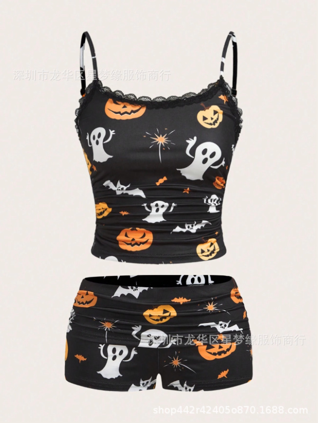유럽과 미국의 스타일 V 넥 레이스 파자마 여성 세트 여름 새로운 하이 엔드 할로윈 인쇄 홈 의류 투피스 세트