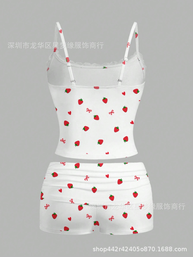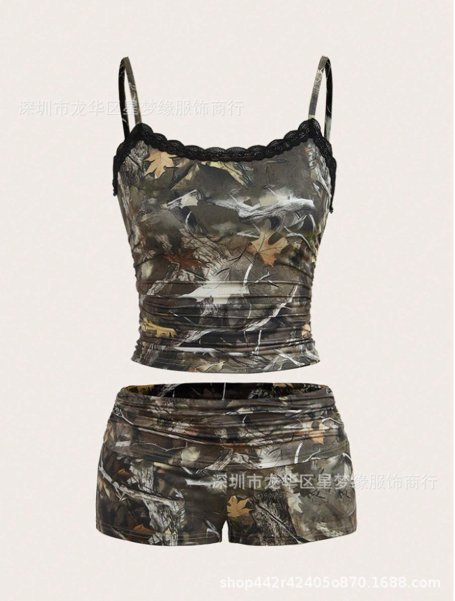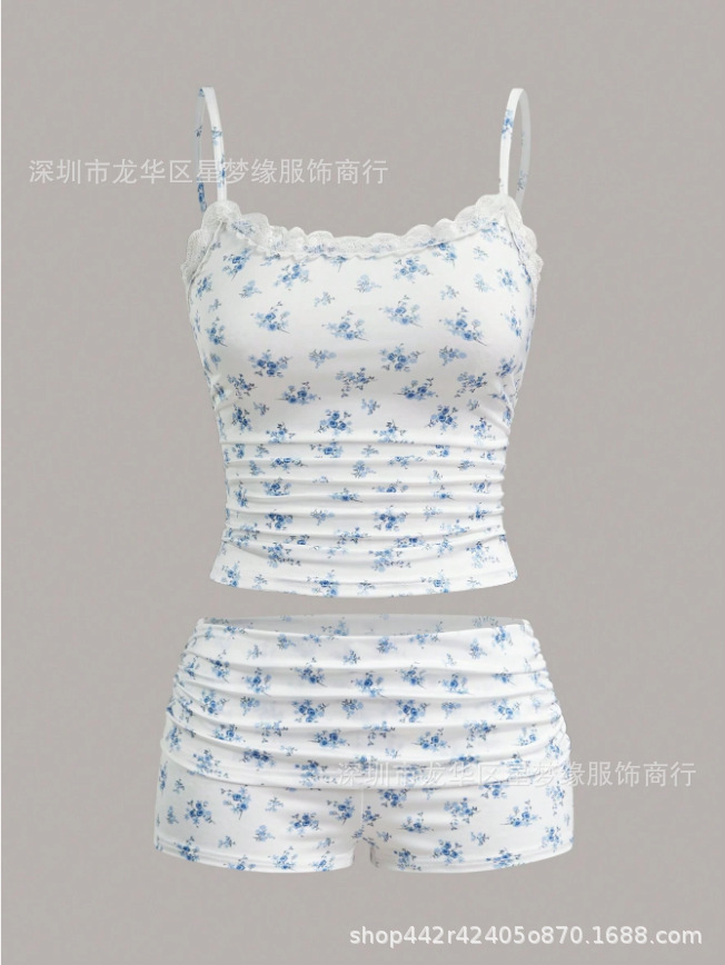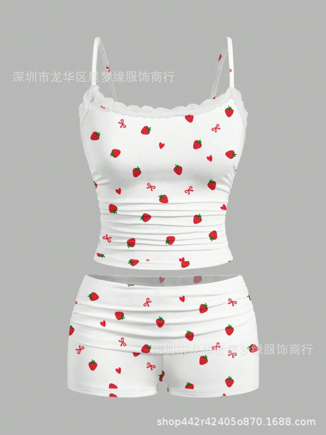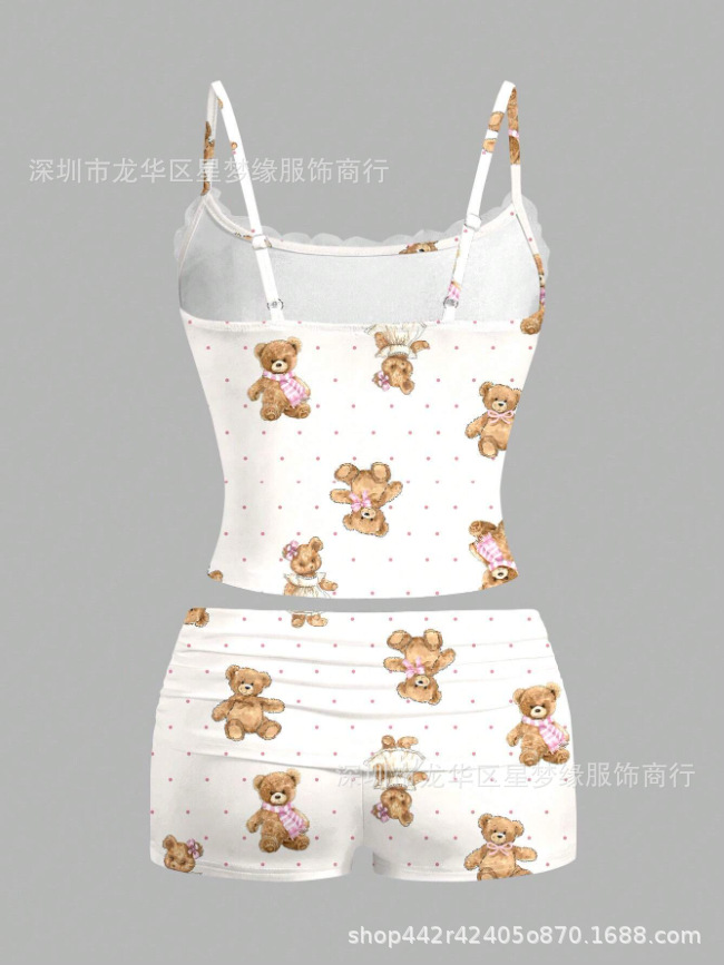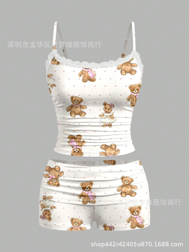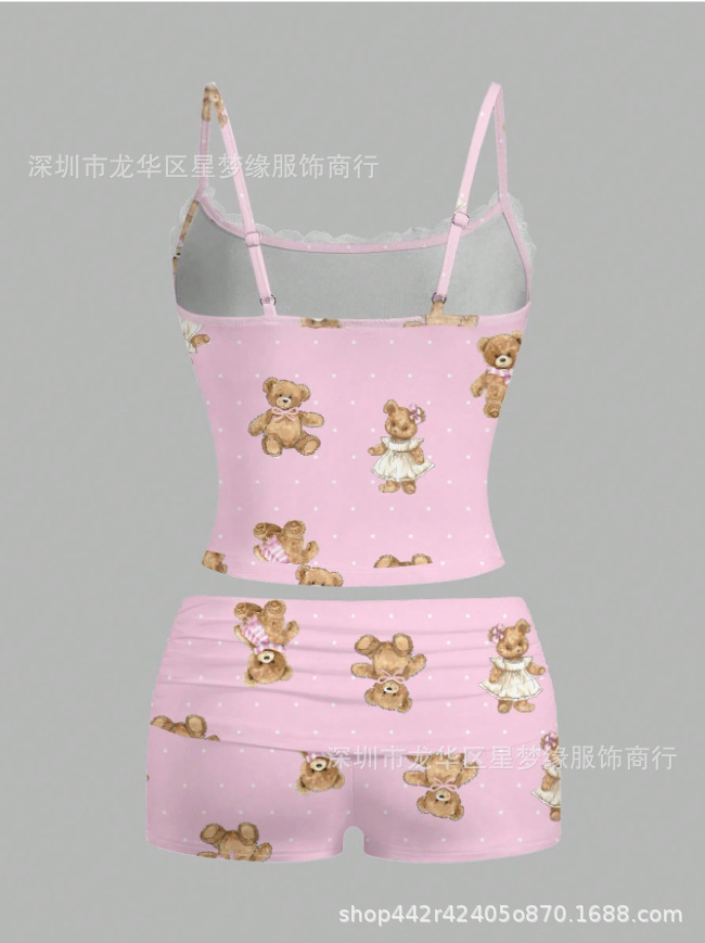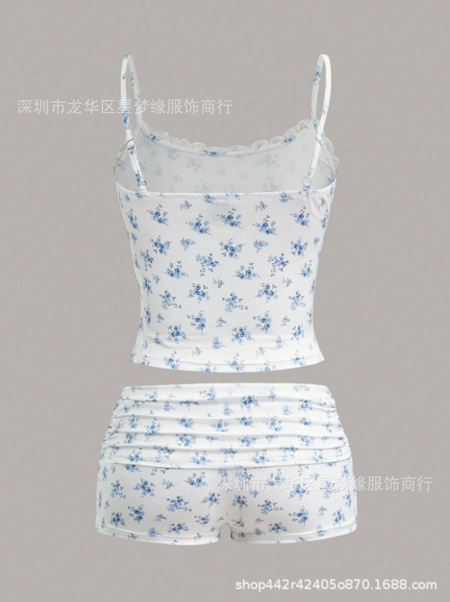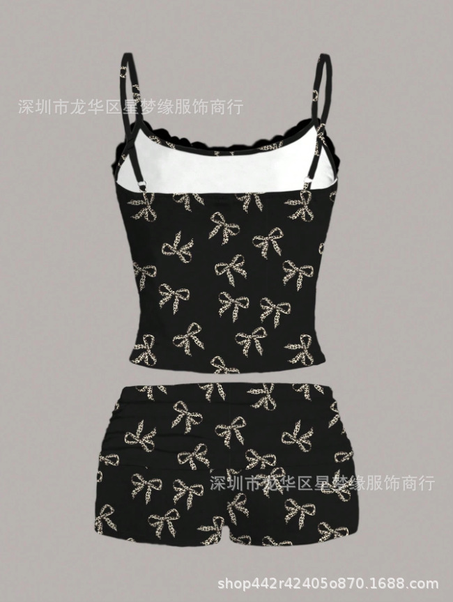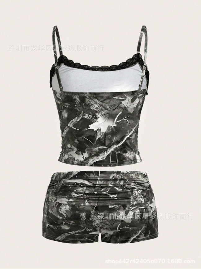 유럽과 미국의 스타일 V 넥 레이스 파자마 여성 세트 여름 새로운 하이 엔드 할로윈 인쇄 홈 의류 투피스 세트