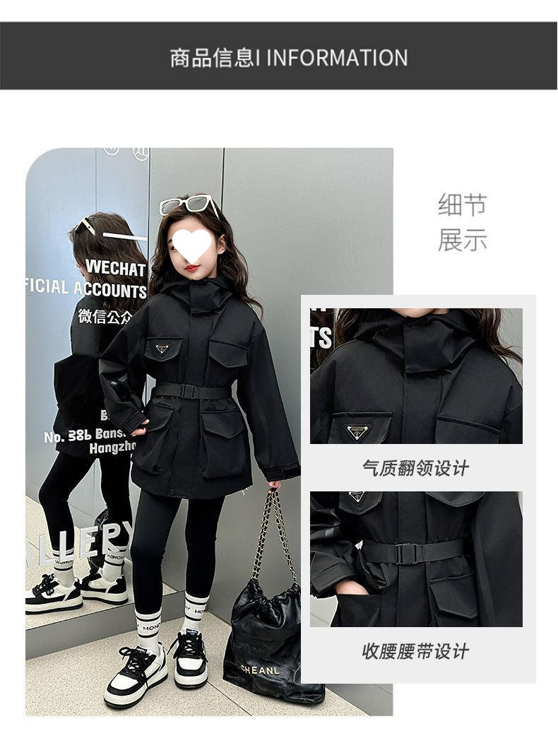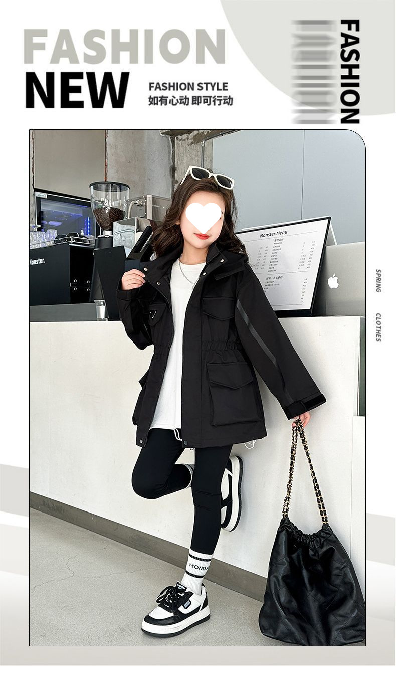 여아 코트 봄, 가을 2025 새로운 스타일 어린이 여아 봄 의류 중간 길이 스트리트 후드 허리 윈드 브레이커스토어 가기