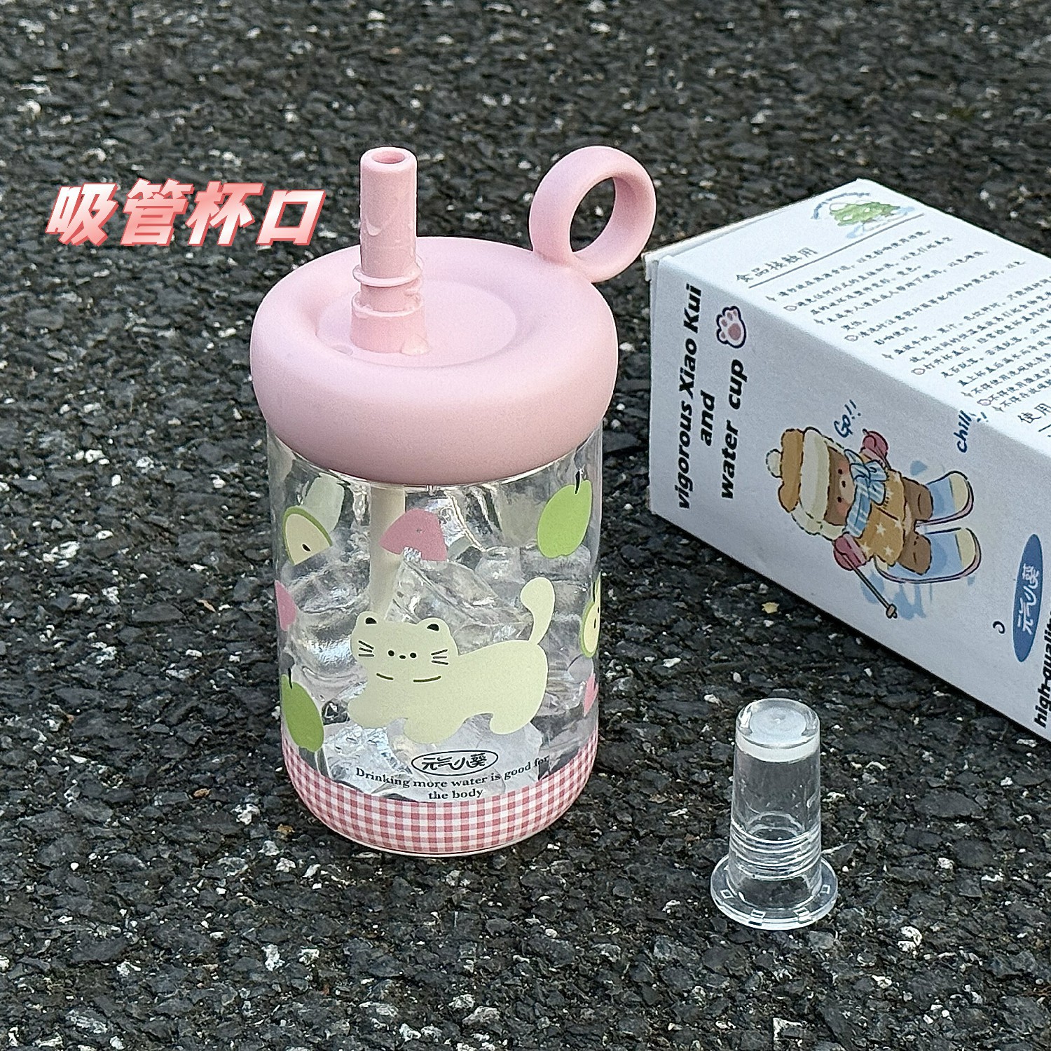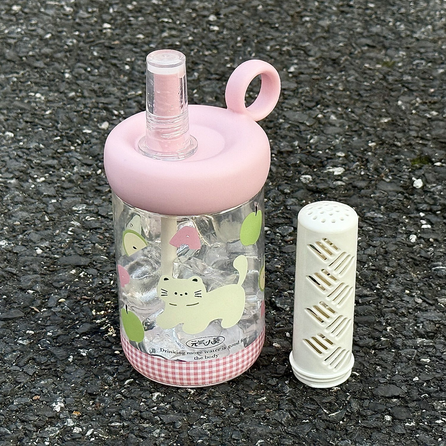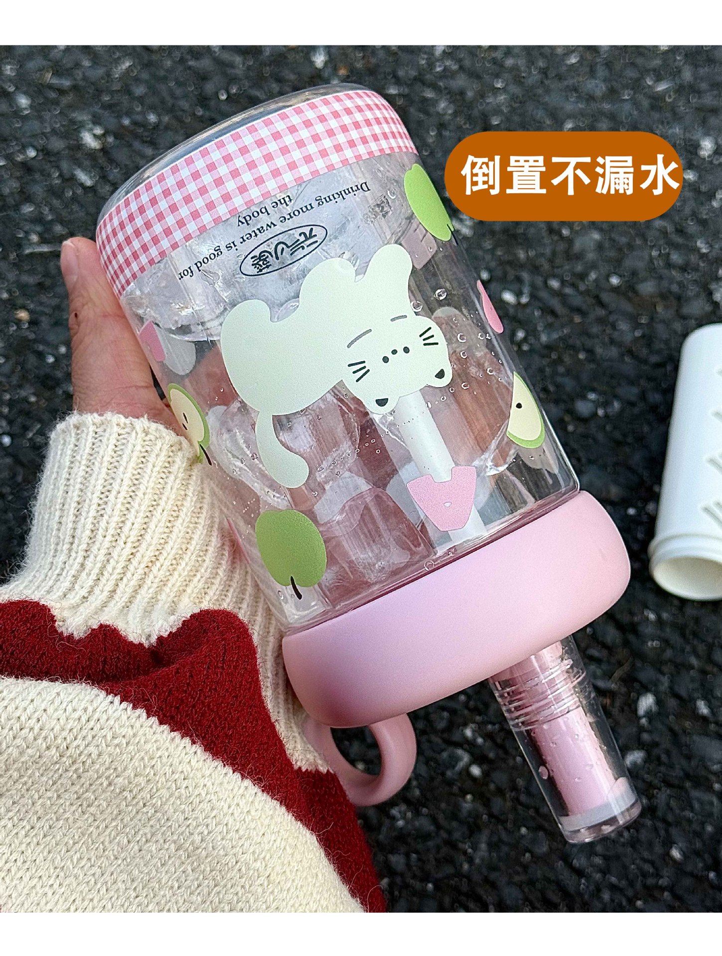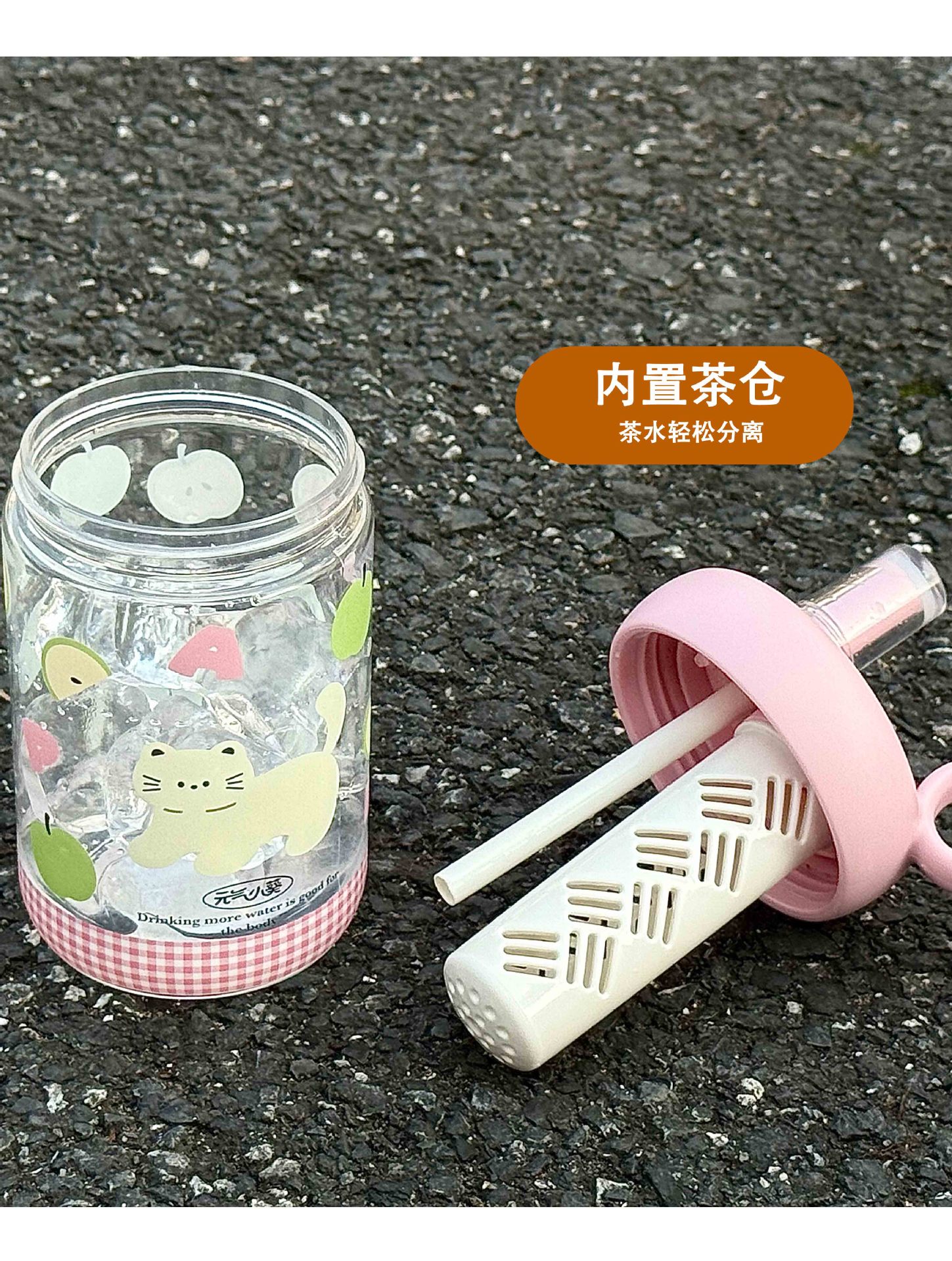 • 링향차 플라스틱컵/핑크 [600ML] - 핑크사과문자 고양이그림