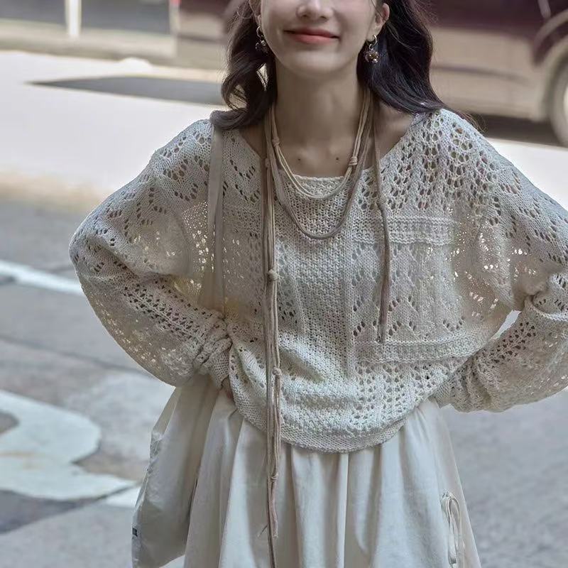 살구색 할로우 아웃 니트 스웨터 여성용 봄 한국식 분위기 기질 슈퍼 멋져 보이는 부드러운 독특한 탑 선 스크린 에어컨스토어 가기