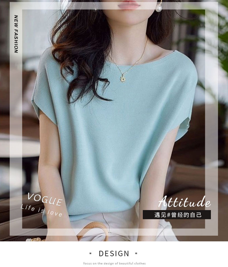아이스 실크 스웨터 반팔 티셔츠 여성용 얇은 2024 새로운 여름 라운드 넥 느슨한 박쥐 소매 웨스턴 스타일 탑스토어 가기