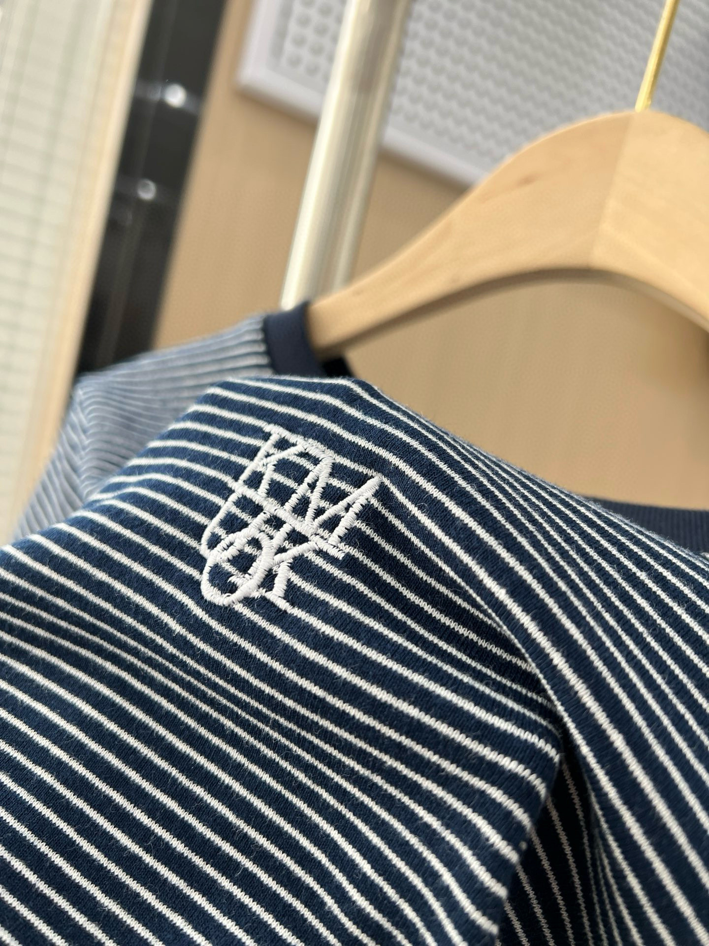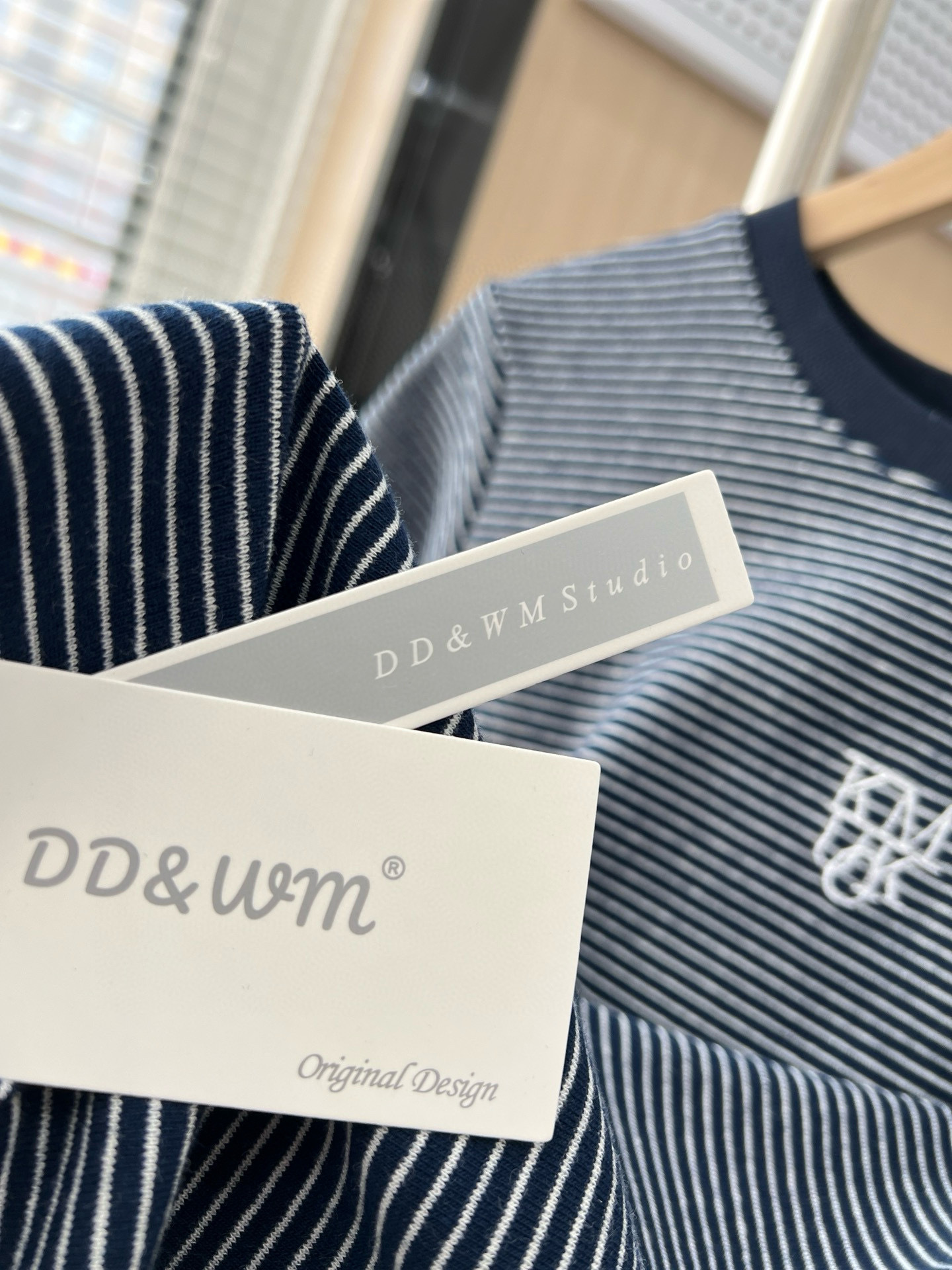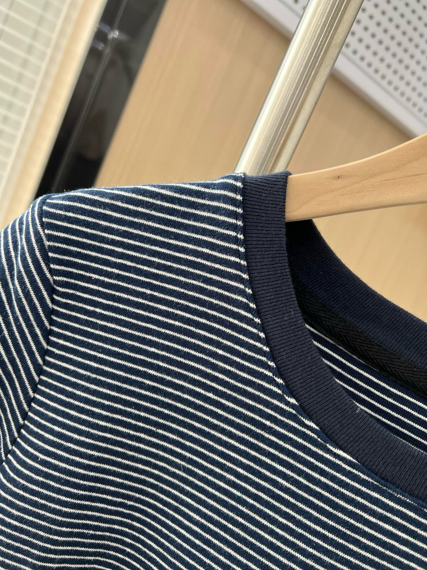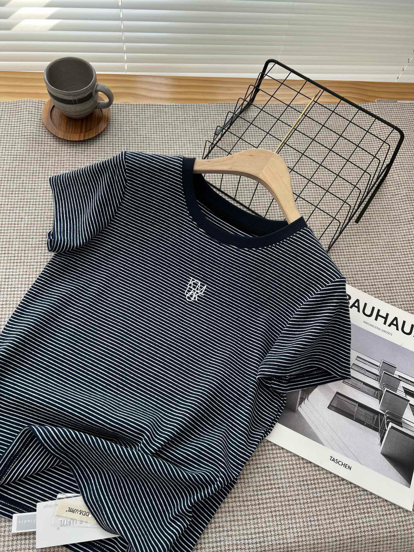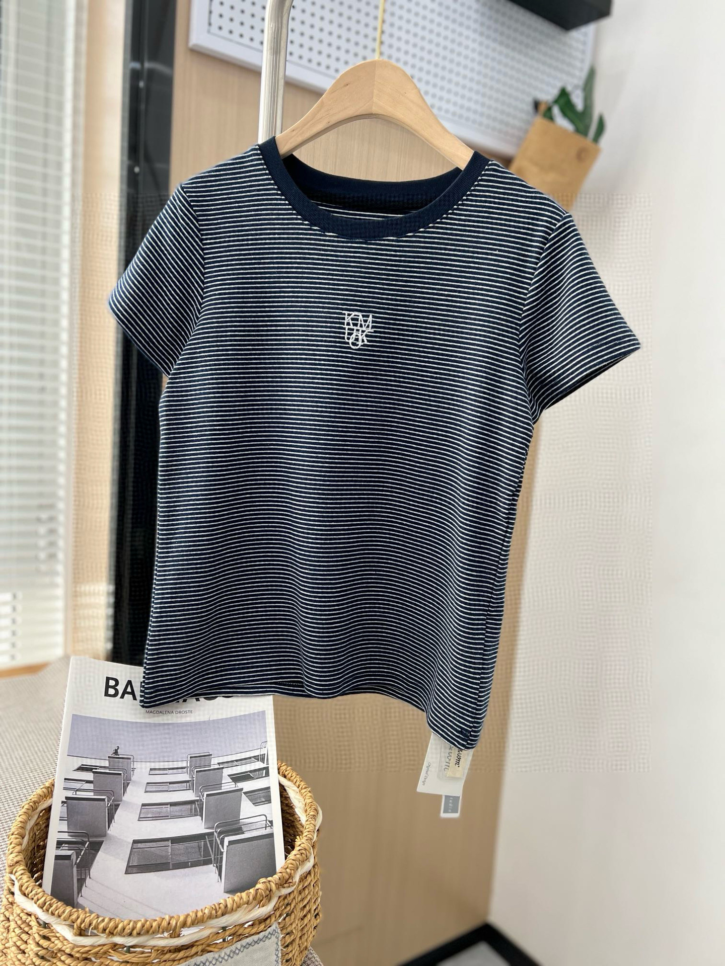 2025 봄 패션 슬리밍 좁은 줄무늬 티셔츠 여성용 짧은 어깨 파란색 자수 편지 짧은 소매스토어 가기
