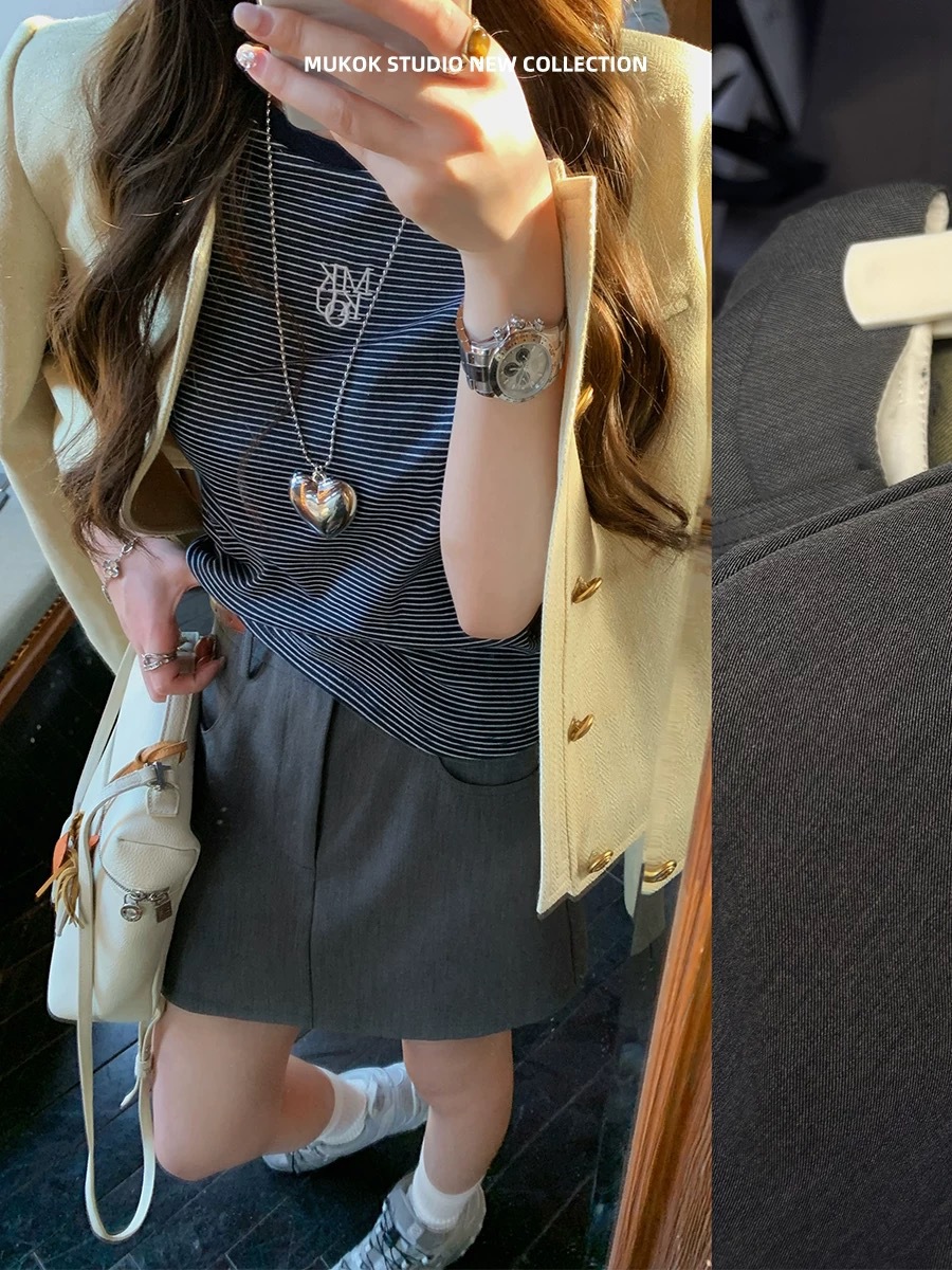 2025 봄 패션 슬리밍 좁은 줄무늬 티셔츠 여성용 짧은 어깨 파란색 자수 편지 짧은 소매