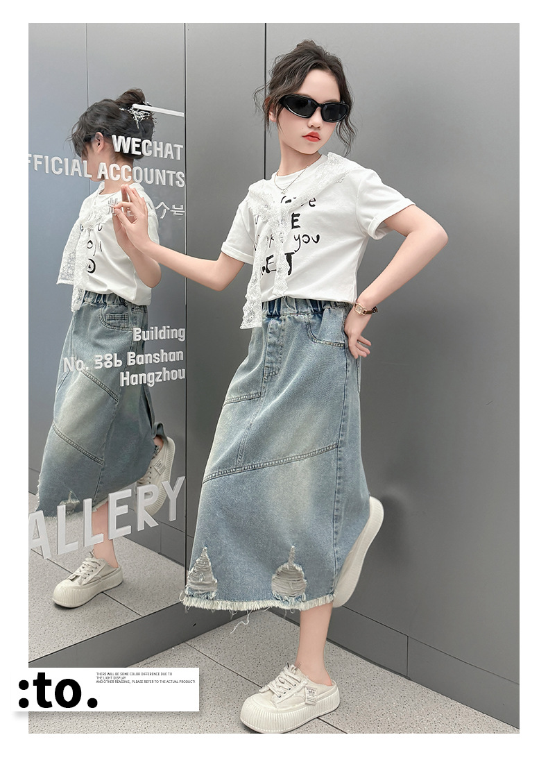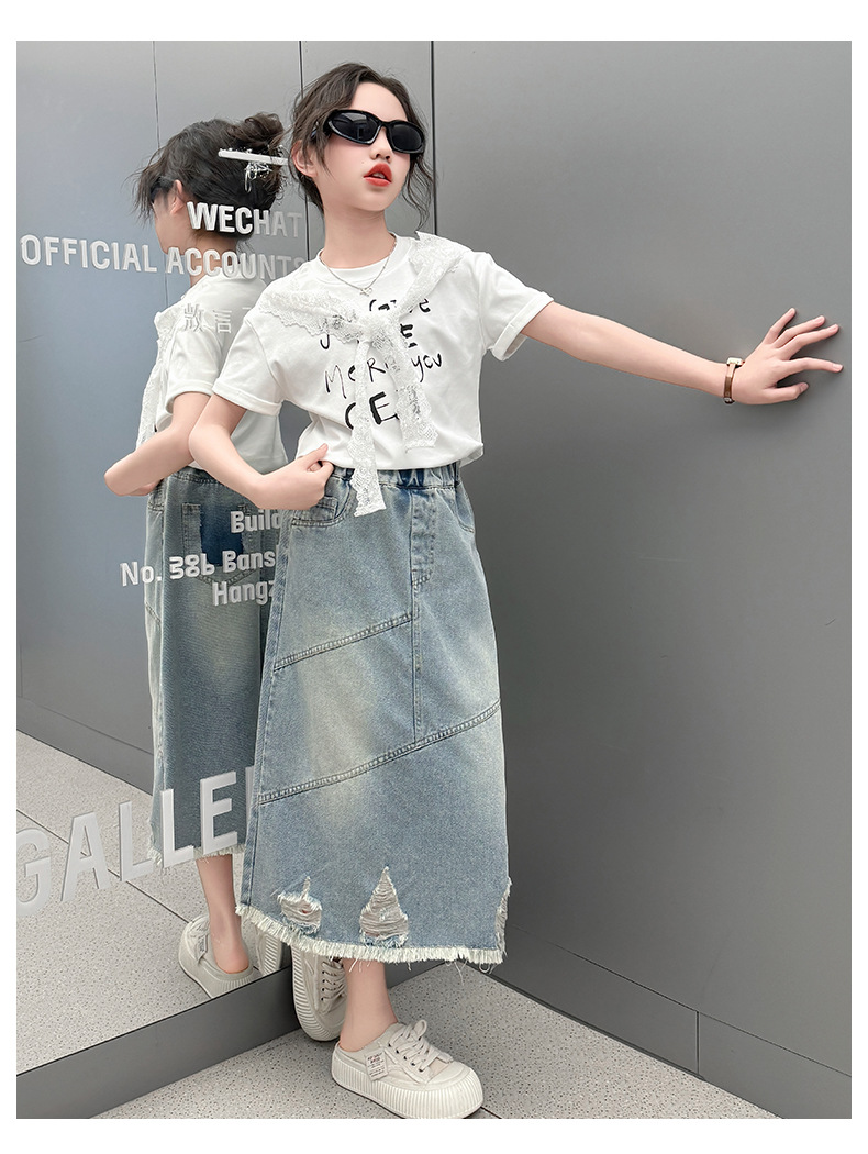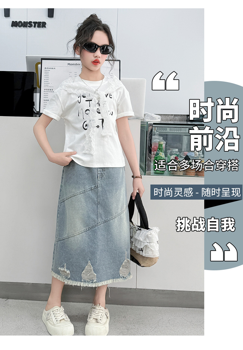 여자 복고풍 찢어진 데님 스커트 여성 여름 정장 하이 웨이스트 루즈 슬리밍 중간 길이 스커트 문자 티셔츠스토어 가기
