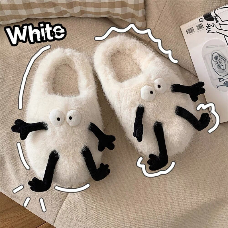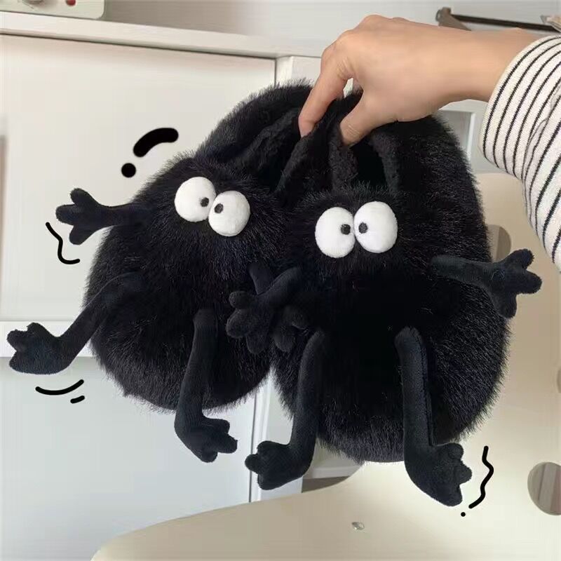 겨울 집에서 여성을 위한 커플 귀엽고 재미있는 검은색 모피 볼 면 슬리퍼, 미끄럼 방지, 맞춤형 따뜻한 발가락 부드러운 밑창 신발