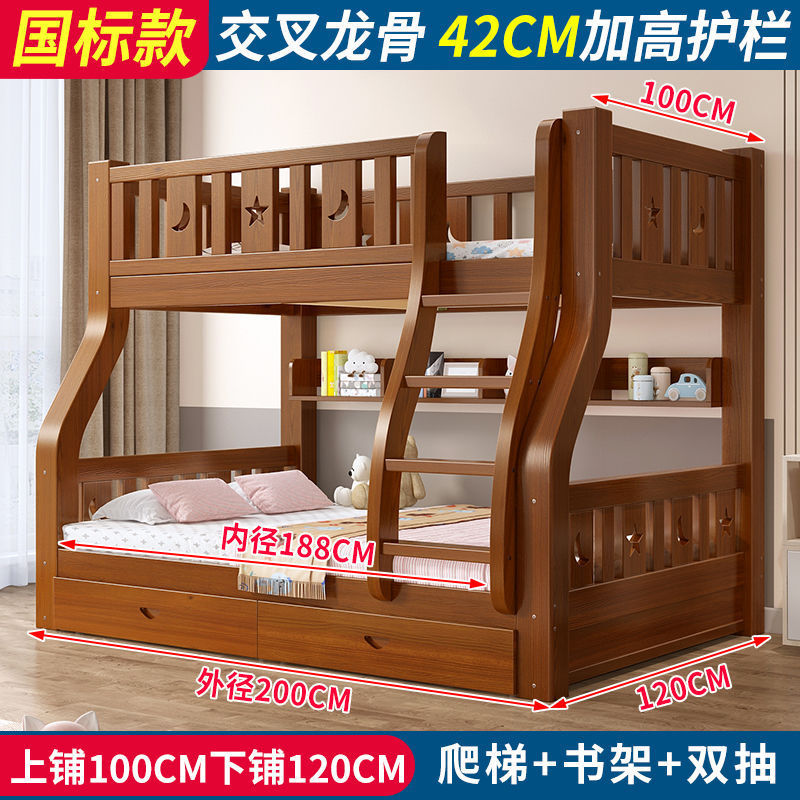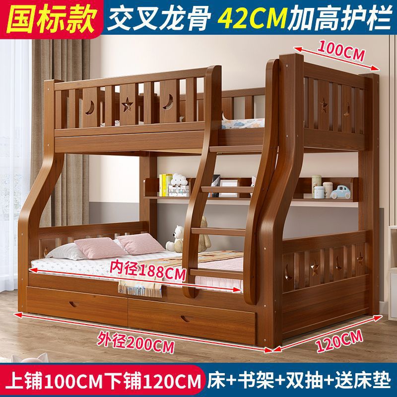 • 브라운 침대 + 더블 서랍 + 매트리스 - 상단 침대 폭 100cm/하단 침대 120cm (모두 원목)