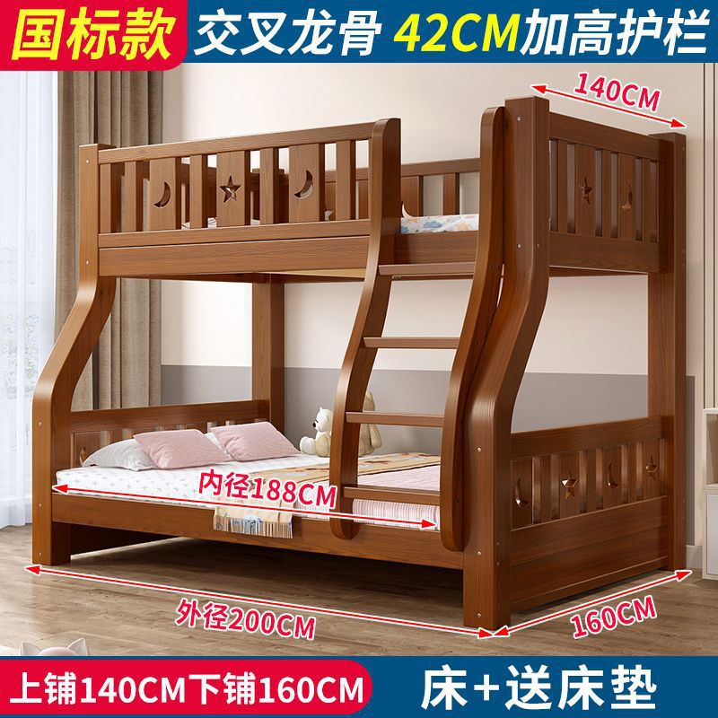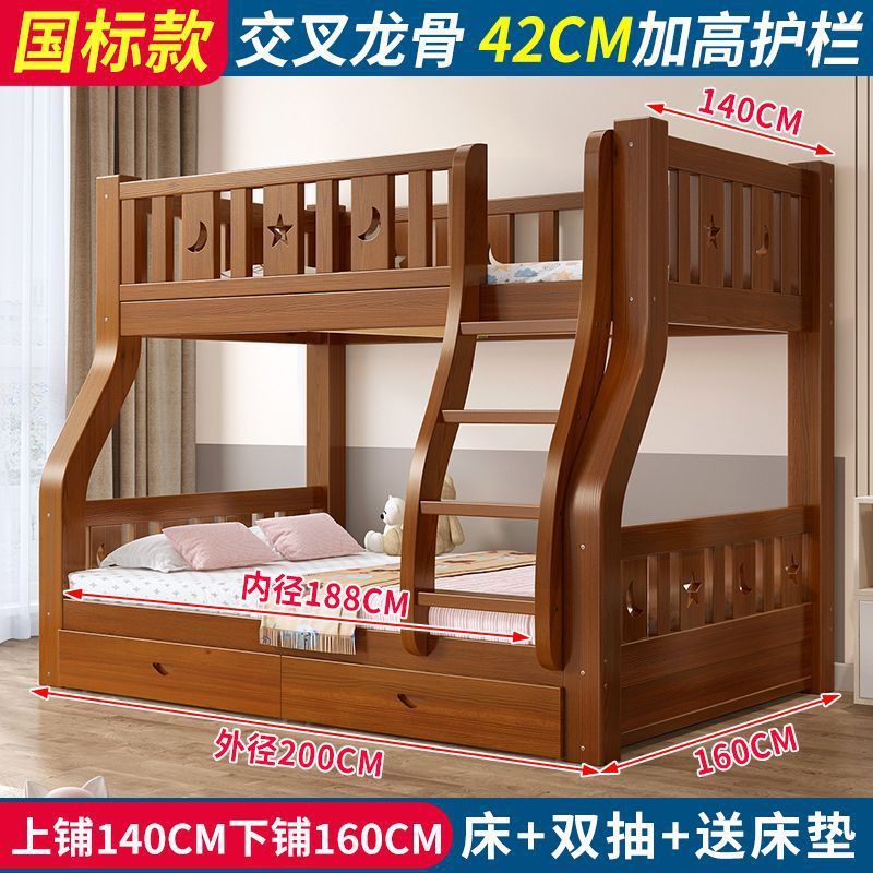• 브라운 침대 + 더블 서랍 + 매트리스 - 상단 침대 폭 140cm/하단 침대 160cm (모두 원목)