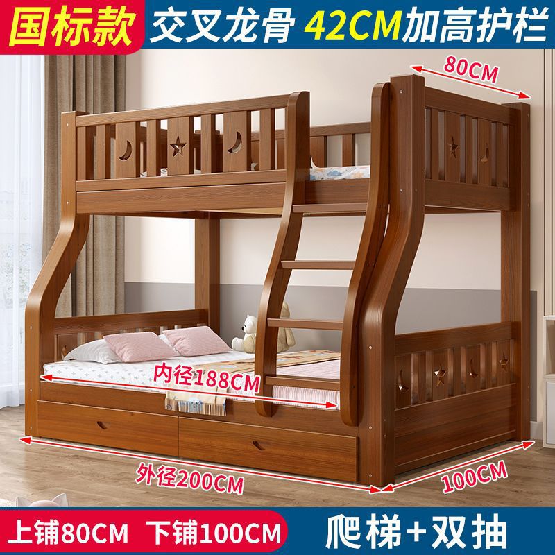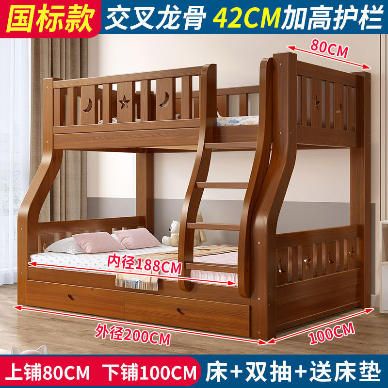 • 브라운 침대 + 더블 서랍 + 매트리스 - 상단 침대 폭 80cm/하단 침대 100cm (모두 원목)