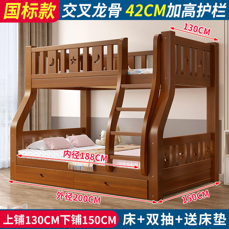 • 브라운 침대 + 더블 서랍 + 매트리스 - 상부 침대 폭 130cm/하부 침대 150cm (모두 원목)