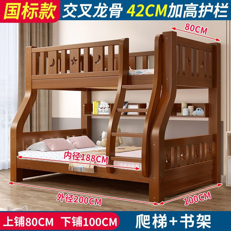 • 브라운 침대 + 책장 + 더블 서랍 + 매트리스 - 상단 침대 폭 80cm/하단 침대 100cm (전체 원목)