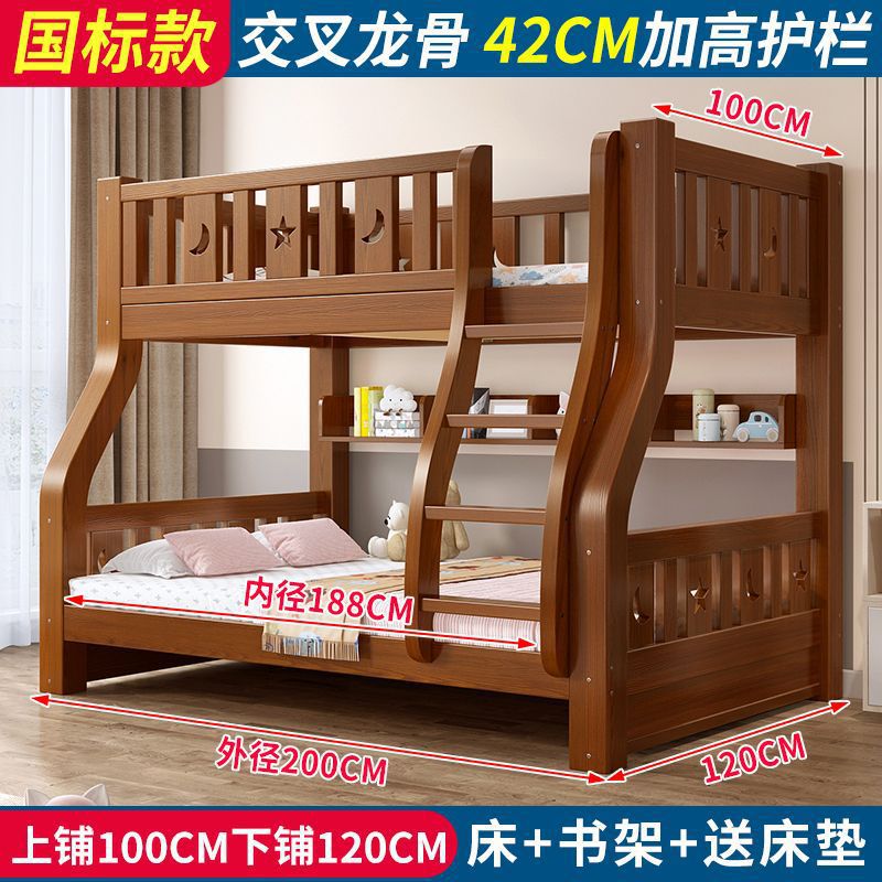 • 브라운 침대 + 책장 + 매트리스 - 상단 침대 폭 100cm/하단 침대 120cm (모두 원목)