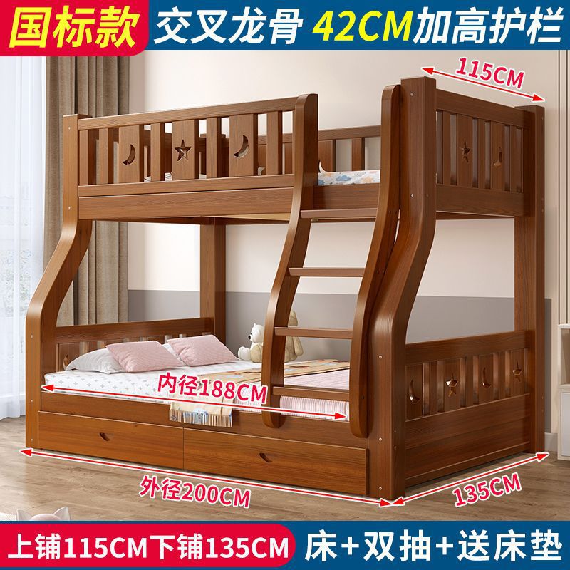 • 브라운 침대 + 더블 서랍 + 매트리스 - 상단 침대 폭 115cm/하단 침대 135cm (모두 원목)
