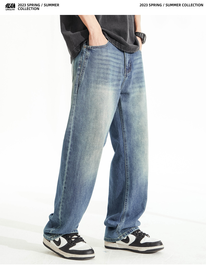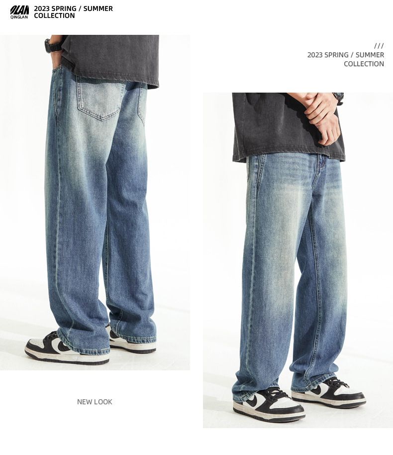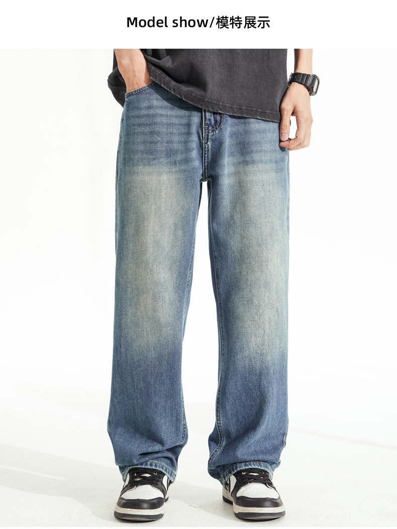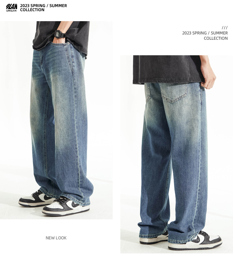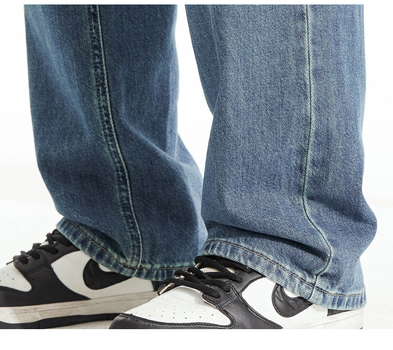 봄과 가을 코튼 느슨한 스트레이트 청바지 남성용 딥 플러스 사이즈 빈티지 세탁 블루 남성용 트렌디 브랜드 캐주얼 바지스토어 가기