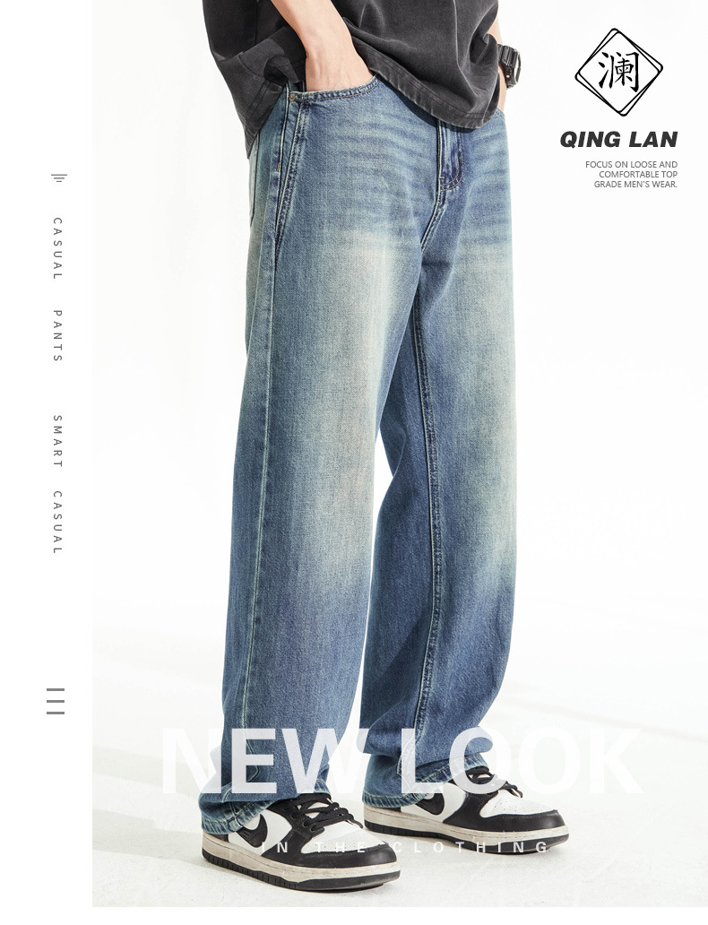 봄과 가을 코튼 느슨한 스트레이트 청바지 남성용 딥 플러스 사이즈 빈티지 세탁 블루 남성용 트렌디 브랜드 캐주얼 바지
