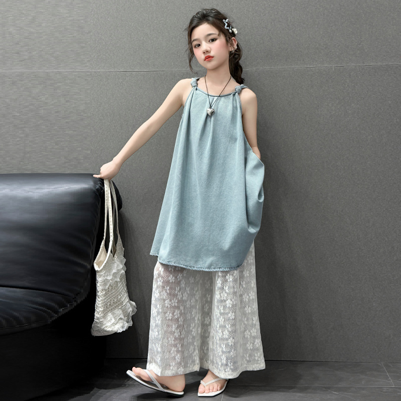 소녀 슬링 스커트 여름 세트 2025 새로운 어린이 세련 된 넓은 다리 바지 투피스 세트 어린 소녀의 캐주얼 여름 원피스
