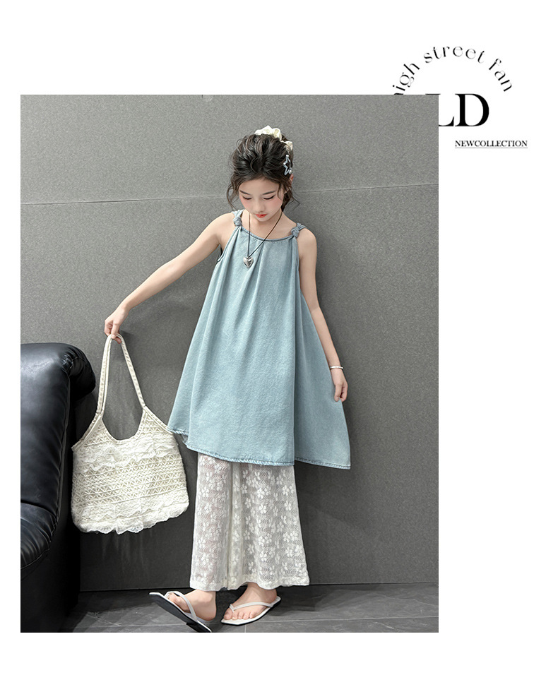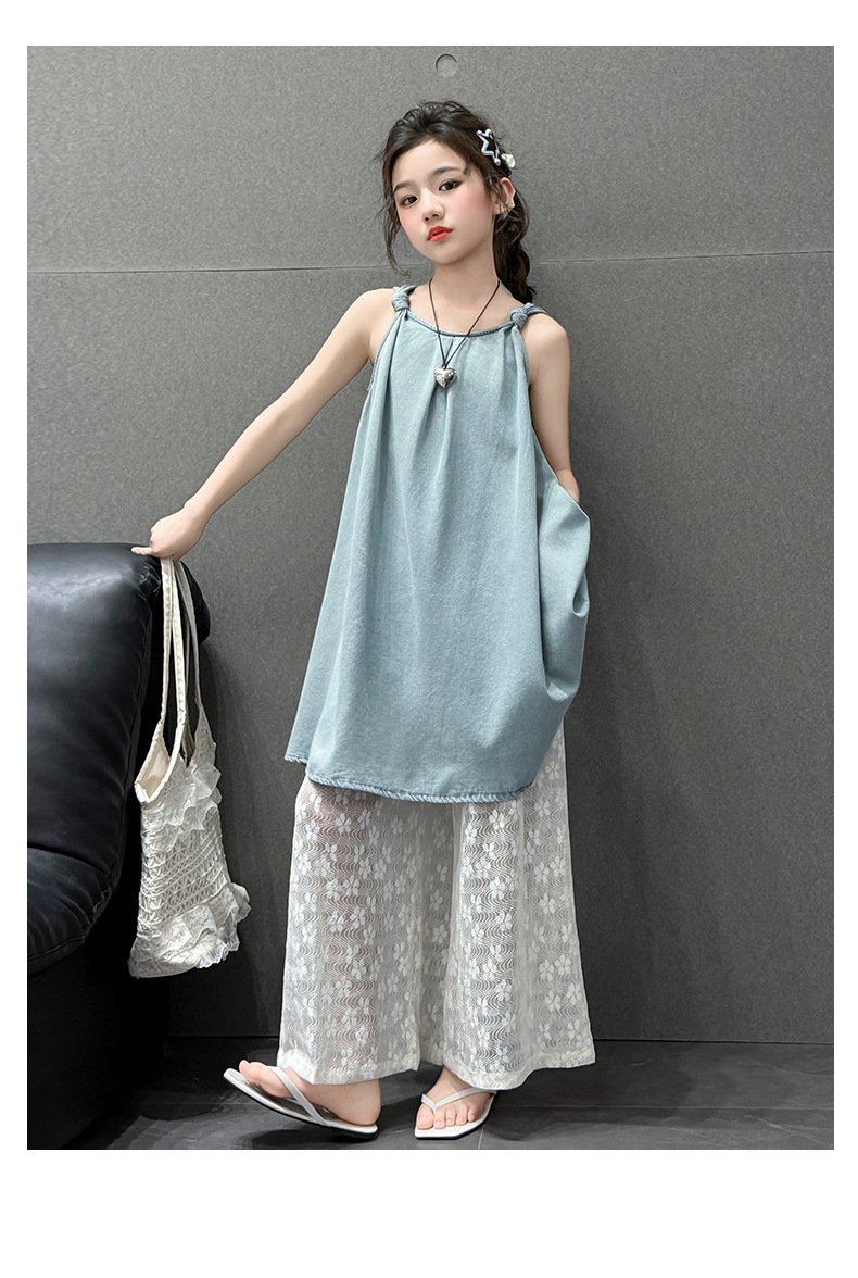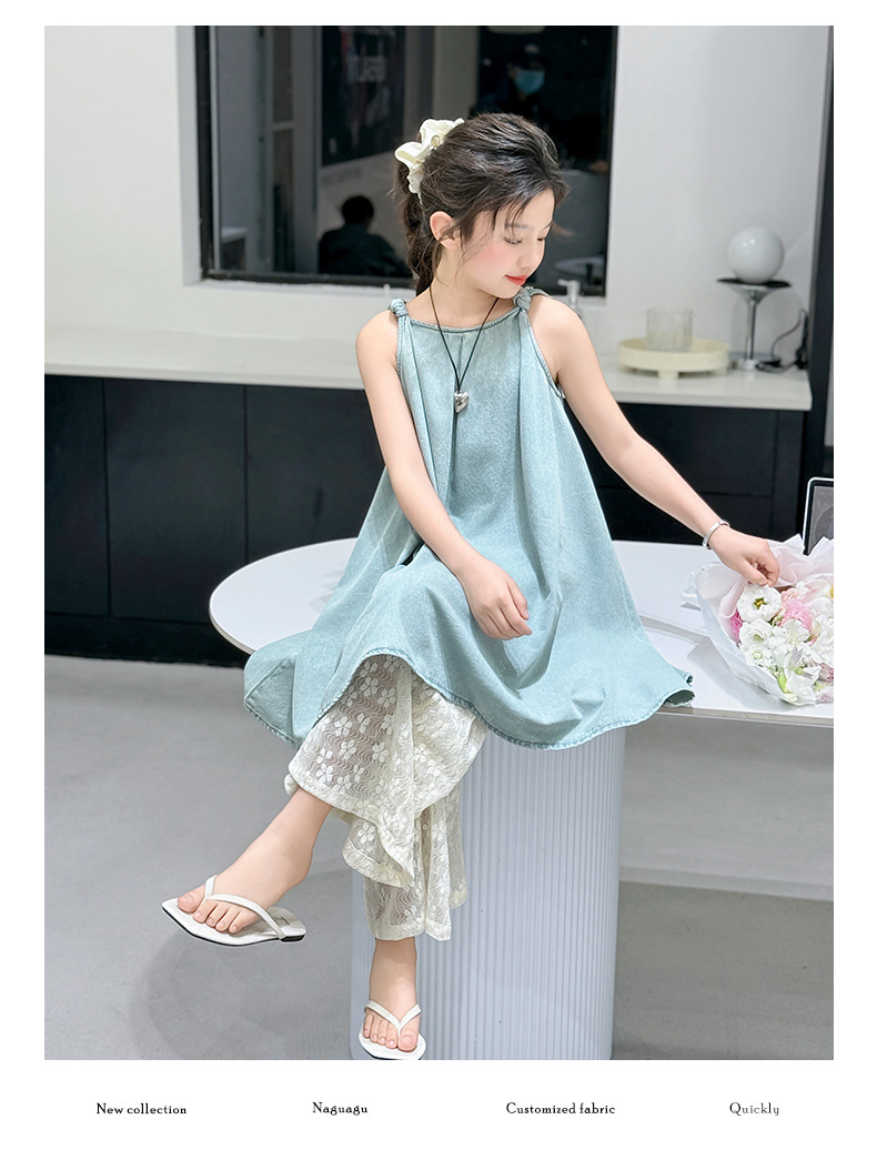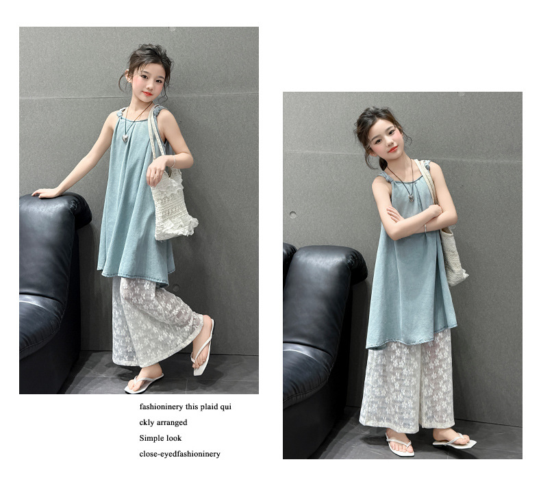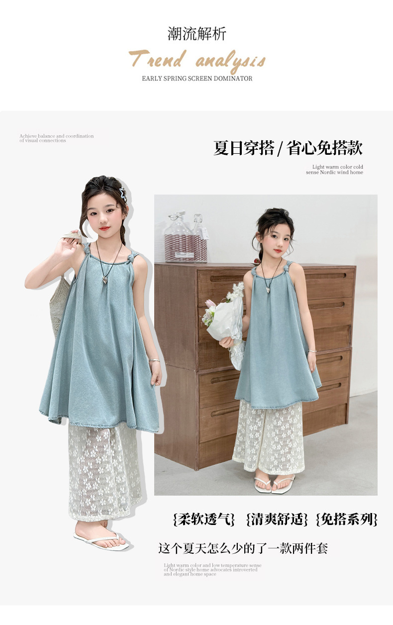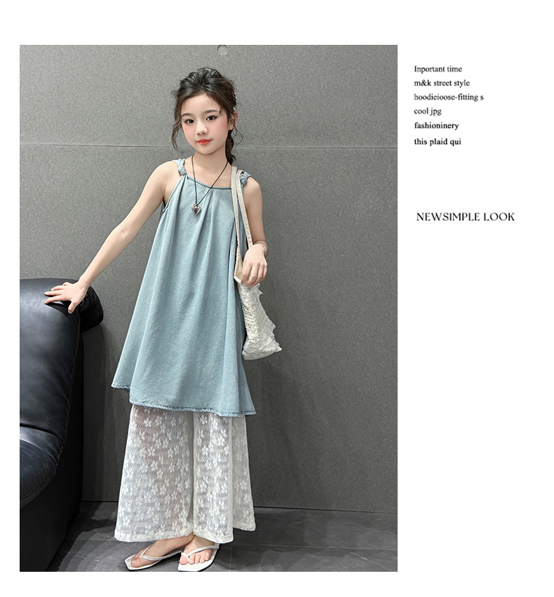 소녀 슬링 스커트 여름 세트 2025 새로운 어린이 세련 된 넓은 다리 바지 투피스 세트 어린 소녀의 캐주얼 여름 원피스스토어 가기