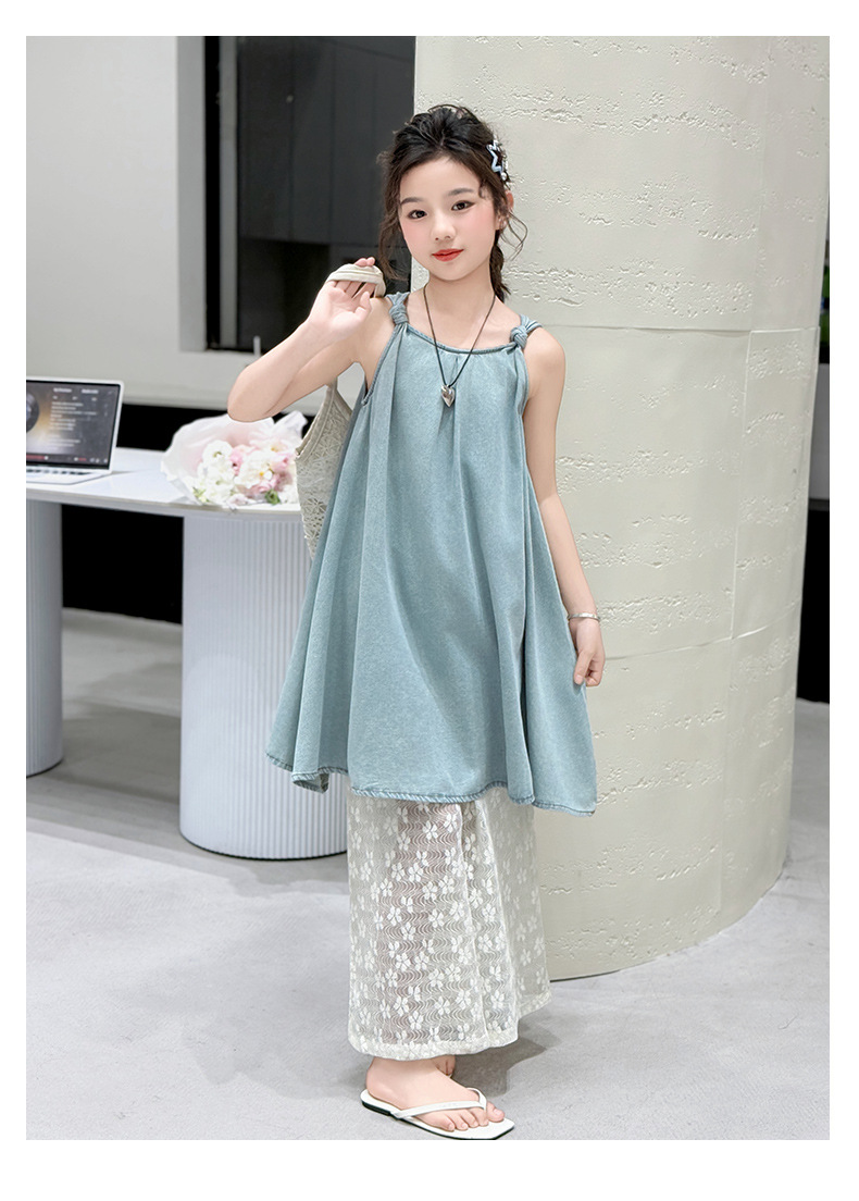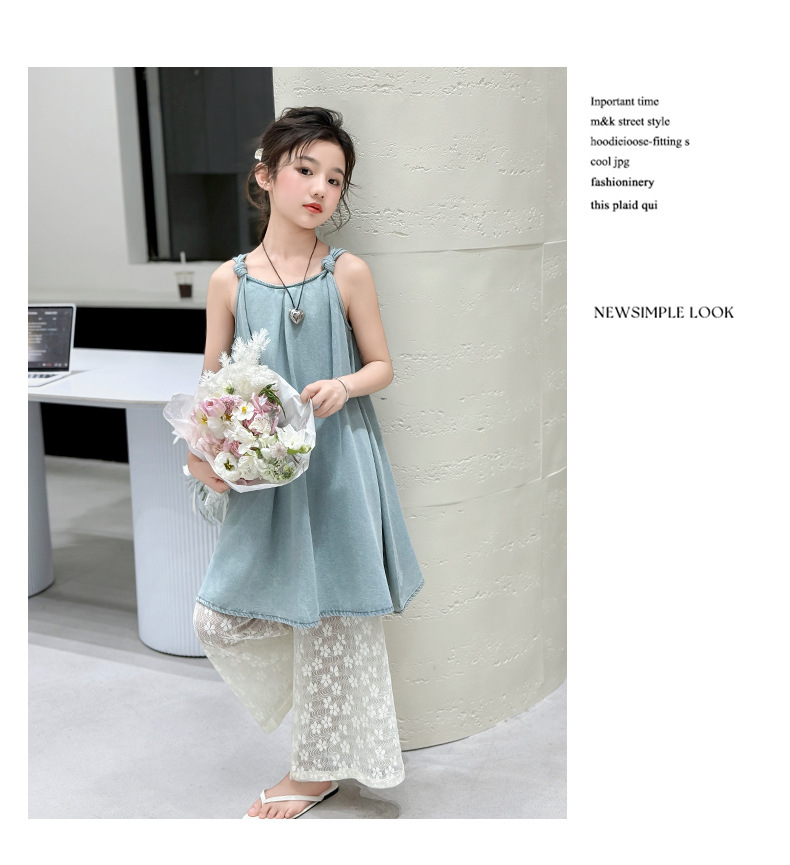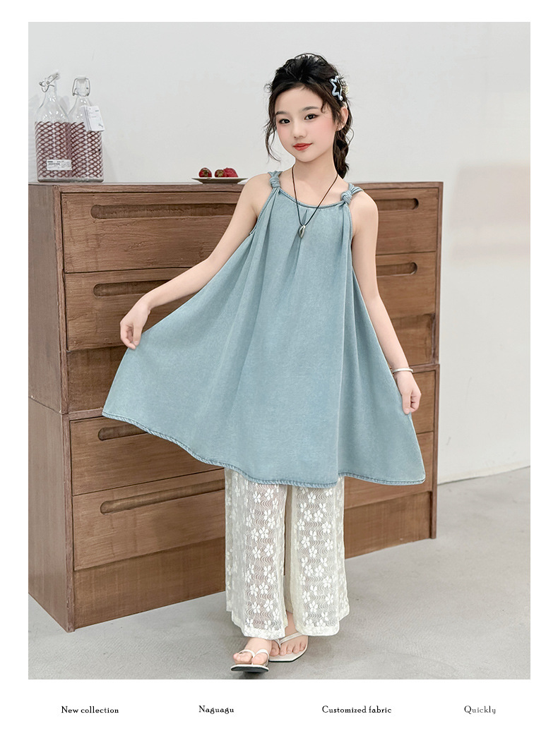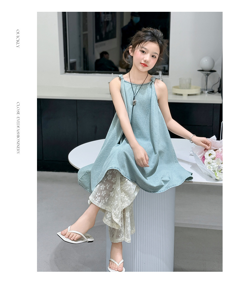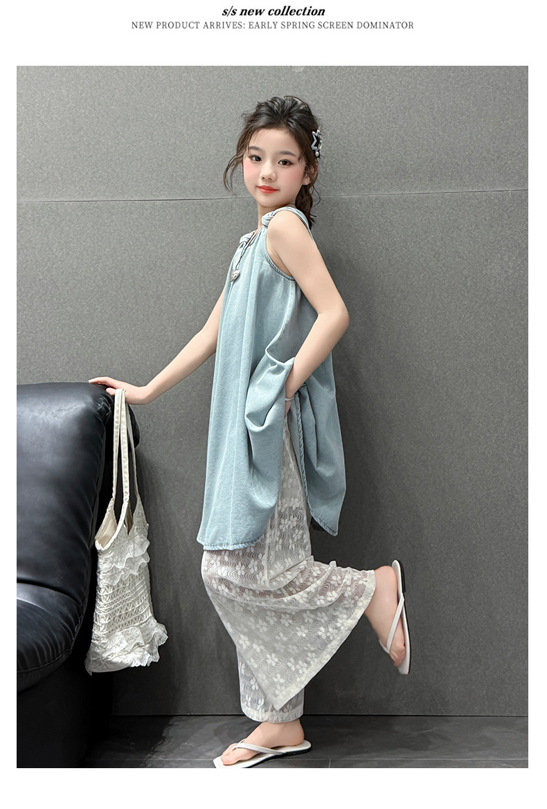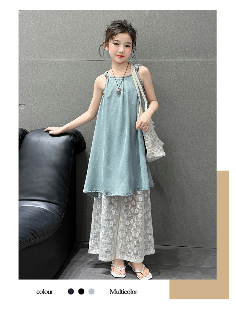 소녀 슬링 스커트 여름 세트 2025 새로운 어린이 세련 된 넓은 다리 바지 투피스 세트 어린 소녀의 캐주얼 여름 원피스스토어 가기