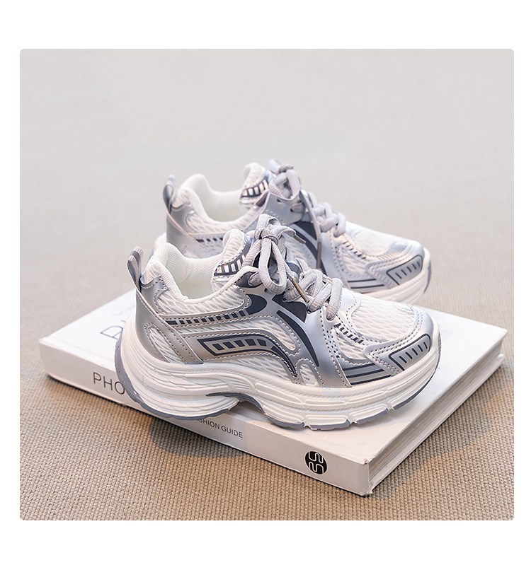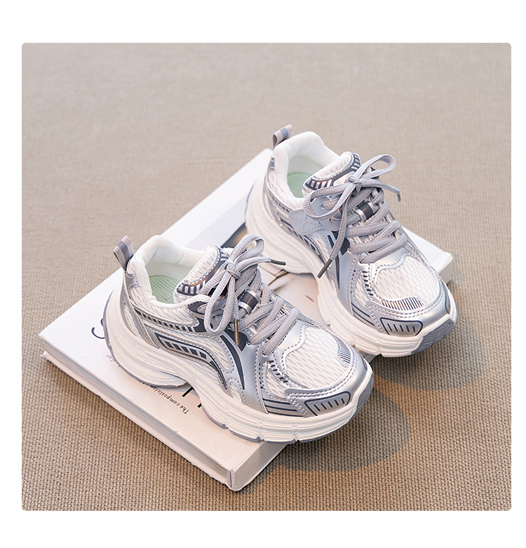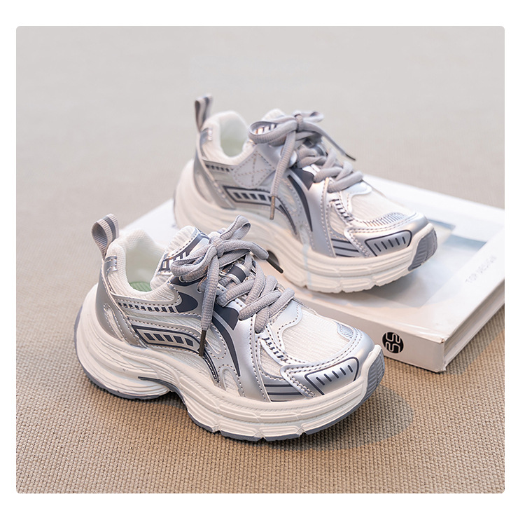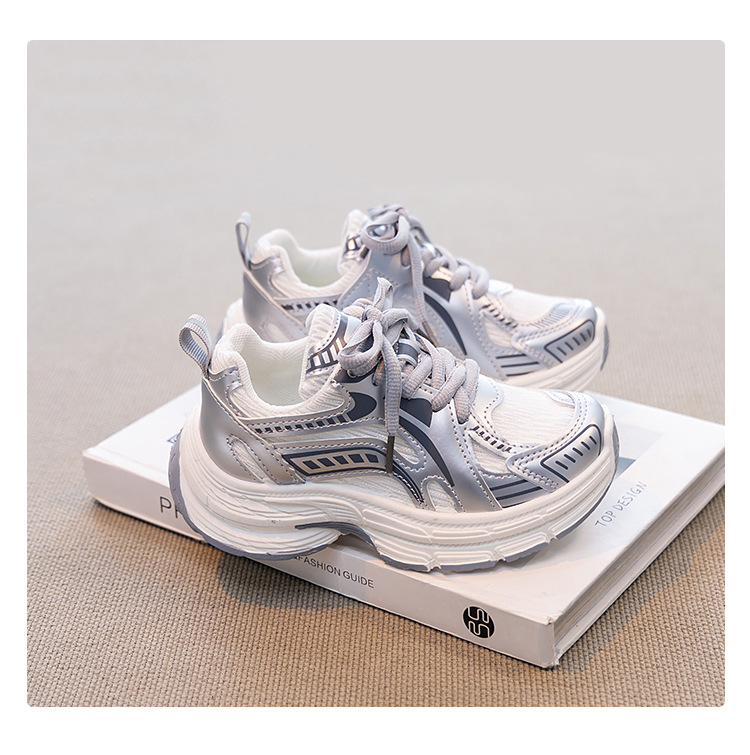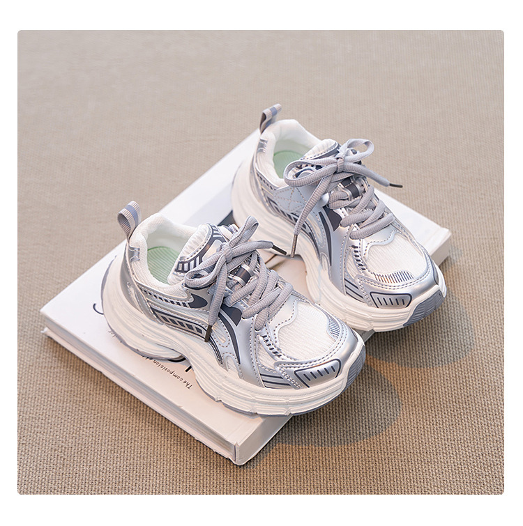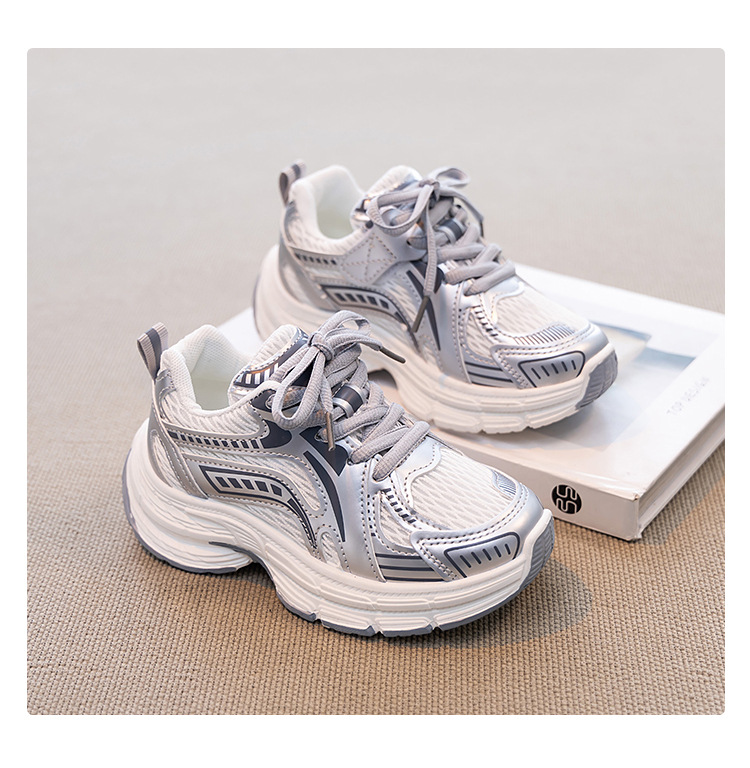 세련되고 통기성이 뛰어난 어린이 아빠 신발 2025 봄 여름 새로운 경량 부드러운 밑창 소년 신발 소녀 실버 운동화
