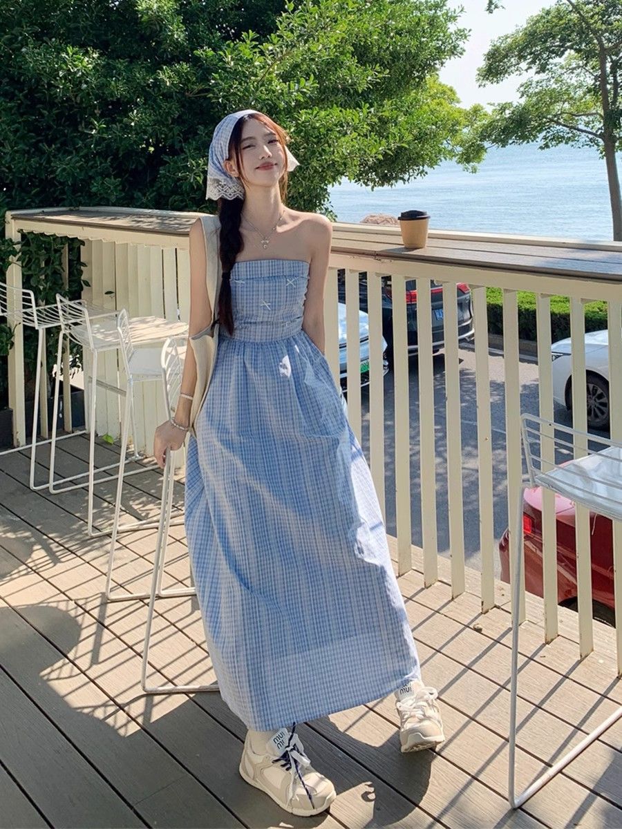 프랑스 블루 격자 무늬 스트랩 원피스 여성 여름 2025 새로운 해변 휴가 민소매 조끼 긴 원피스스토어 가기