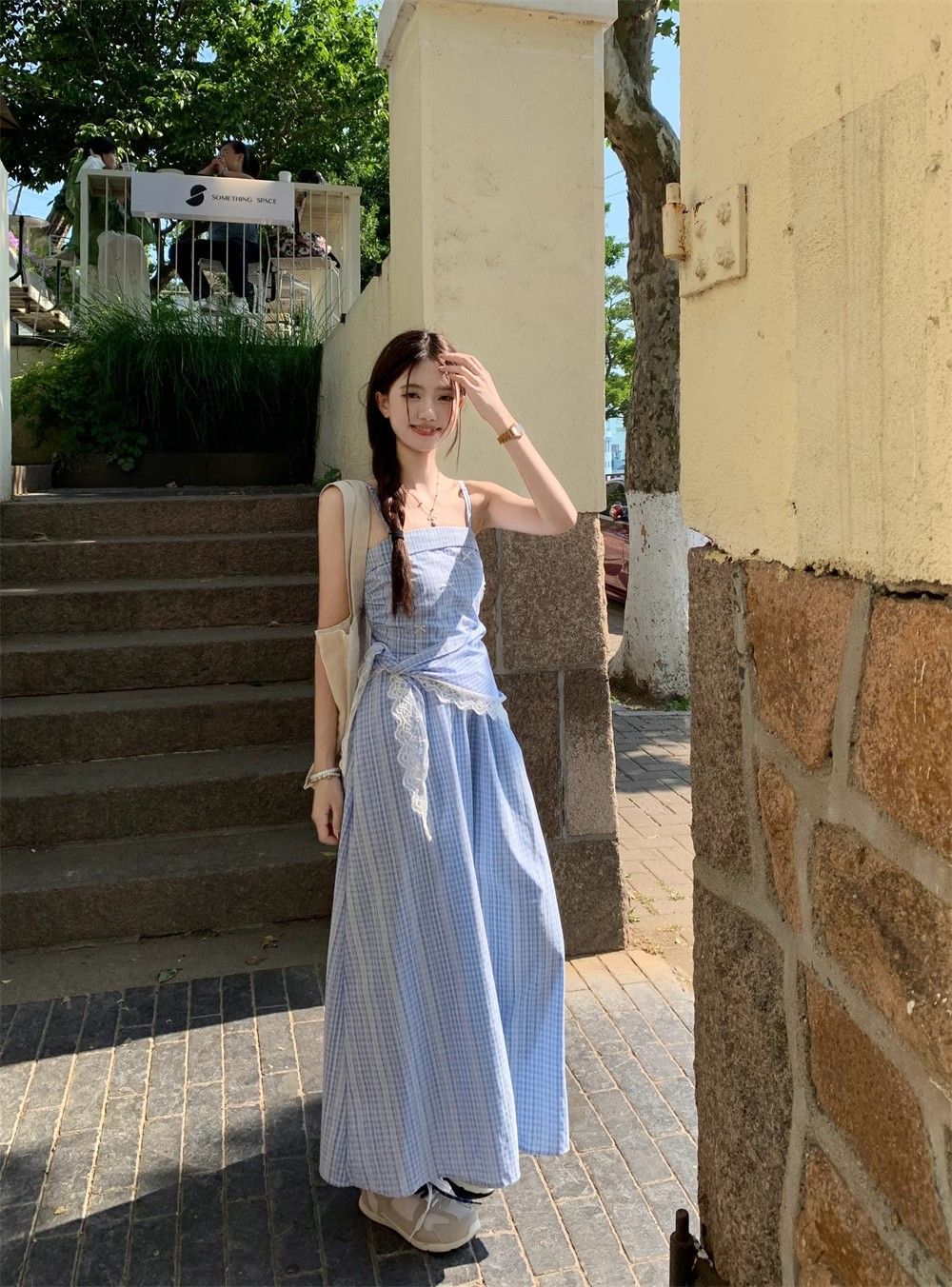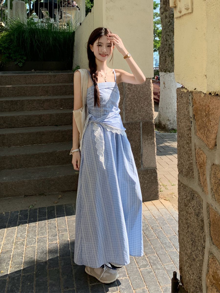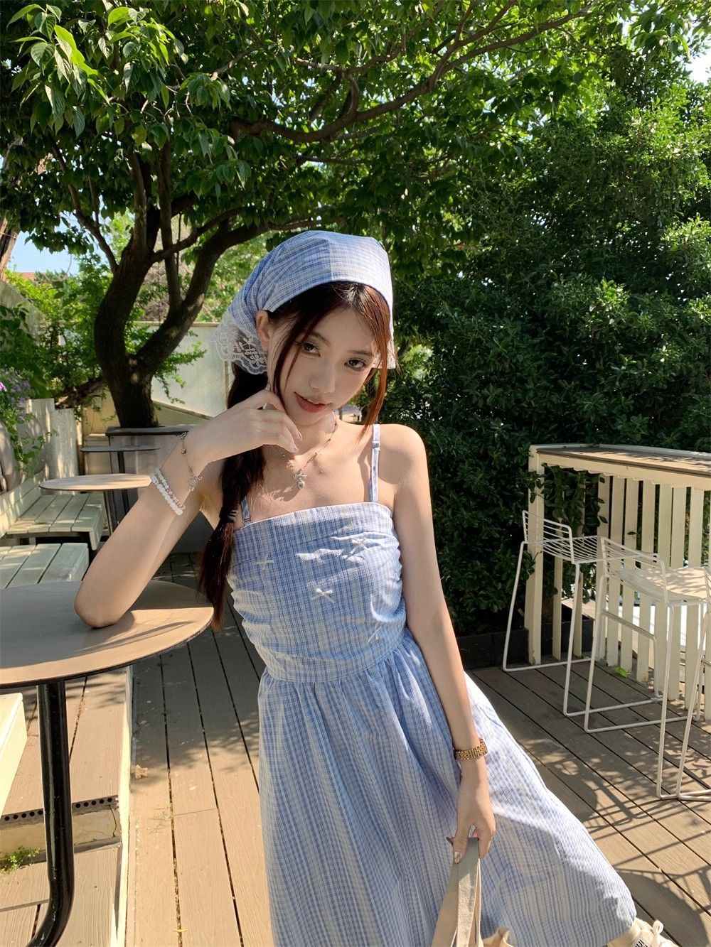 프랑스 블루 격자 무늬 스트랩 원피스 여성 여름 2025 새로운 해변 휴가 민소매 조끼 긴 원피스