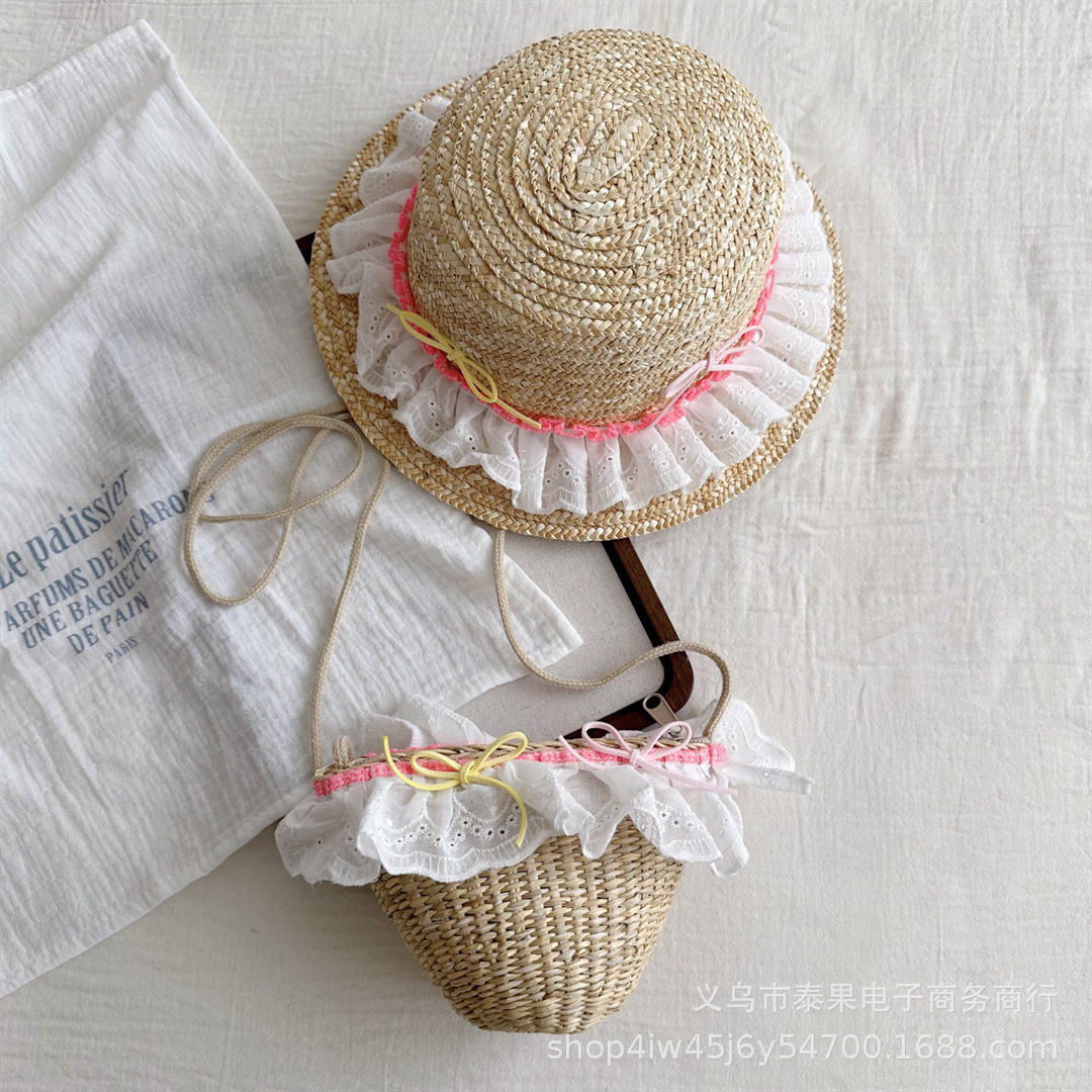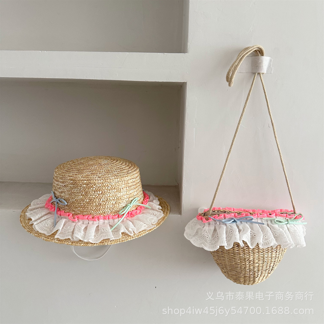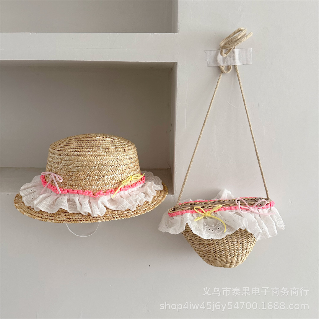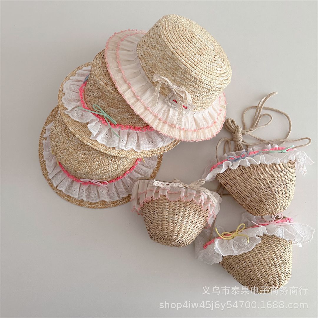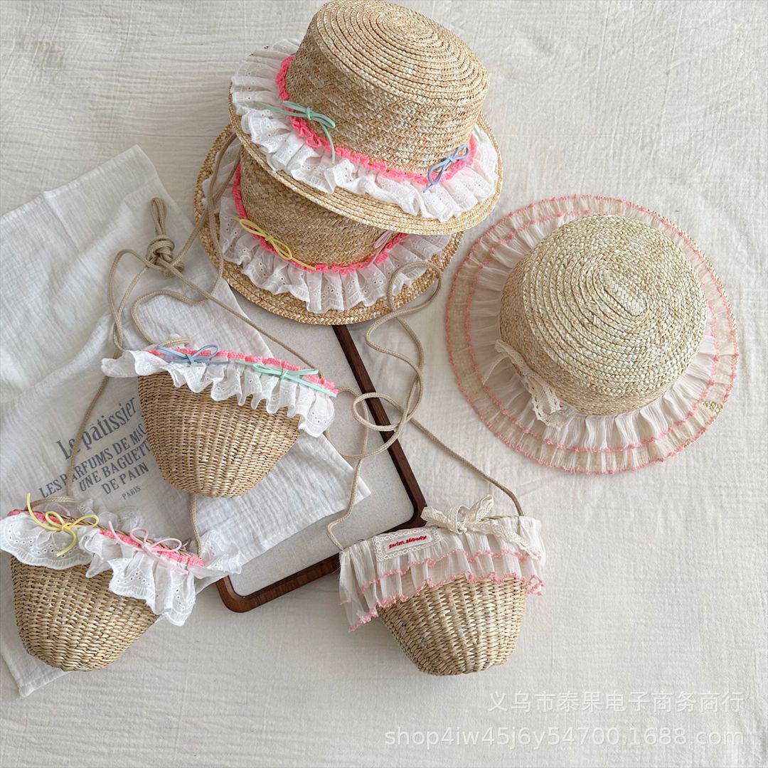 어린이 밀짚 모자 여름 플랫 탑 차양 모자 베이비 비치 모자 걸스 서양식 선 스크린 모자 미니 동전 지갑