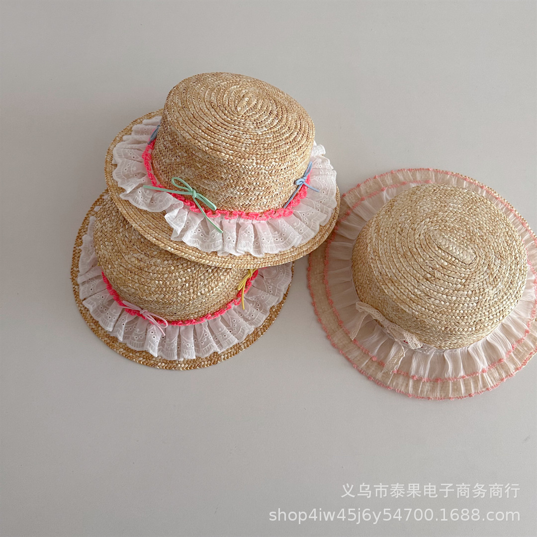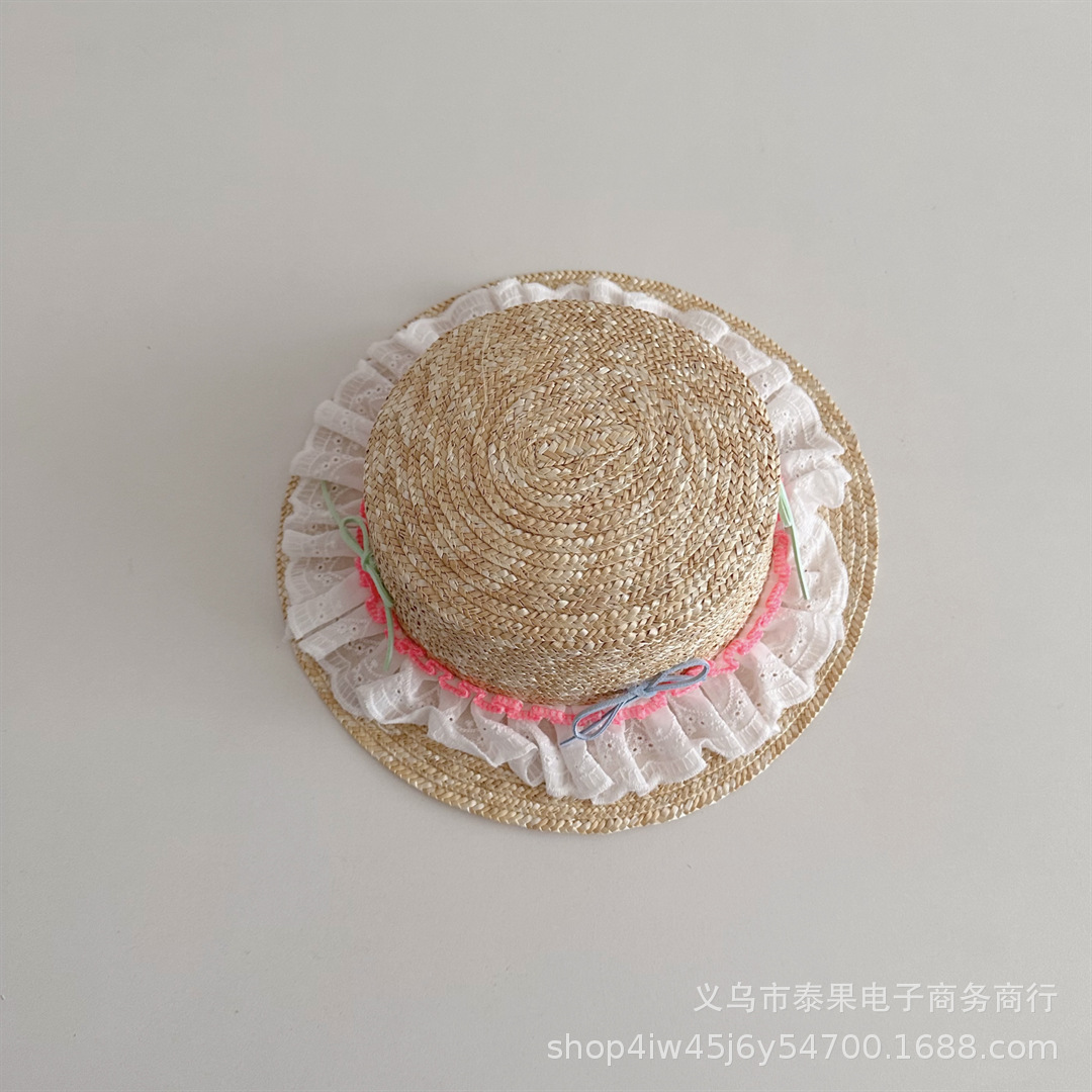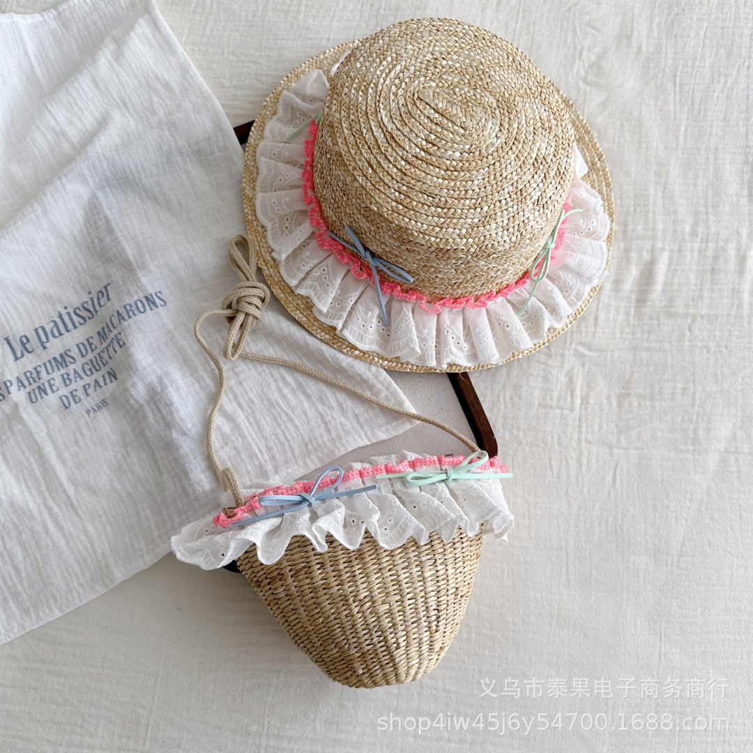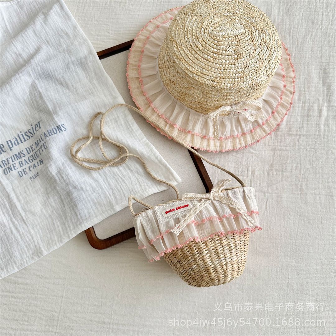 어린이 밀짚 모자 여름 플랫 탑 차양 모자 베이비 비치 모자 걸스 서양식 선 스크린 모자 미니 동전 지갑
