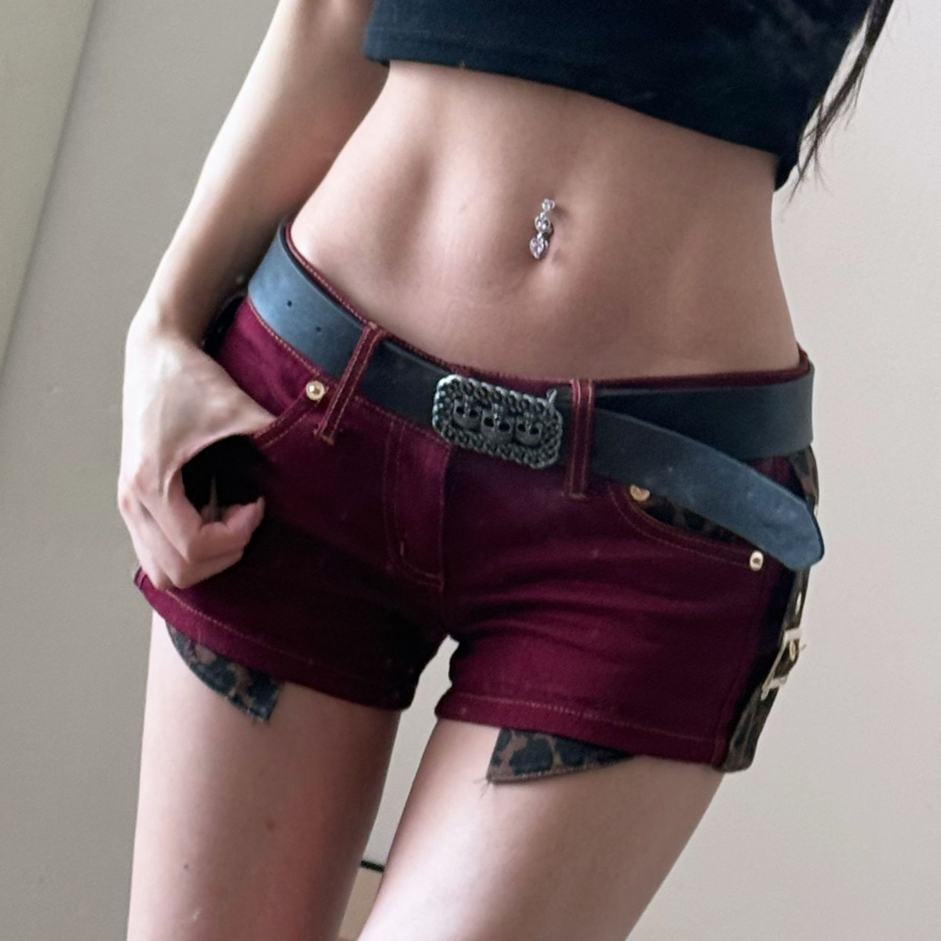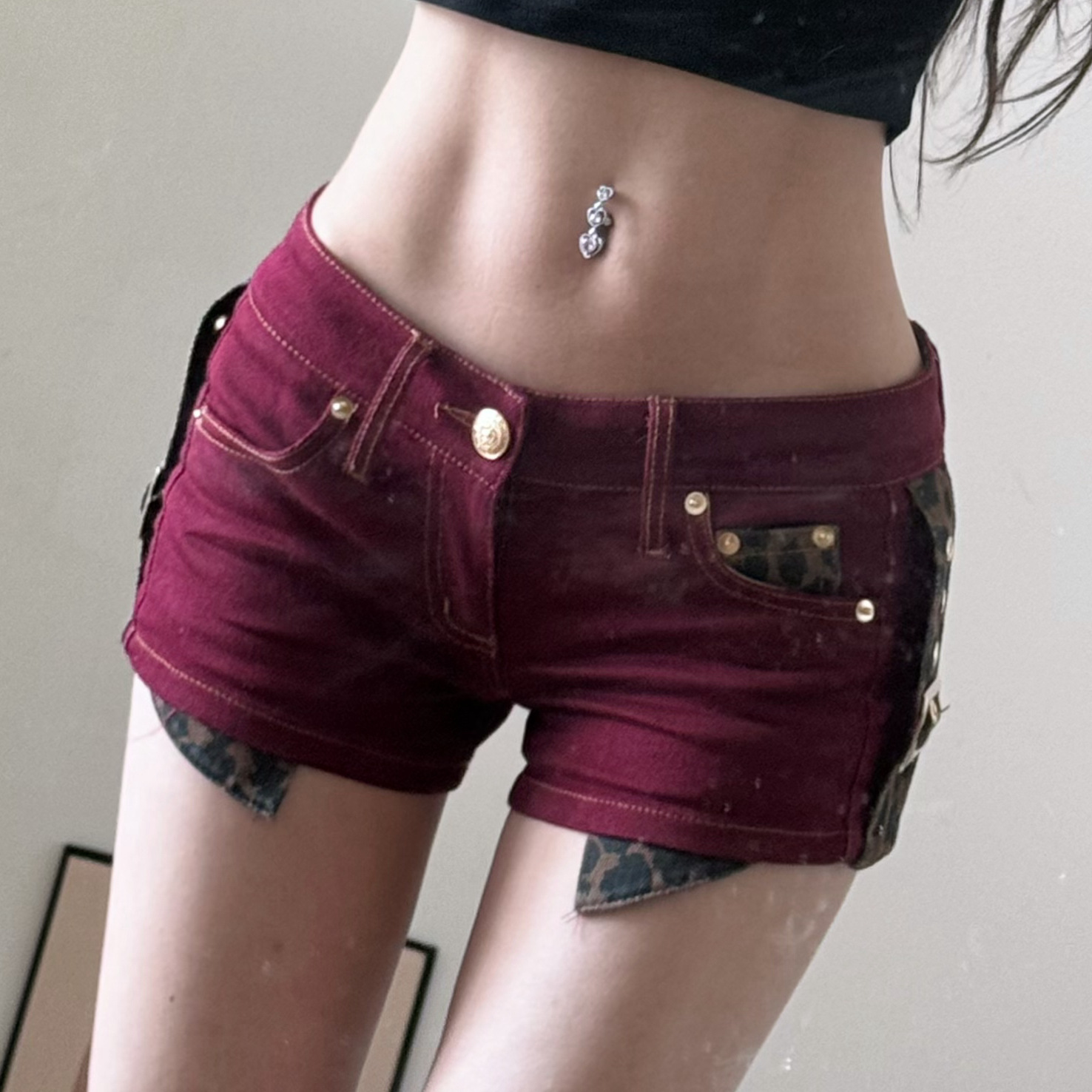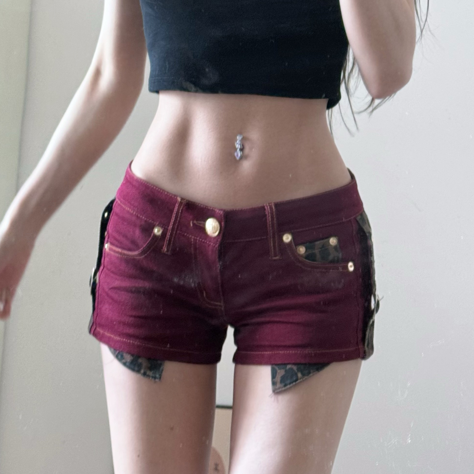 여름 여성을 위한 아메리칸 핫걸 데님 반바지 얇은 새로운 스타일 로우 웨이스트 슬리밍 레오파드 프린트 스플라이스 레드 핫팬츠스토어 가기