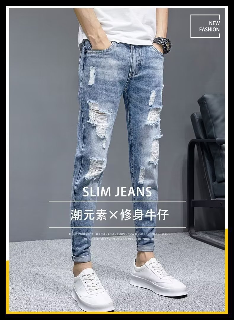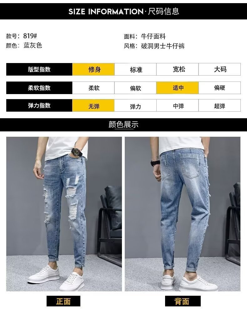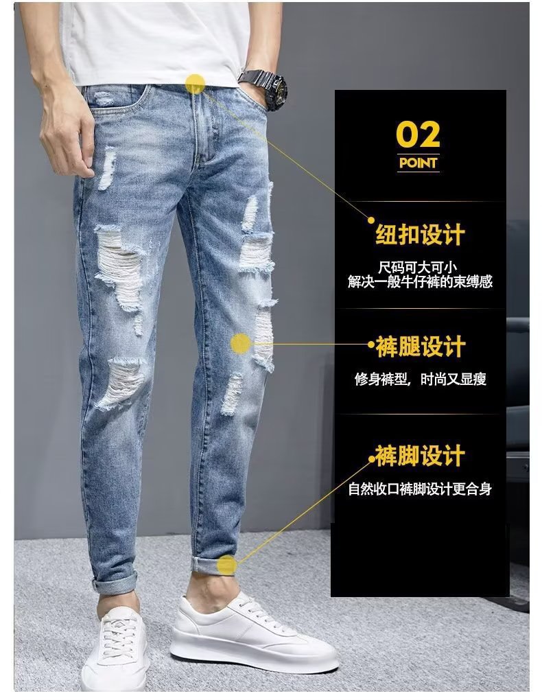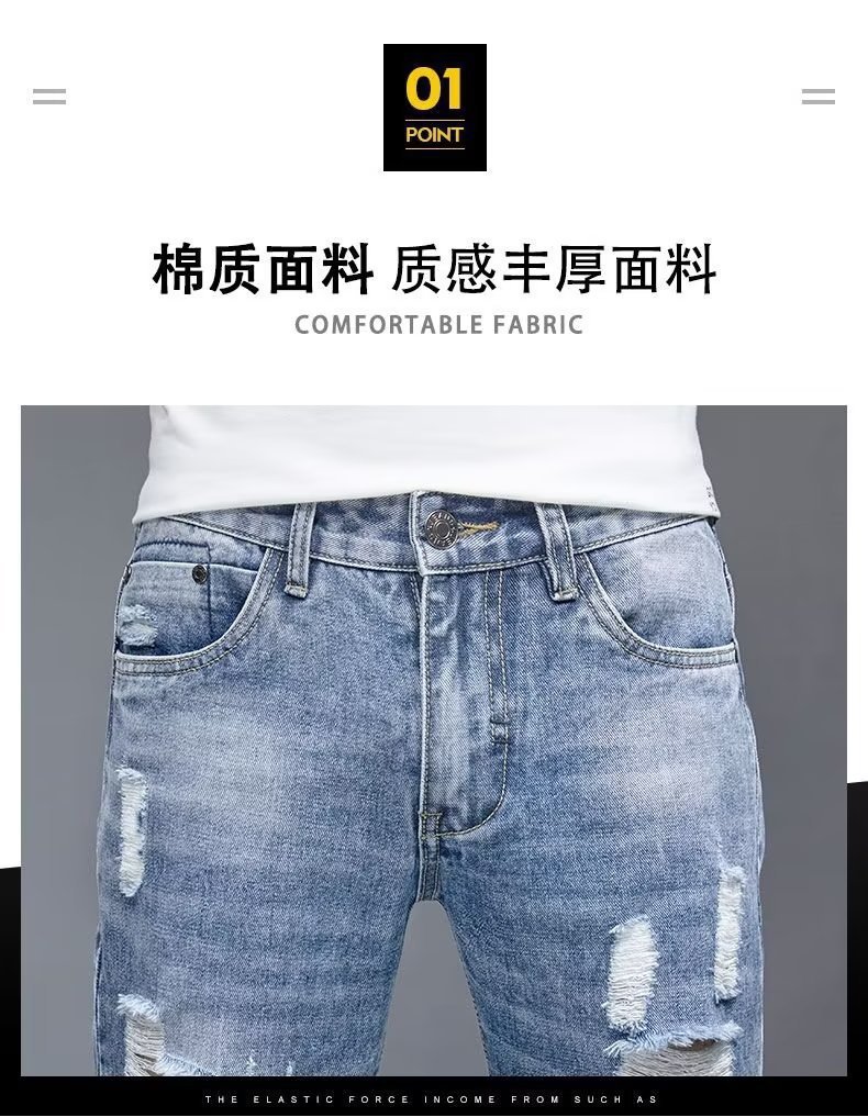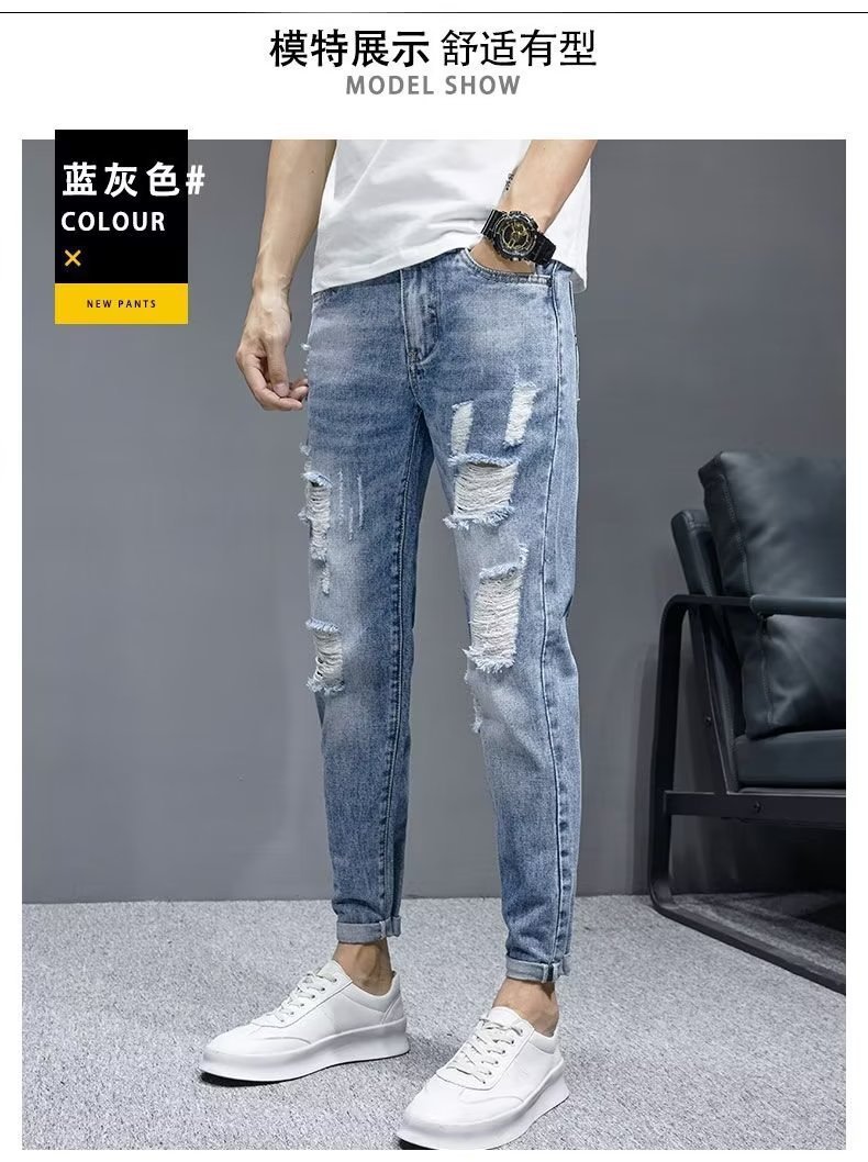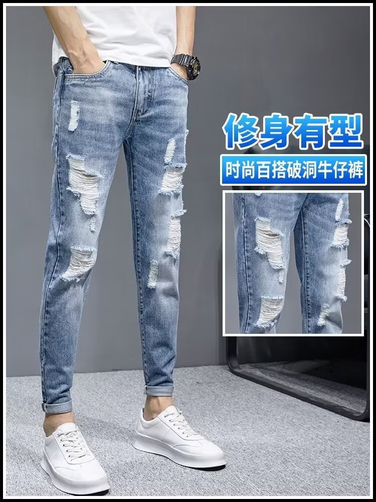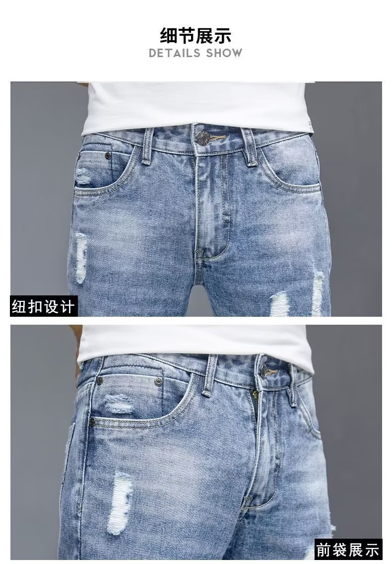 공장 제품 여름 신작 찢어진 9부 청바지 남성 슬림핏 캐주얼 베이비보이 트렌디 팬츠 봄, 가을 스타일스토어 가기