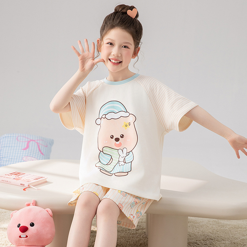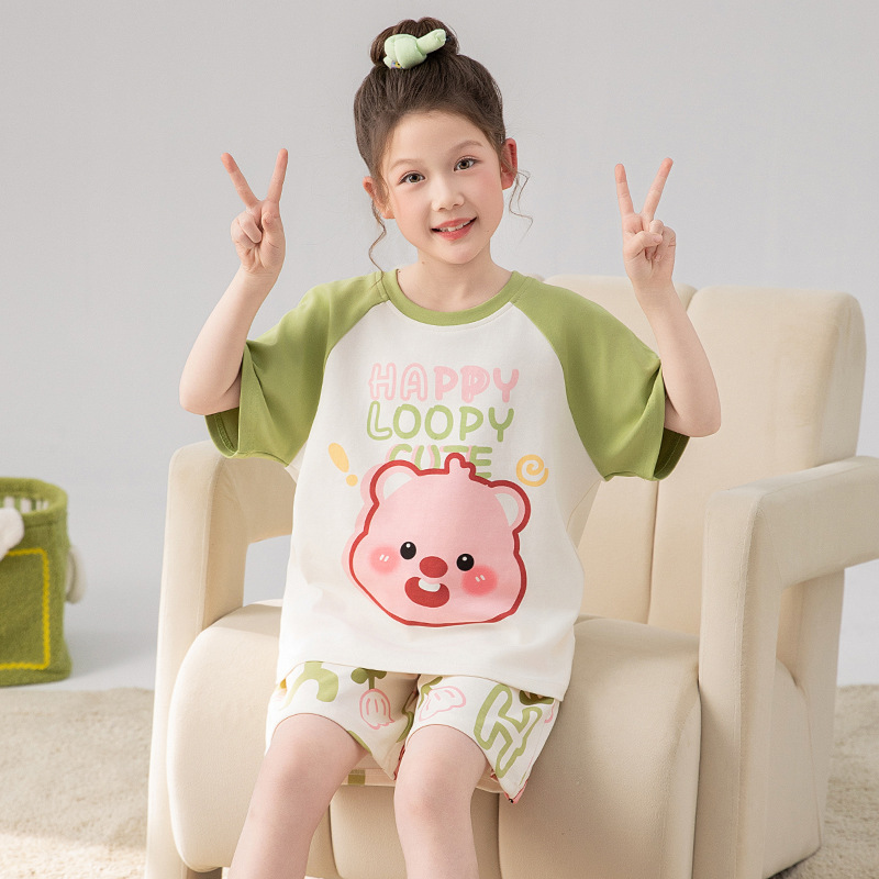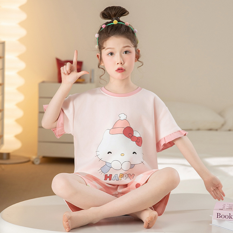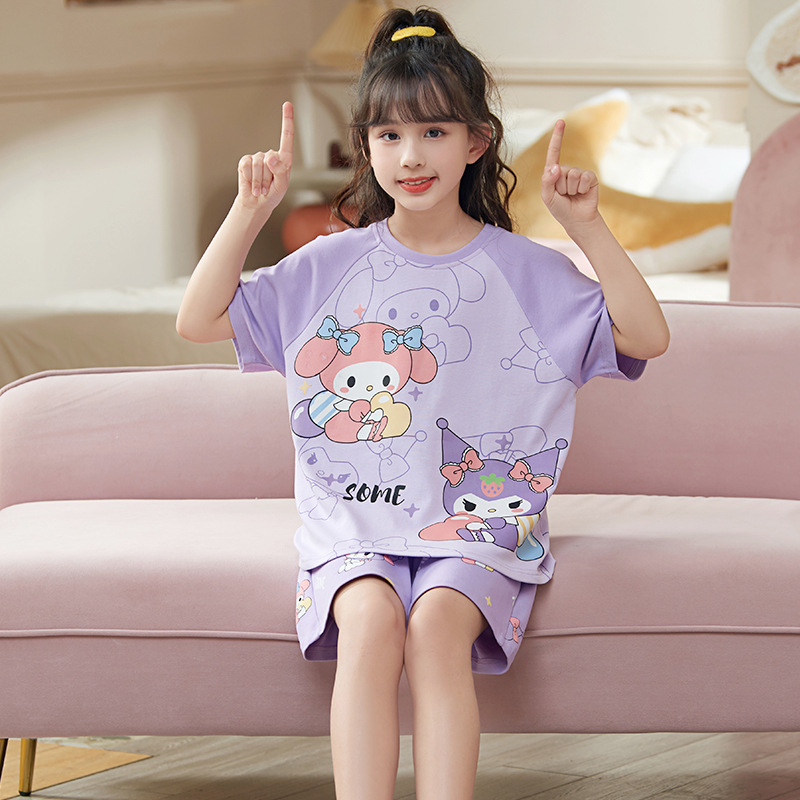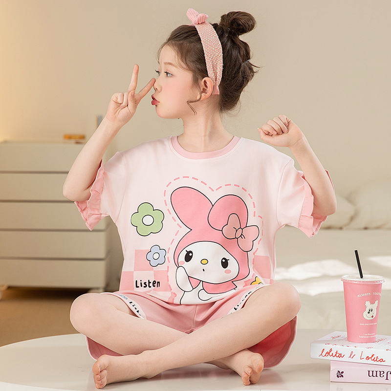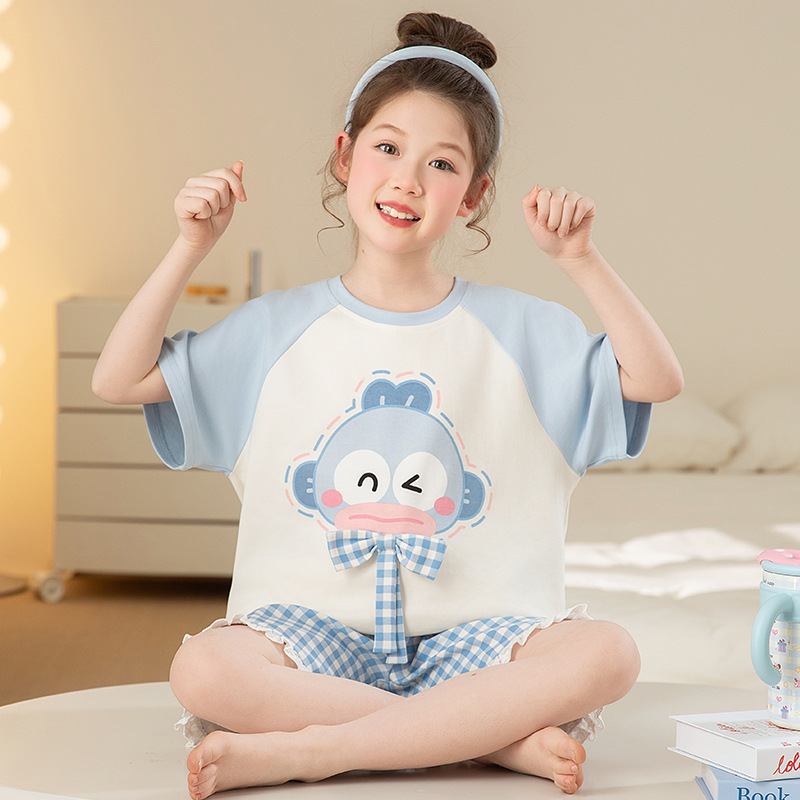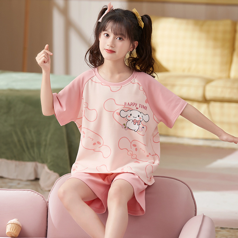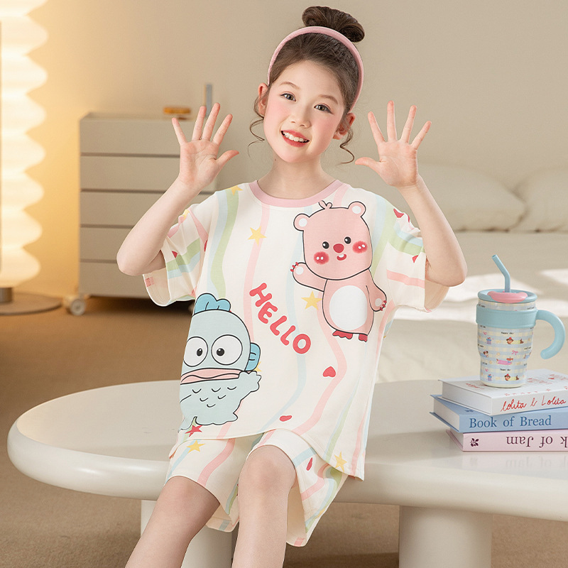 소녀를위한 어린이 잠옷 봄과 여름 순수한면 얇은 두 배 짧은 세트 소녀 중 큰 아이들 만화 아기 집 옷