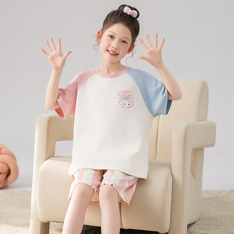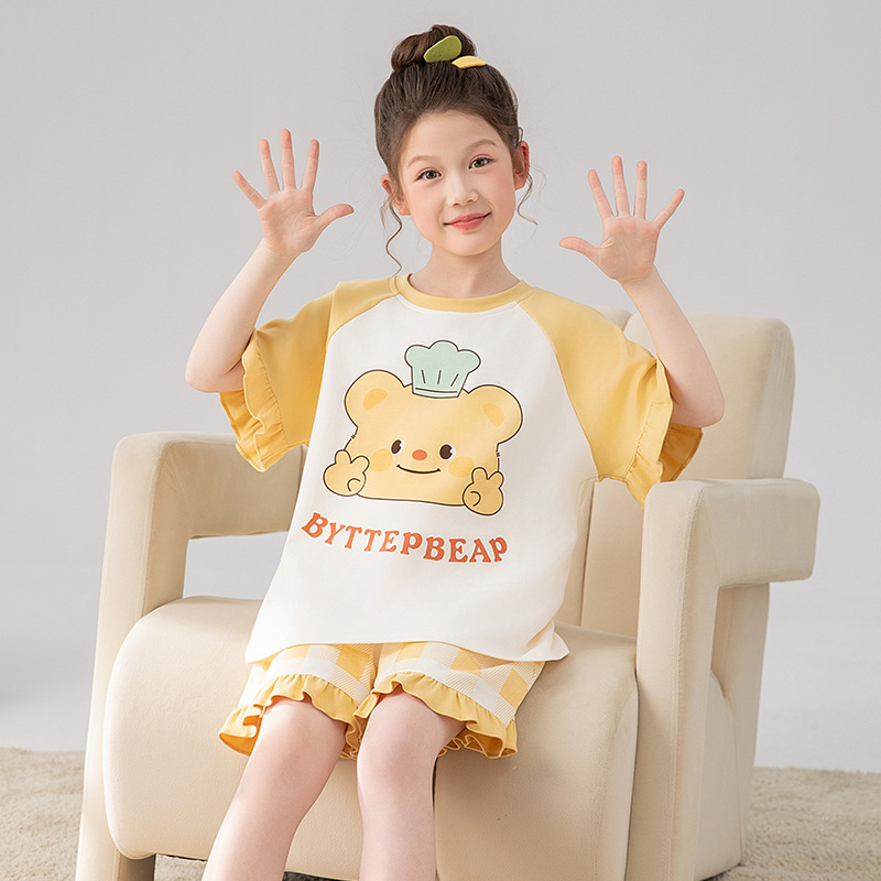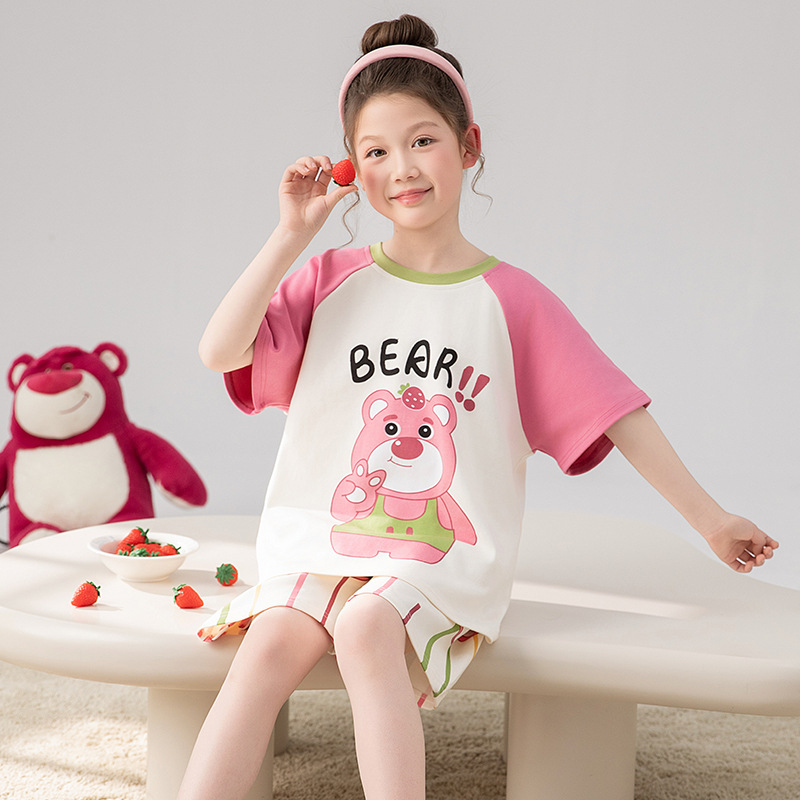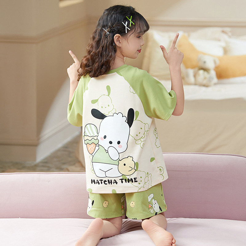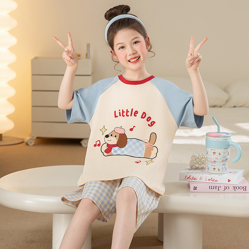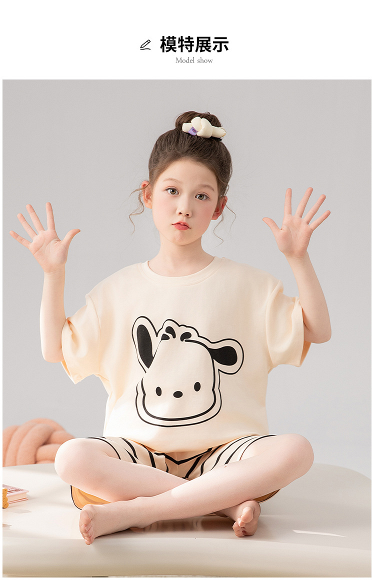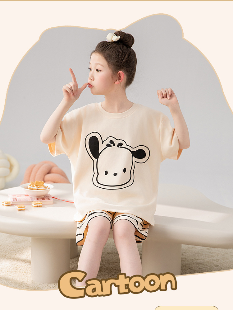 소녀를위한 어린이 잠옷 봄과 여름 순수한면 얇은 두 배 짧은 세트 소녀 중 큰 아이들 만화 아기 집 옷