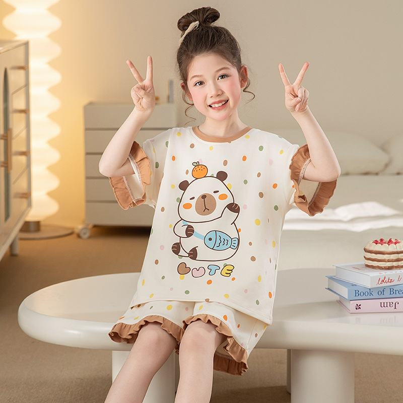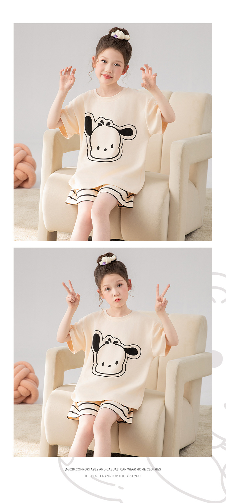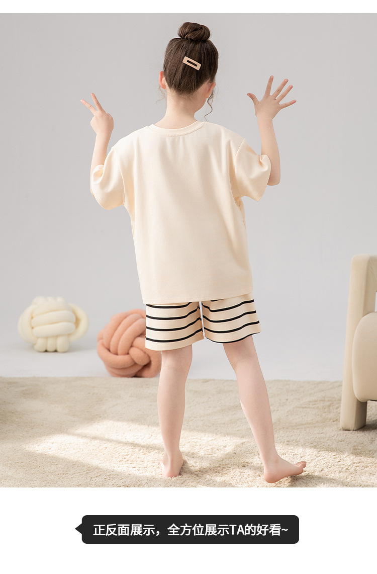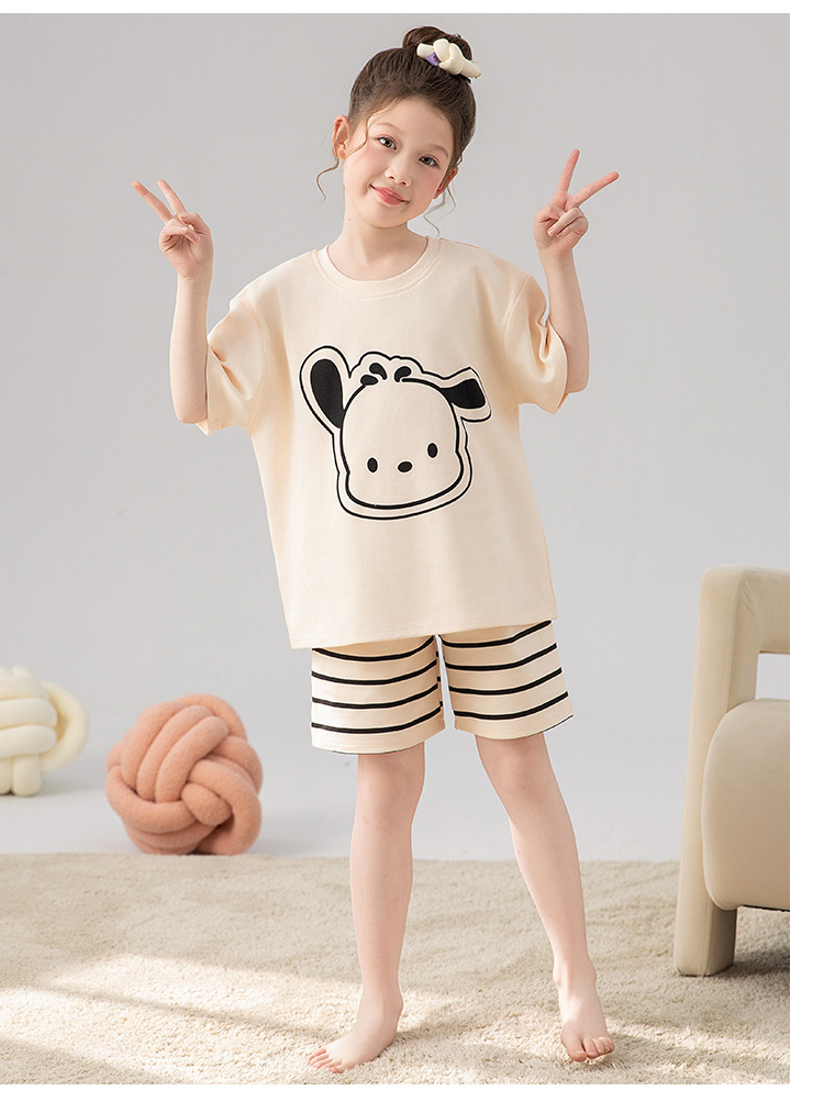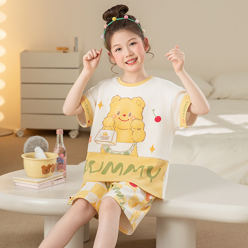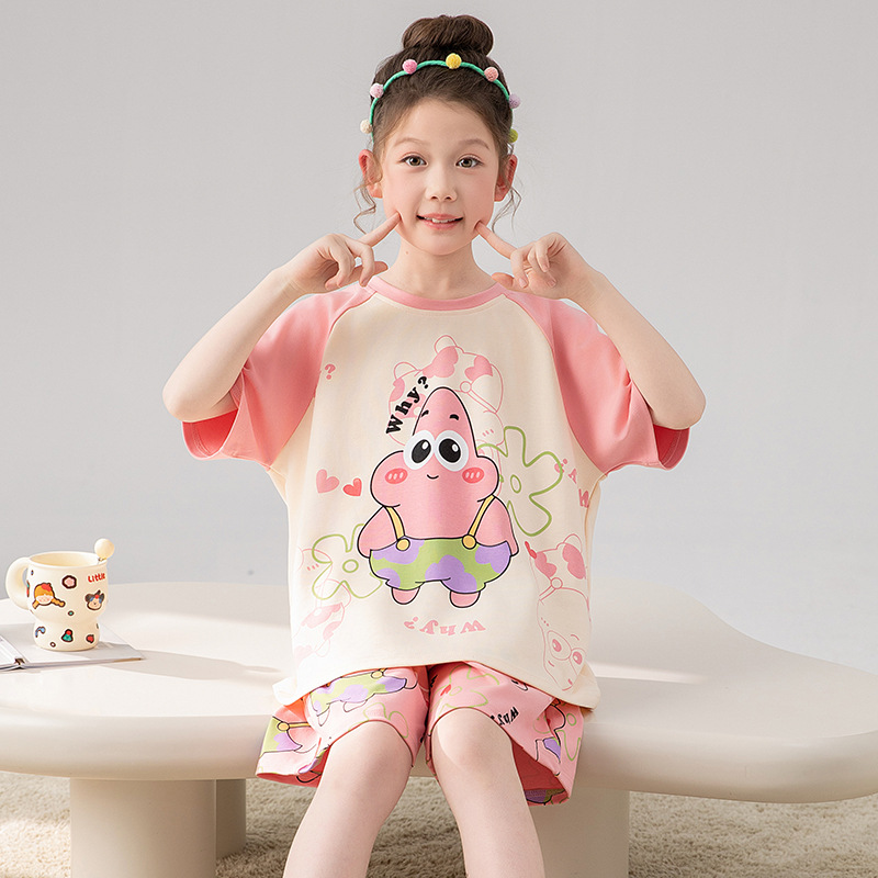 소녀를위한 어린이 잠옷 봄과 여름 순수한면 얇은 두 배 짧은 세트 소녀 중 큰 아이들 만화 아기 집 옷
