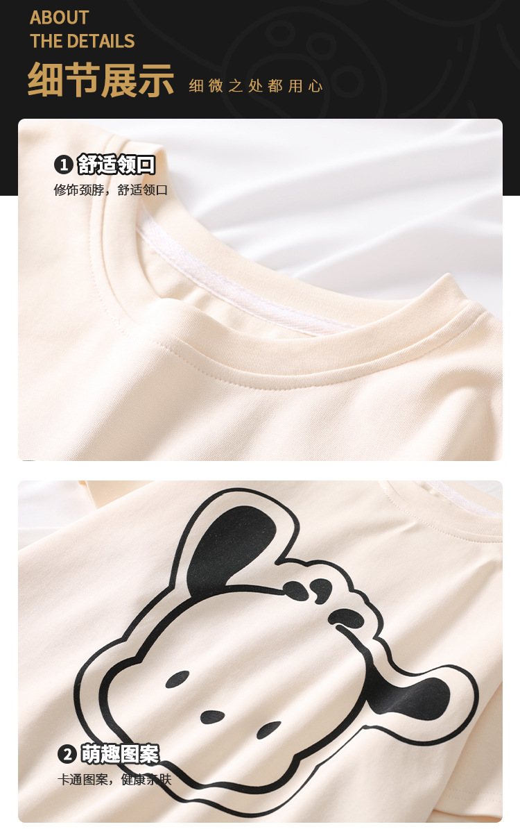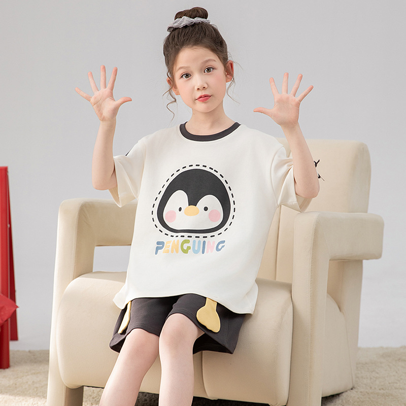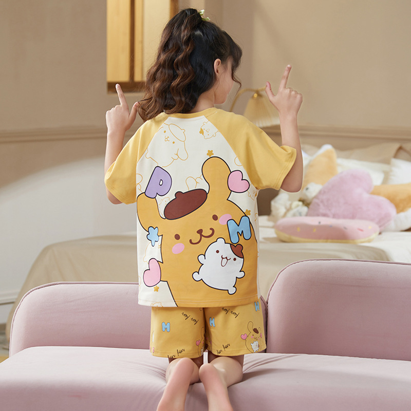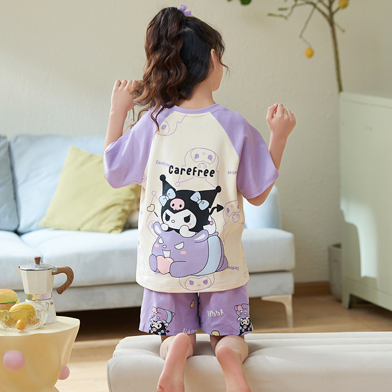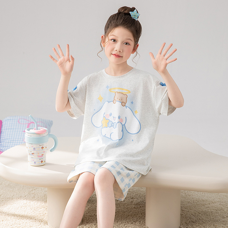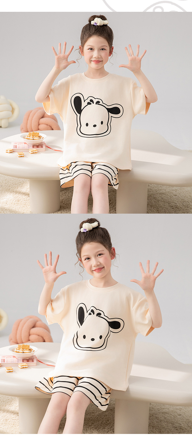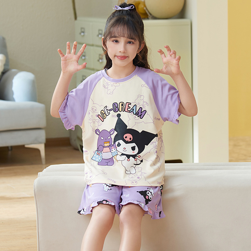 소녀를위한 어린이 잠옷 봄과 여름 순수한면 얇은 두 배 짧은 세트 소녀 중 큰 아이들 만화 아기 집 옷