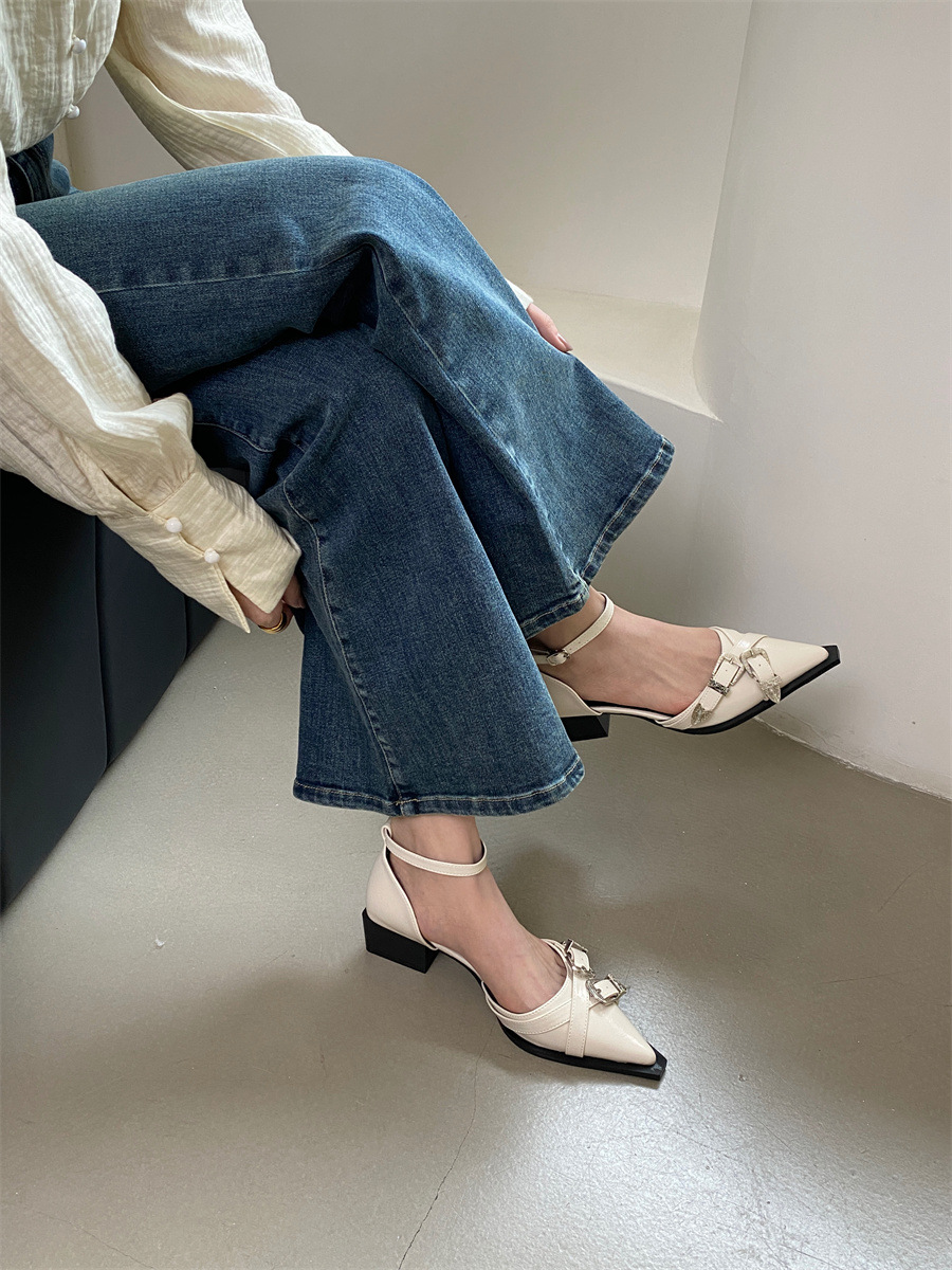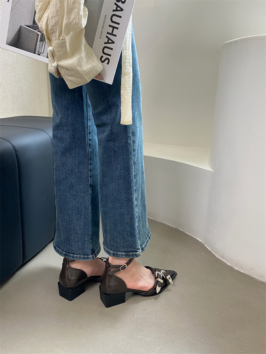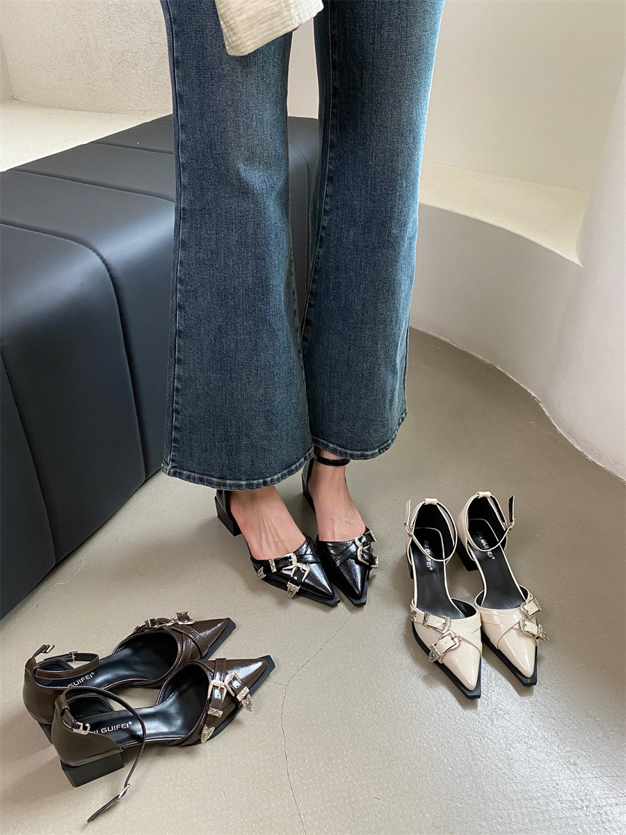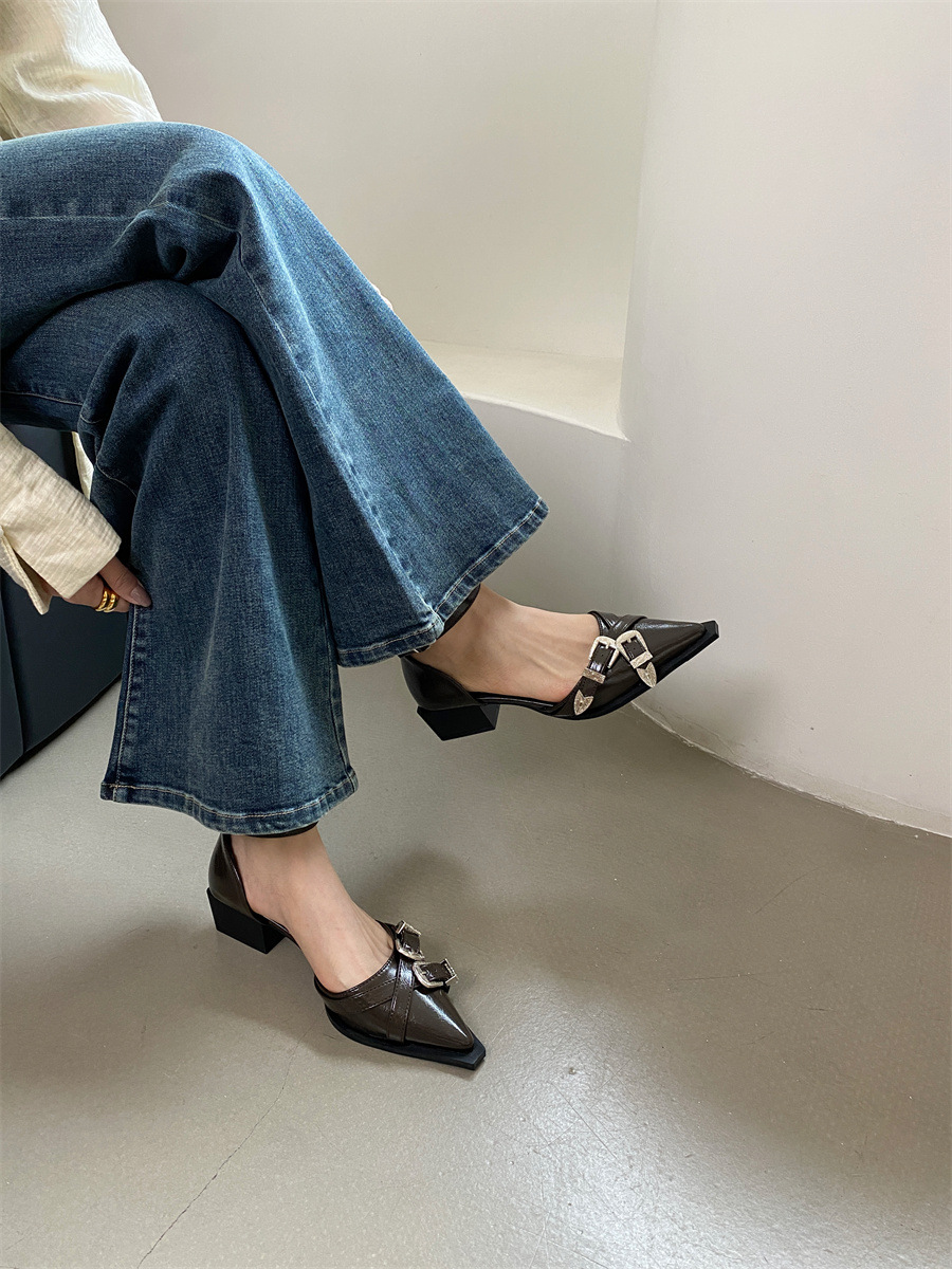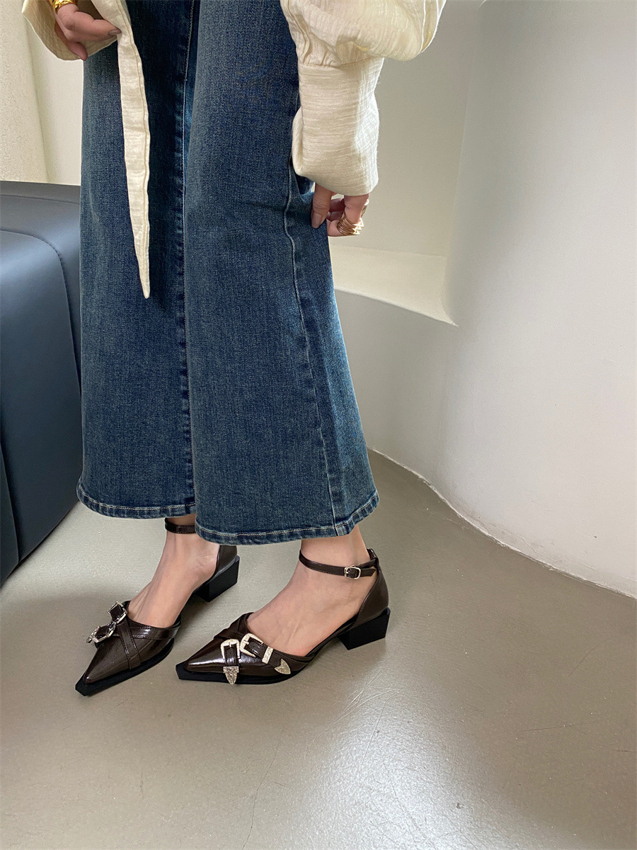 여성을위한 뾰족한 신발 2025 봄 새로운 디자인 틈새 메리 제인 두꺼운 굽 크로스 버클 패션 샌들스토어 가기