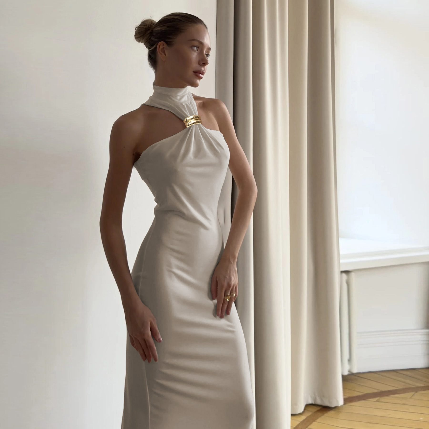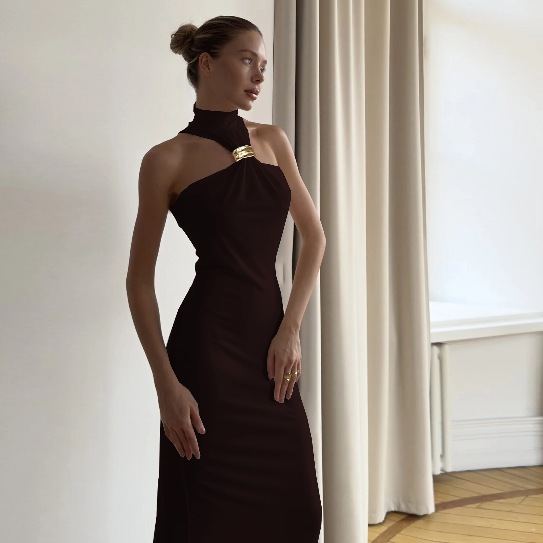 봄/여름 2025 아마존 AliExpress 독립 역 국경 간 폭발 여성 착용 금속 버클 슬림 적합 긴 원피스 여성