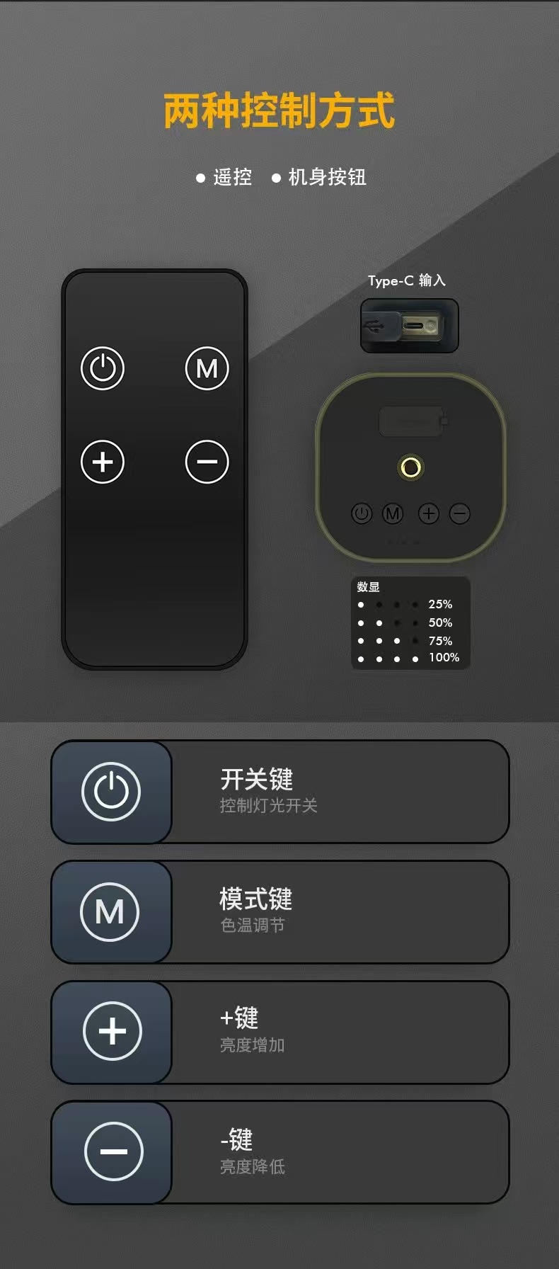 按钮控制指示: 按键控制:包含四个按键,分别是电源键、模式键、亮度增加、亮度降低