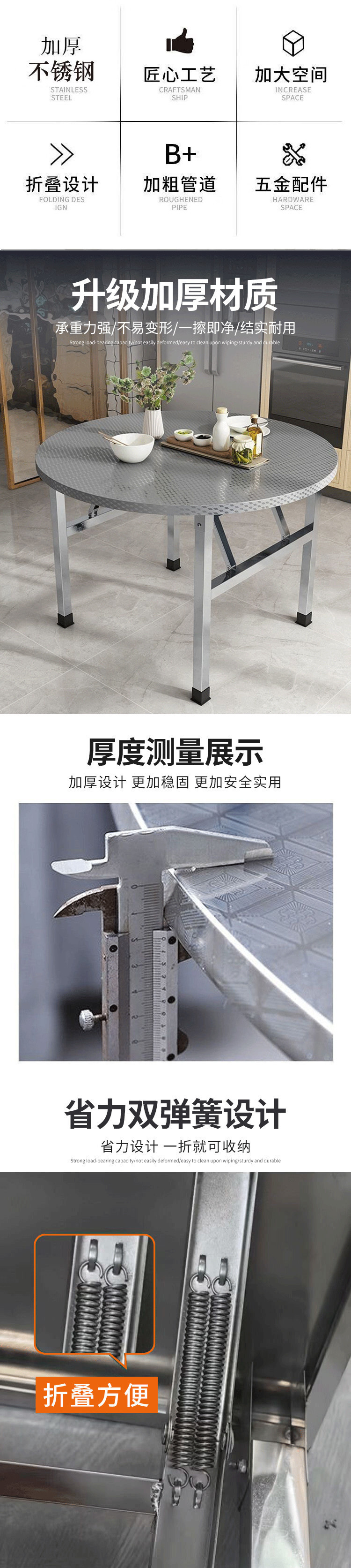 탁상용 가정용 식탁 라운드 테이블 바비큐 야시장 스톨 테이블 식탁 레스토랑 테이블이있는 두꺼운 스테인레스 스틸 접이식 테이블