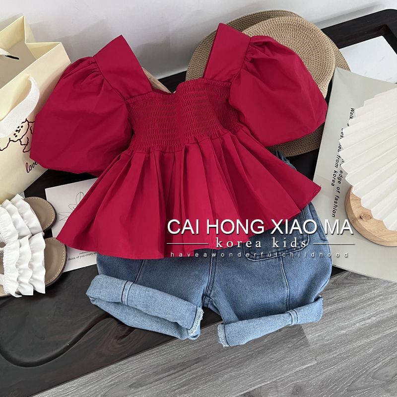 [1만명의 호평] 여아 여름 정장 반팔 패션 퍼프 슬리브 셔츠 아동 투피스 청바지스토어 가기