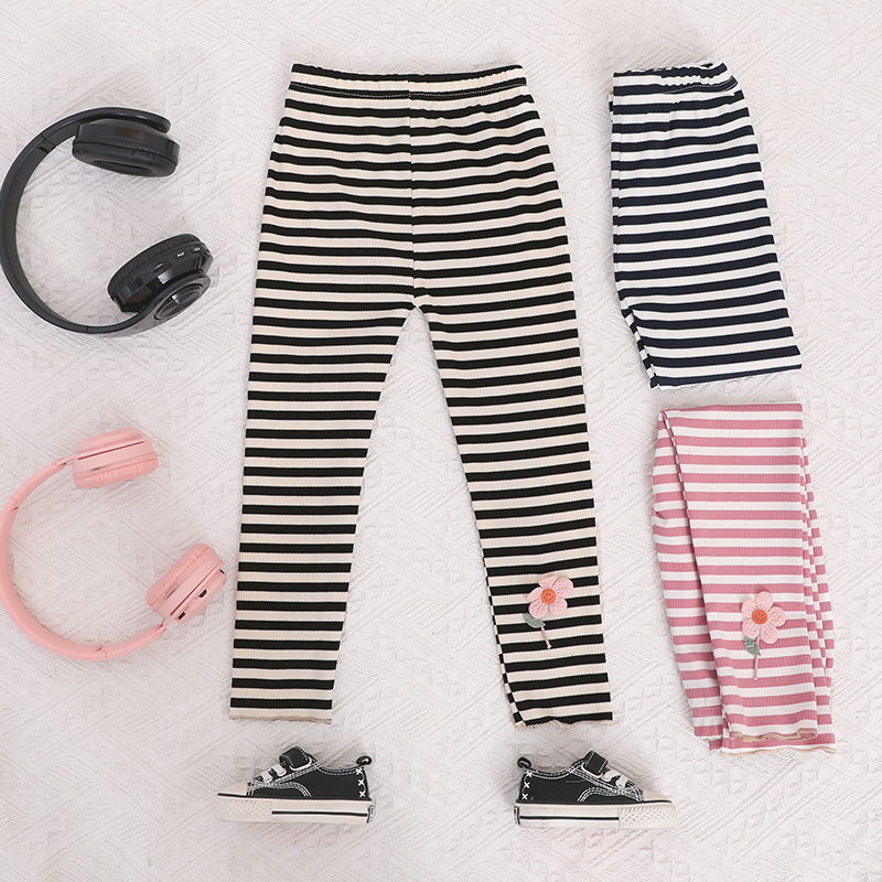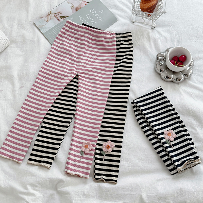 여아 레깅스, 봄, 가을 아우터 스트라이프 플라워 캐주얼 팬츠, 아동 슬림핏 9부 팬츠, 고탄성 아동 팬츠스토어 가기