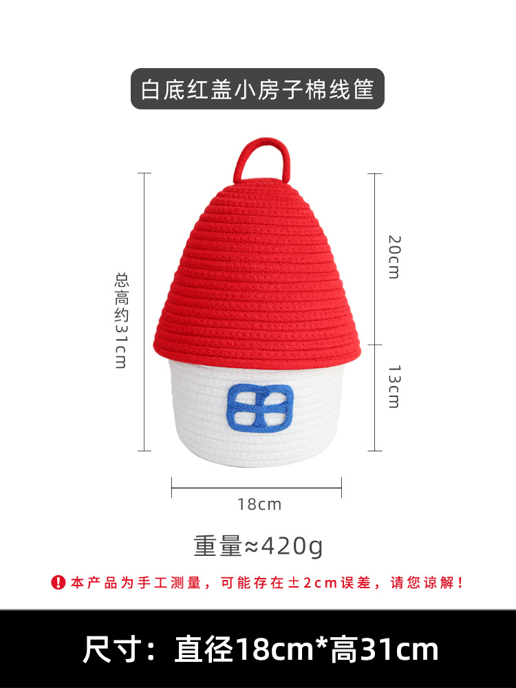 • 흰색 배경에 빨간색 뚜껑이 있는 작은 집 면실 바구니
