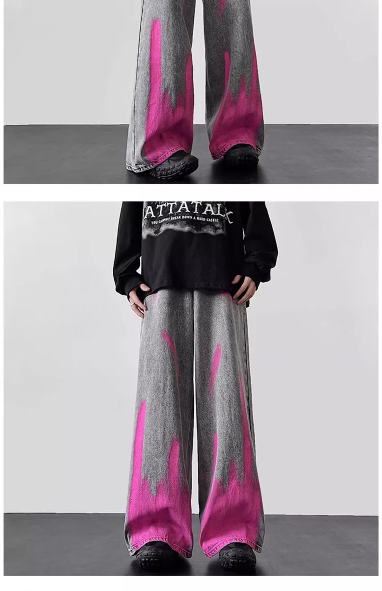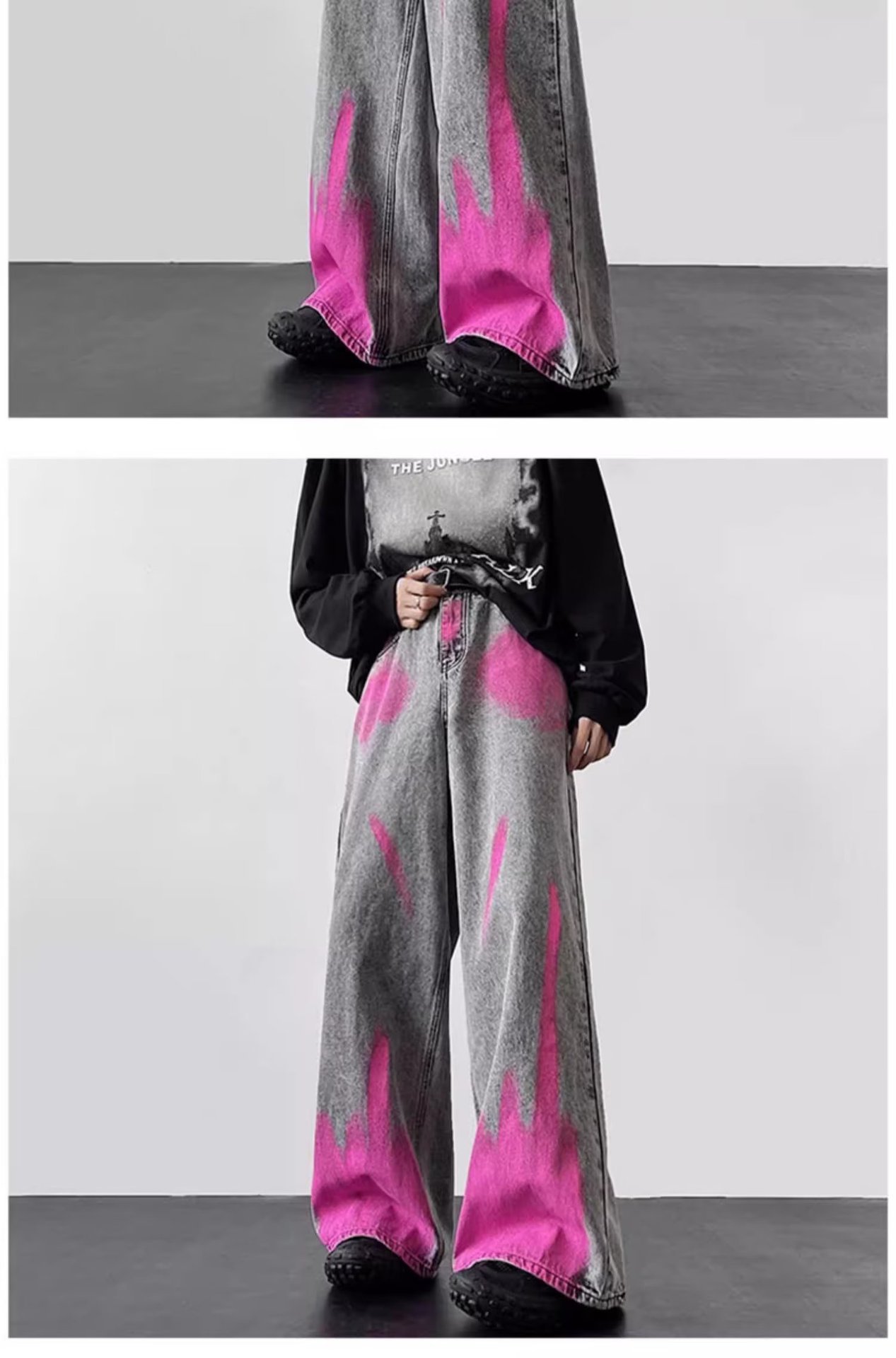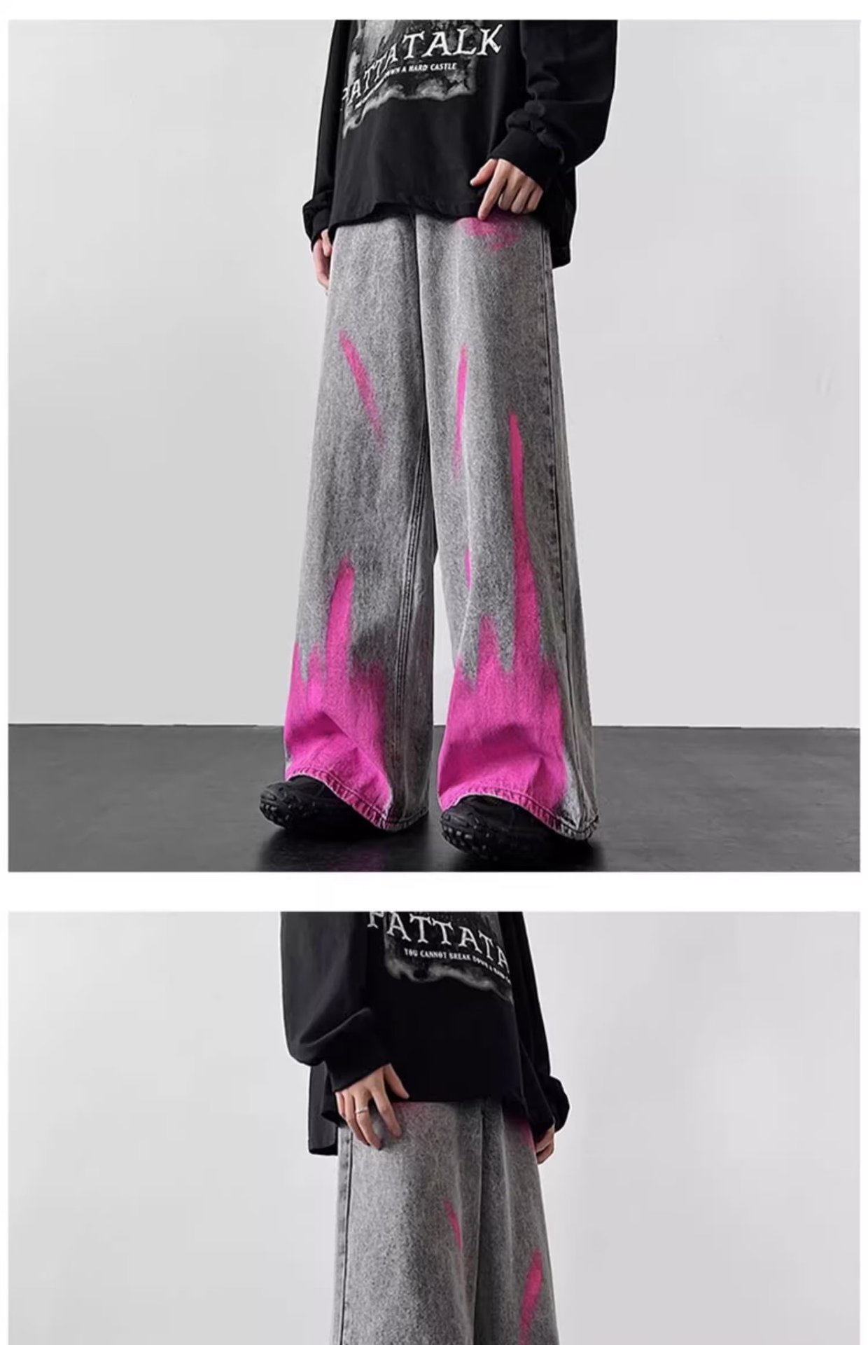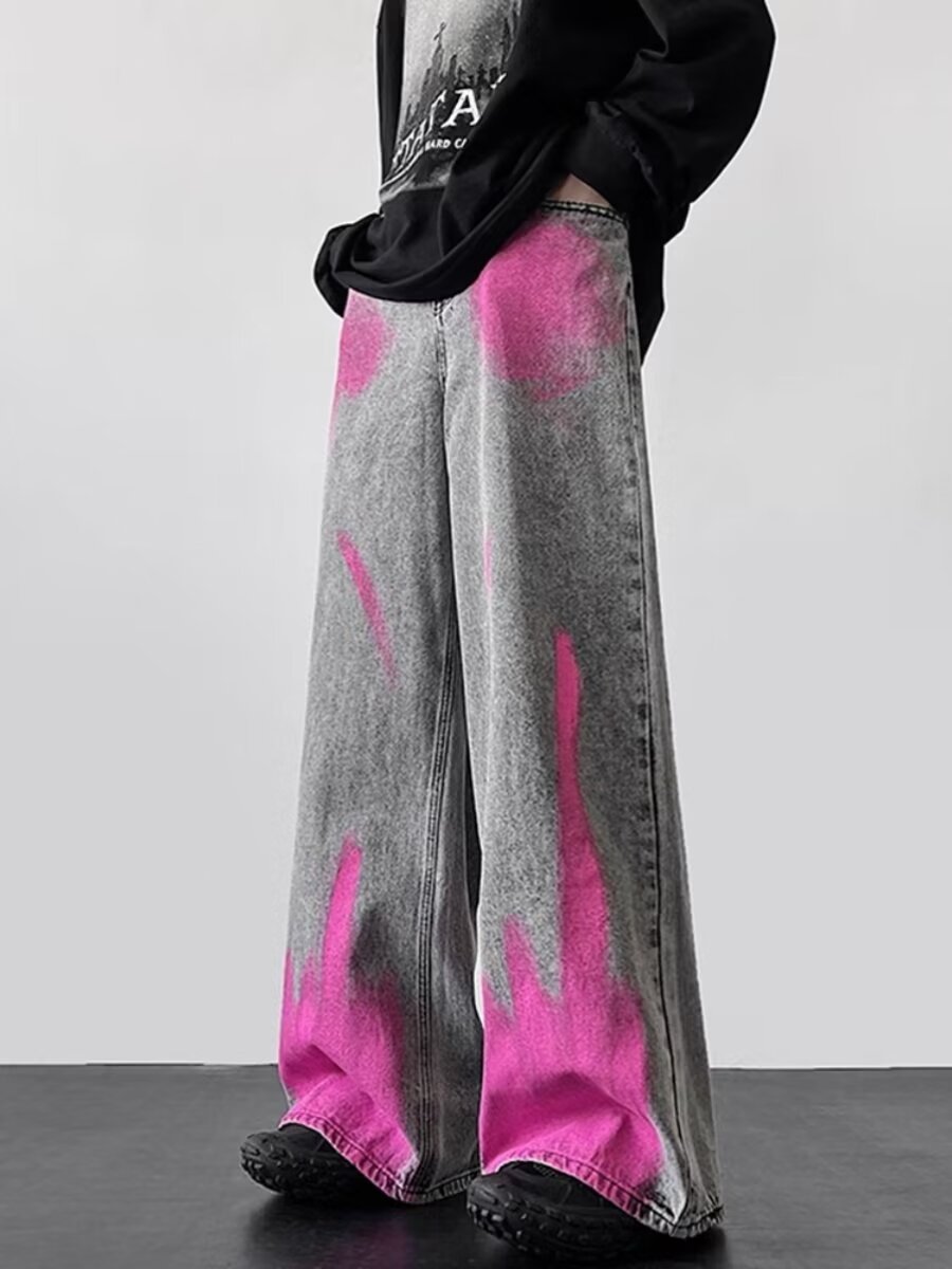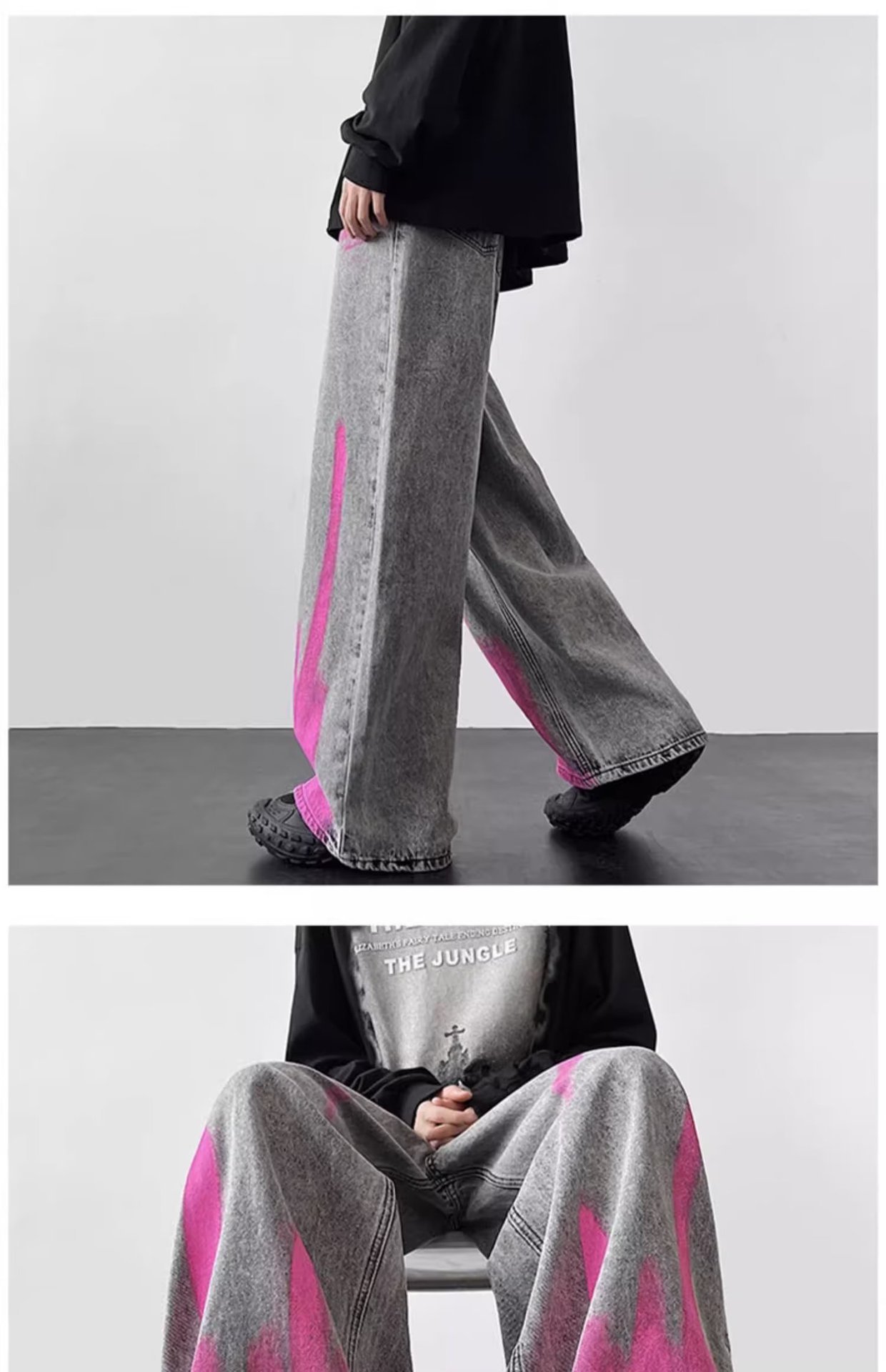 2024 아메리칸 스타일 하이 스트리트 핑크 그레이 손으로 그린 낙서 청바지 남성용 트렌디 브랜드 스트레이트 루즈 와이드 레그 롱 팬츠