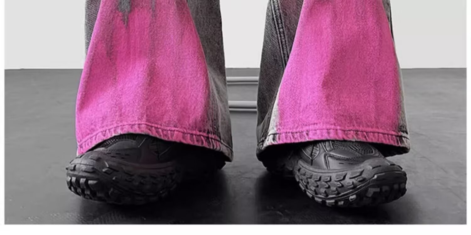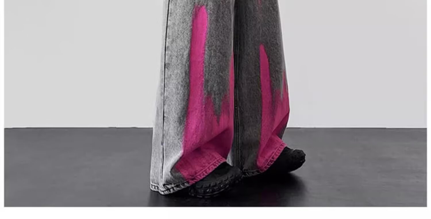 2024 아메리칸 스타일 하이 스트리트 핑크 그레이 손으로 그린 낙서 청바지 남성용 트렌디 브랜드 스트레이트 루즈 와이드 레그 롱 팬츠스토어 가기