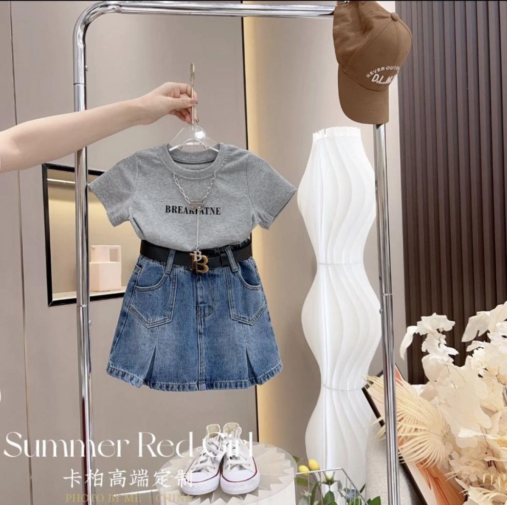 • 그레이 티셔츠와 데님 스커트 슈트