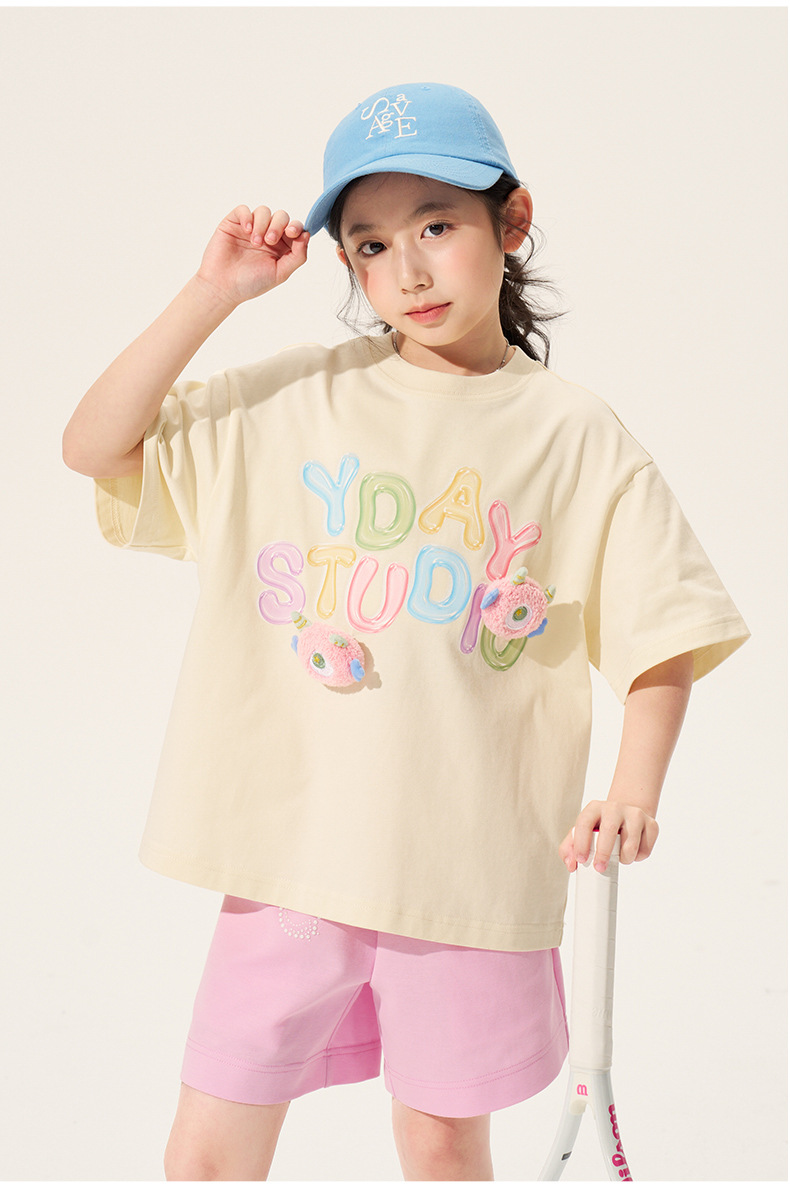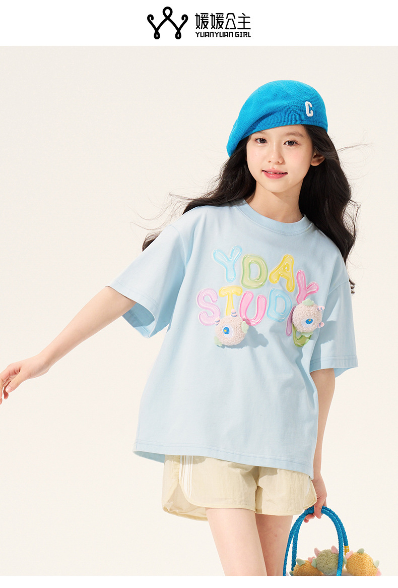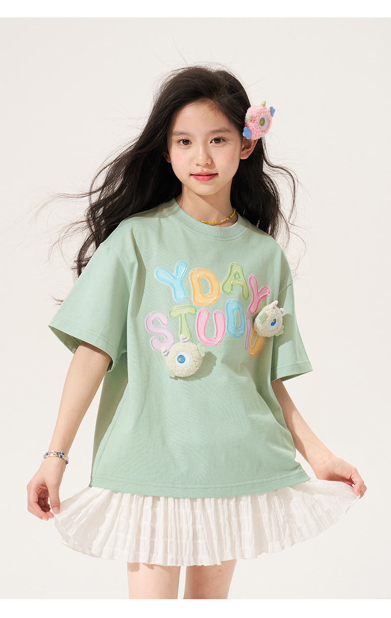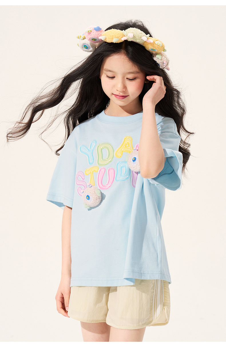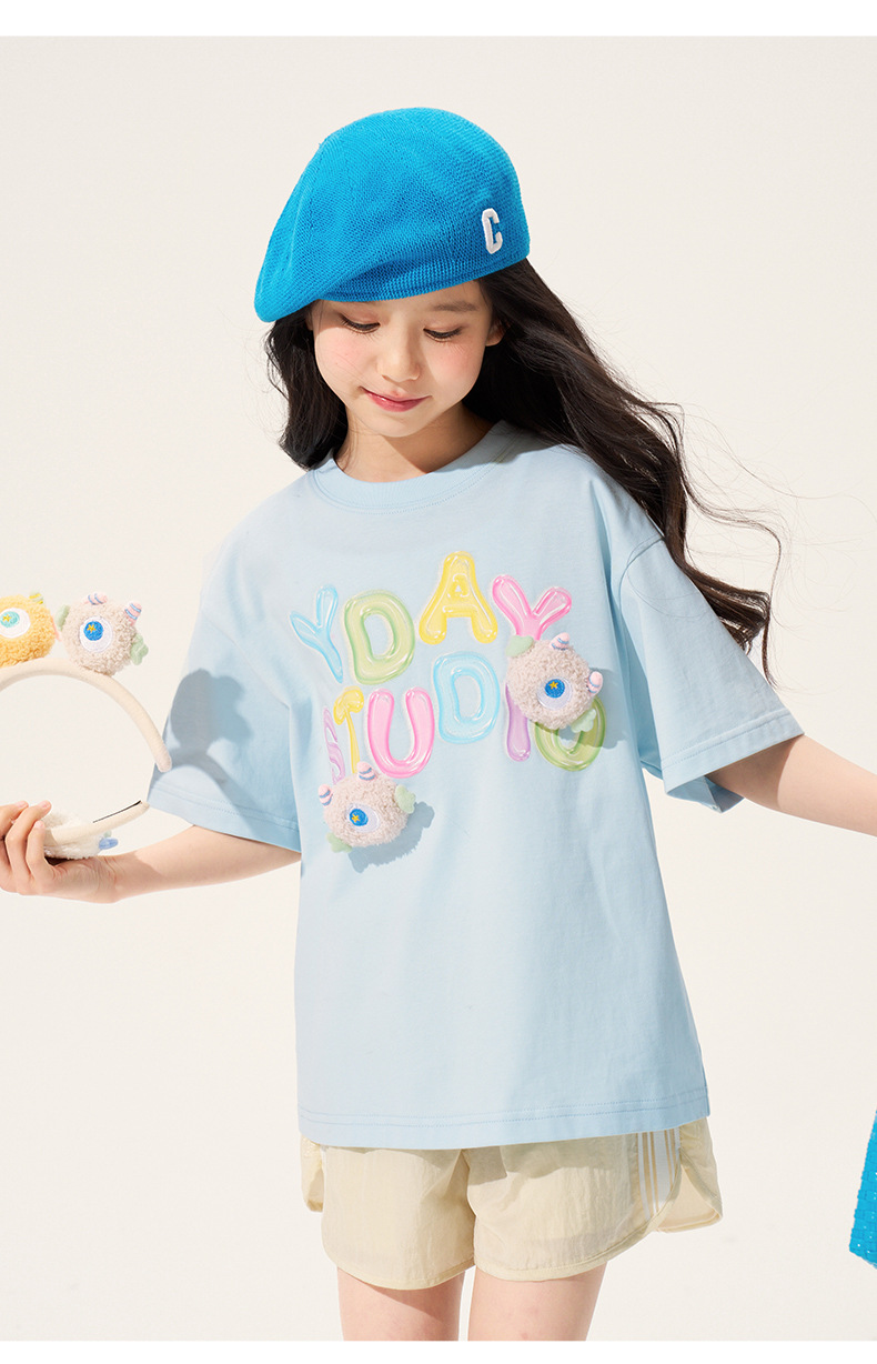 100% 면 여아 반팔 티셔츠 2026 아동 여름 신상 입체 인형 상의 반팔 만화 티셔츠 아동복스토어 가기