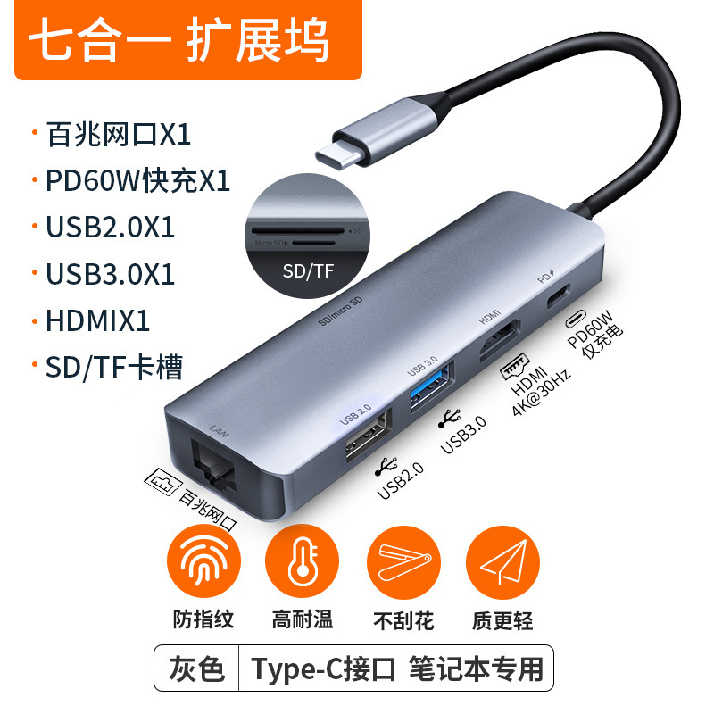 • [7-in-1] Type-C 100M 네트워크 포트+HDMI+USB*2+SD/TF 카드+PD 고속 충전